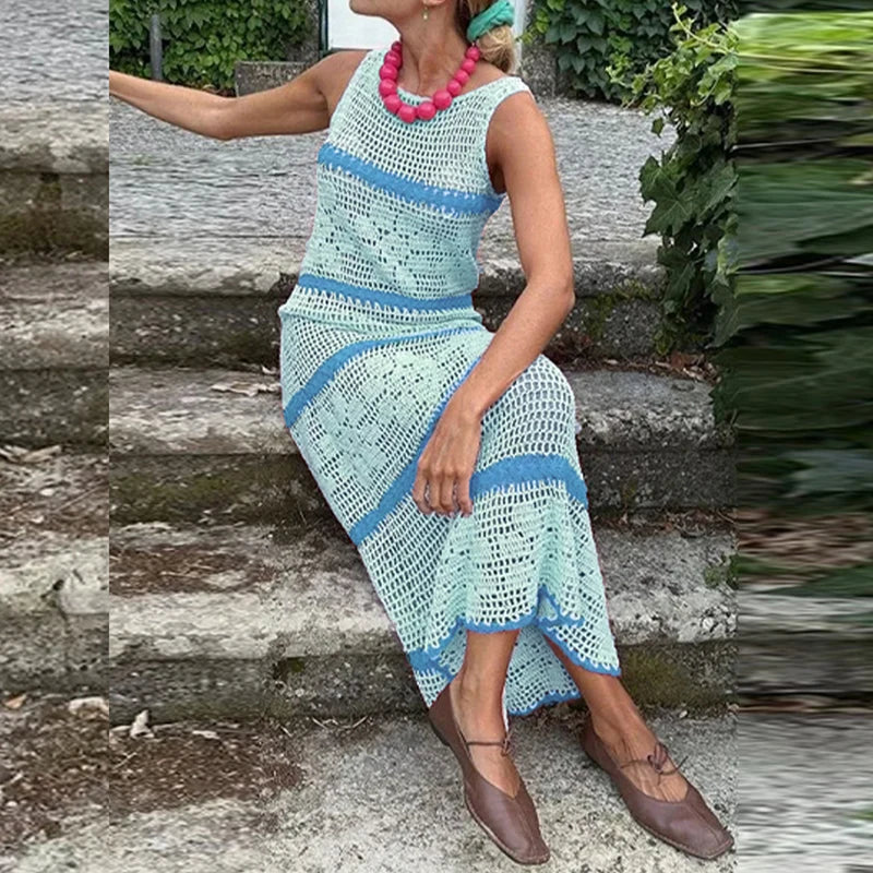MQTIME  -  Casual Stripe O-neck Knit Elastic Bodycon Dress Sexy Beach Vacation Crochet Women Dresses New Slim Vestidos Patchwork Long Dress