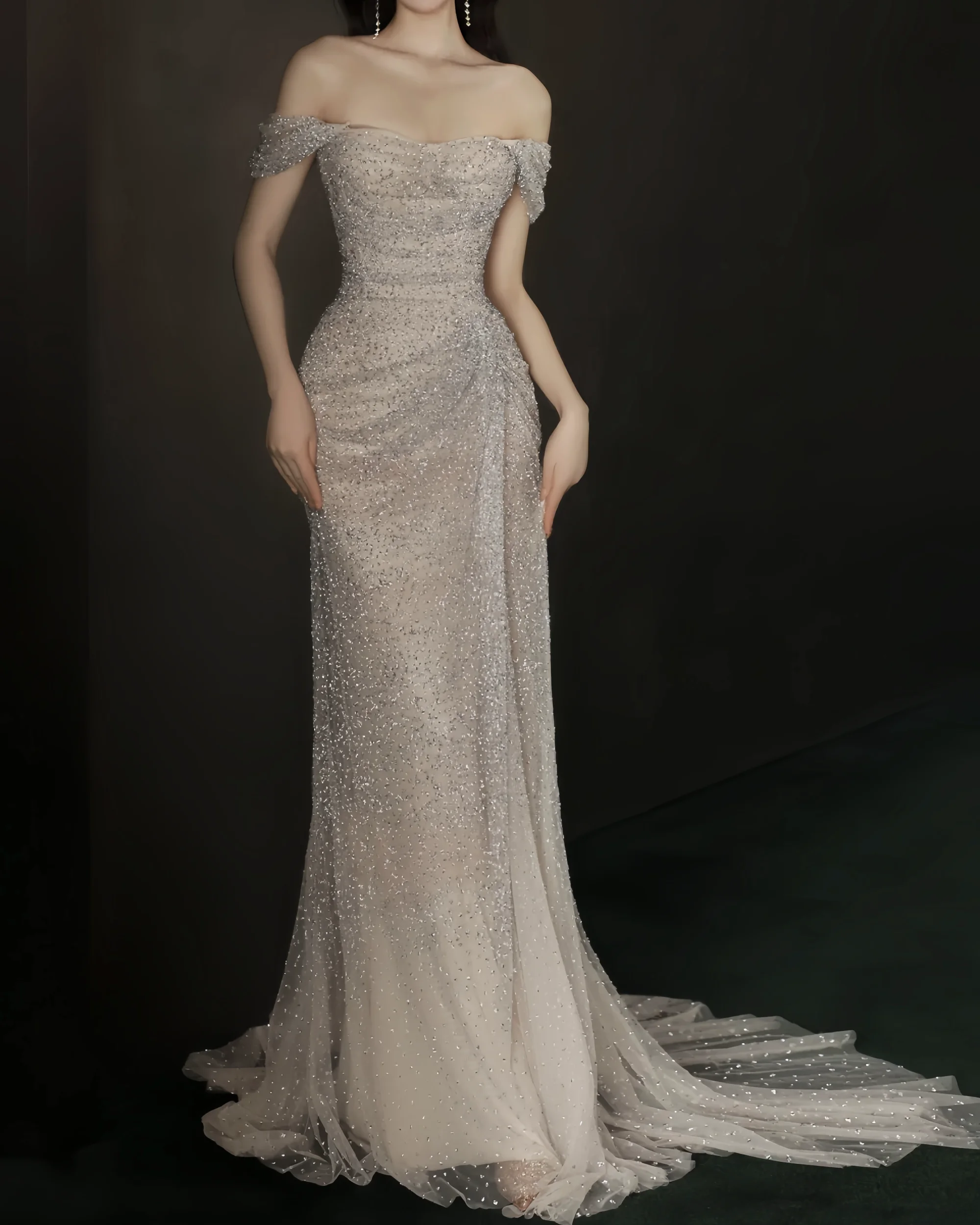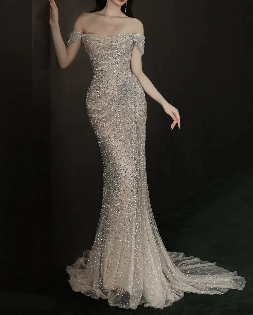 MQTIME - Champagne Sequin Evening Dress Off Shoulder Floor Length Temperament Tassels Luxury Fishtail Formal Mermaid Wedding Prom Gown