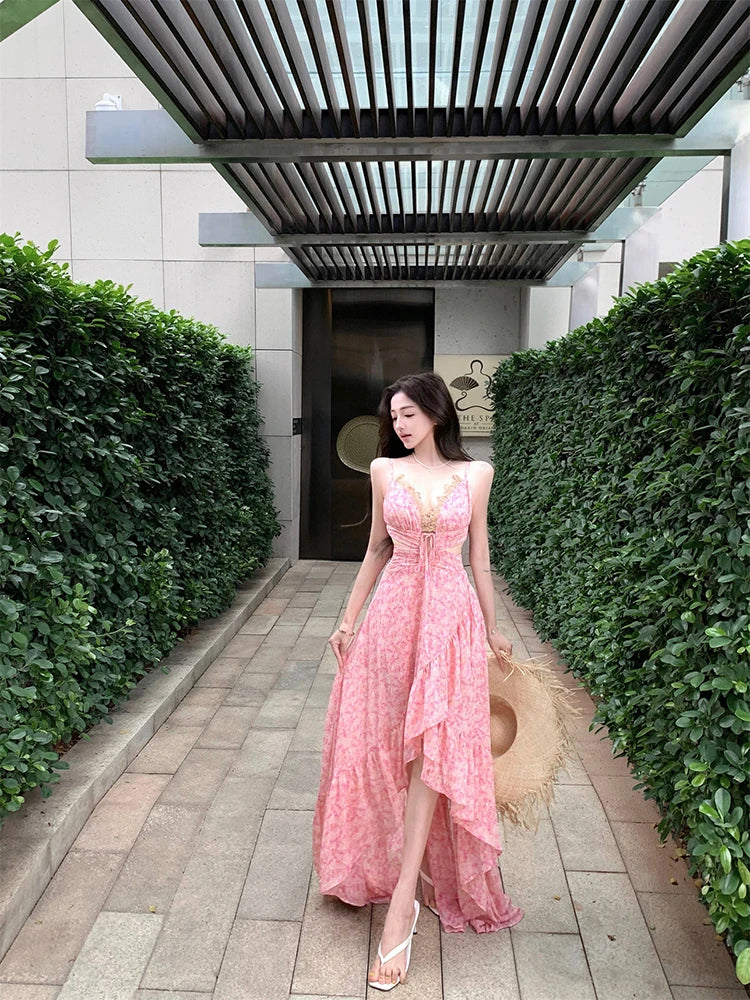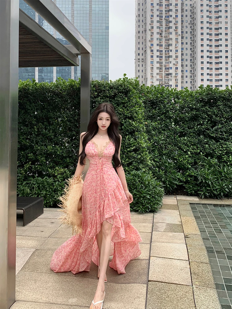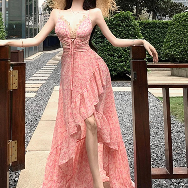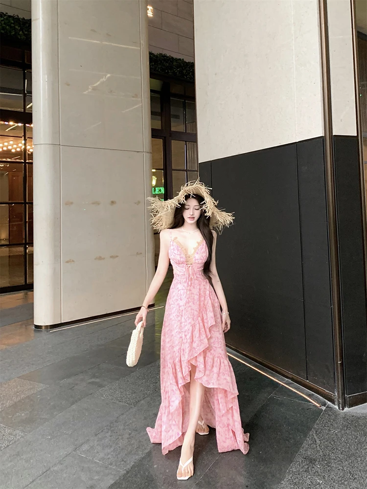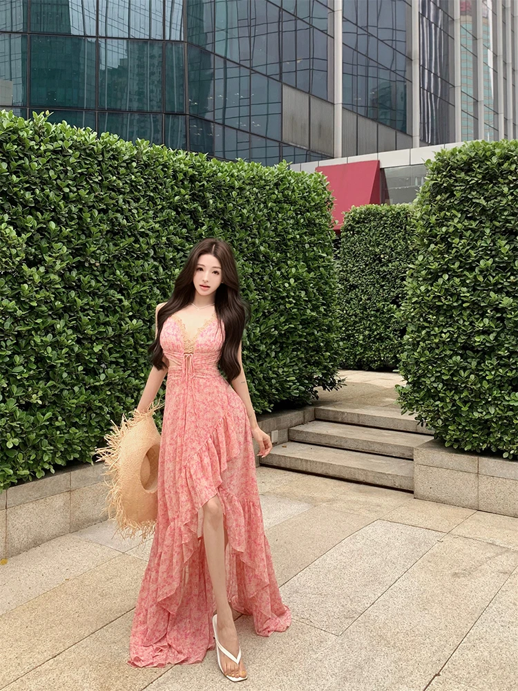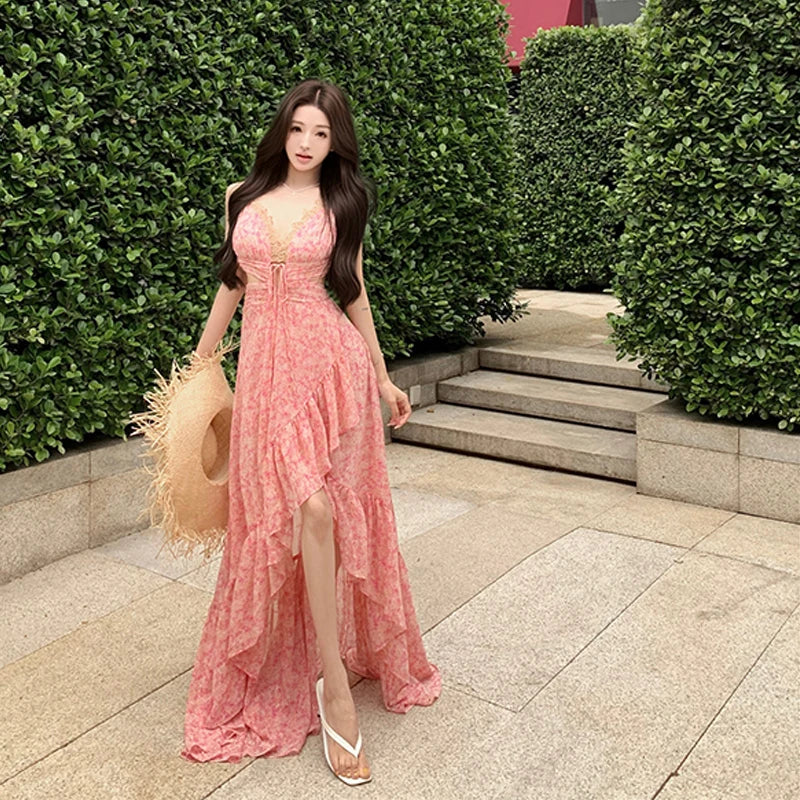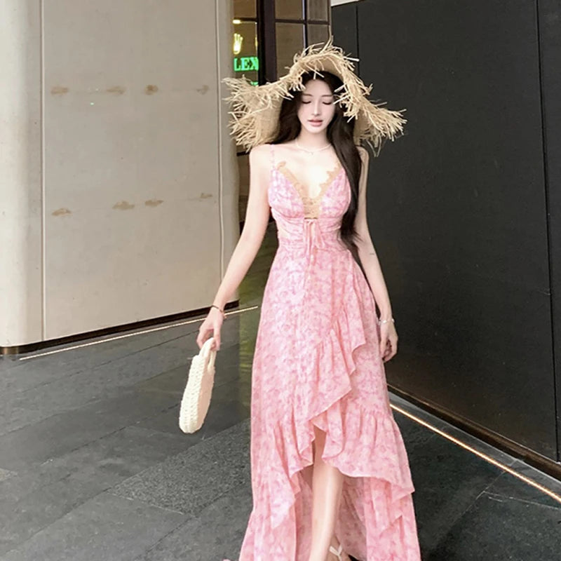 MQTIME - Chic Backless Maxi Dresses Women Print Sexy V Neck Suspender Irregular Ruffles Vestidos Beach Vacation Elegant Dresses