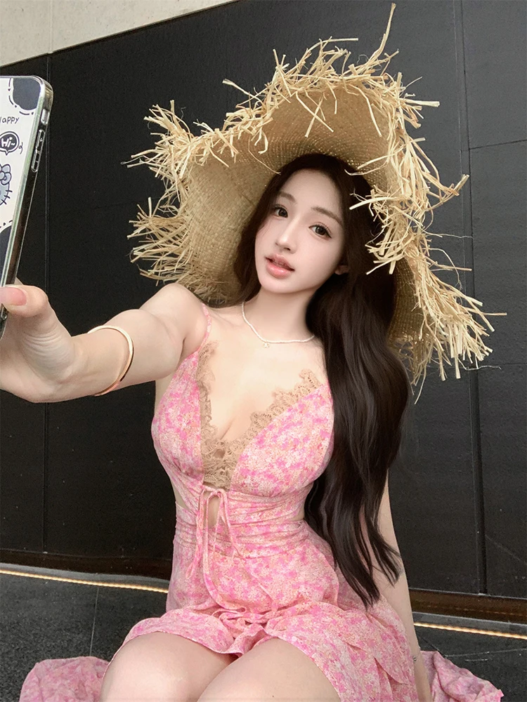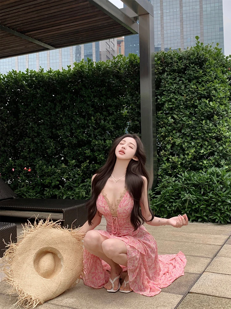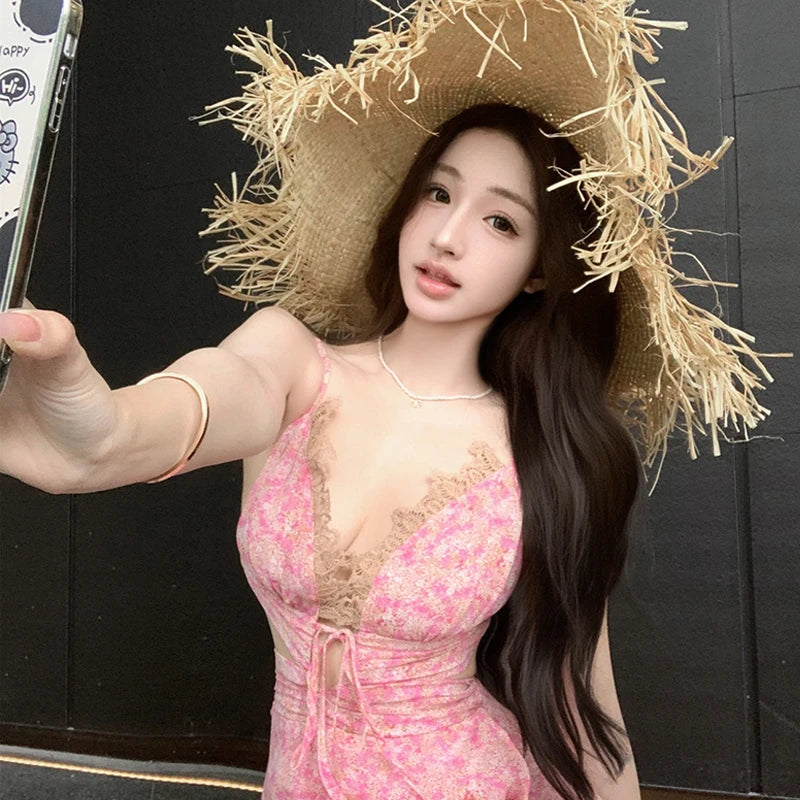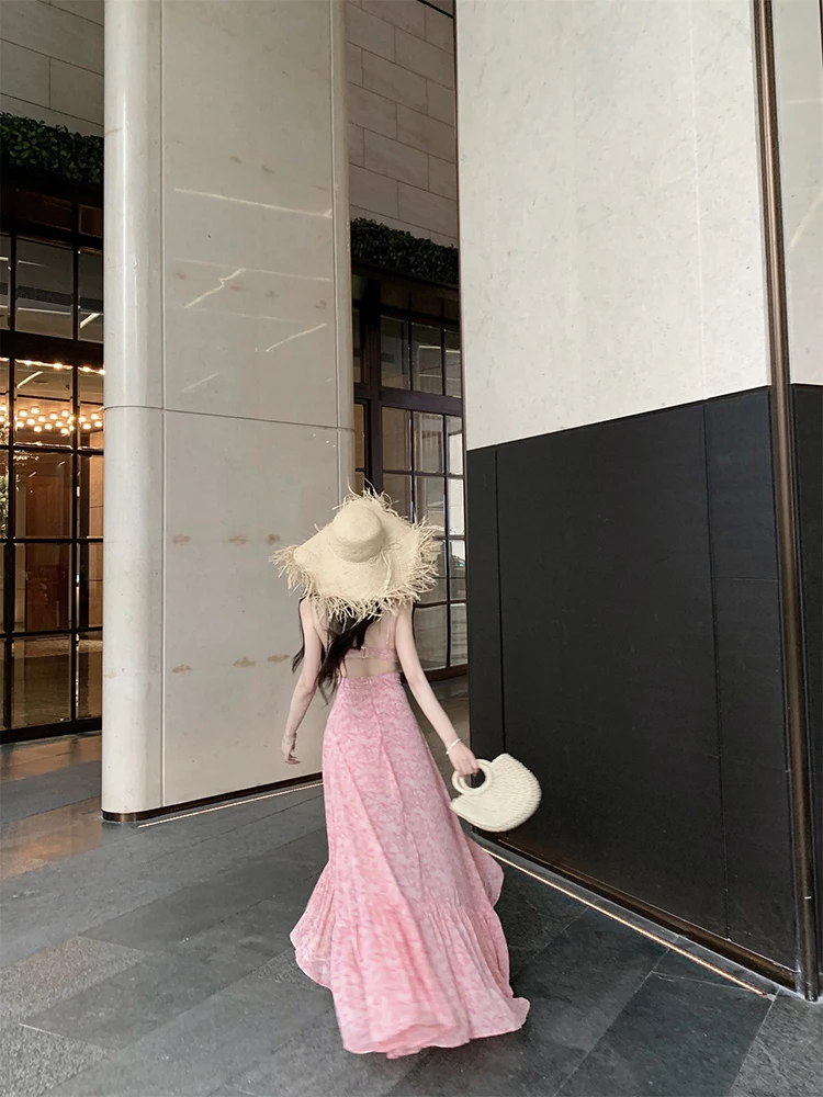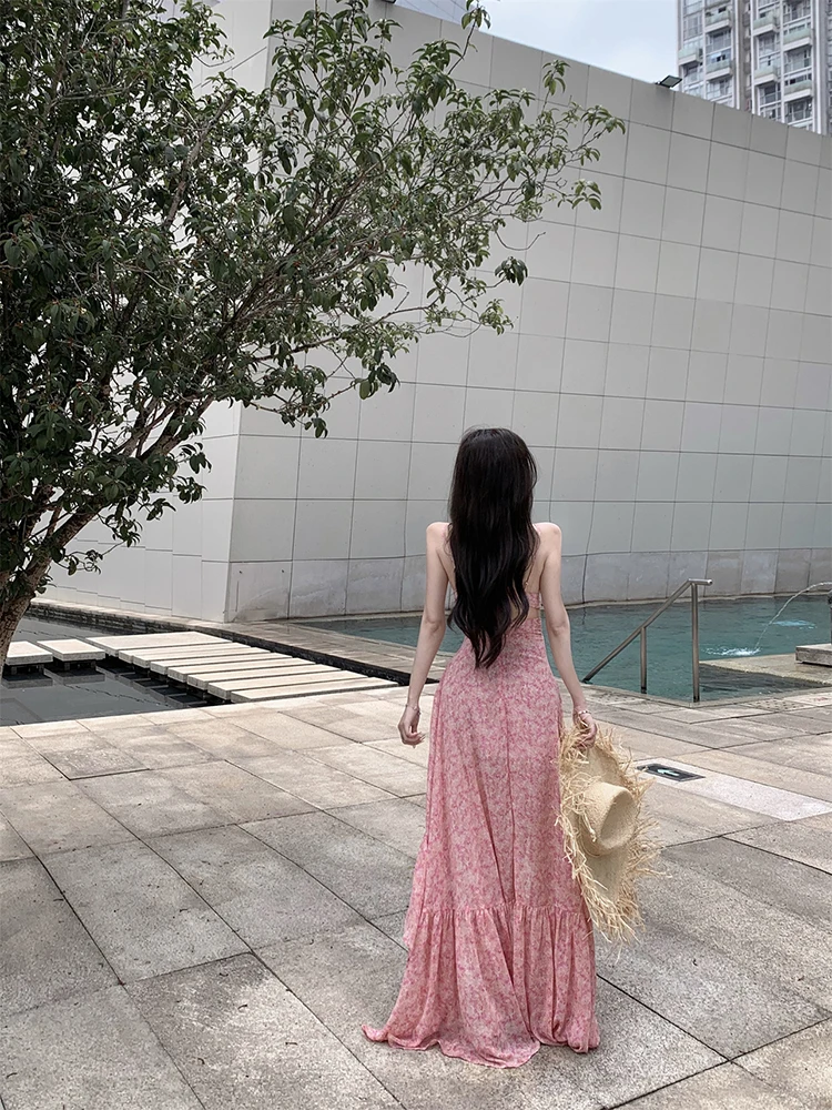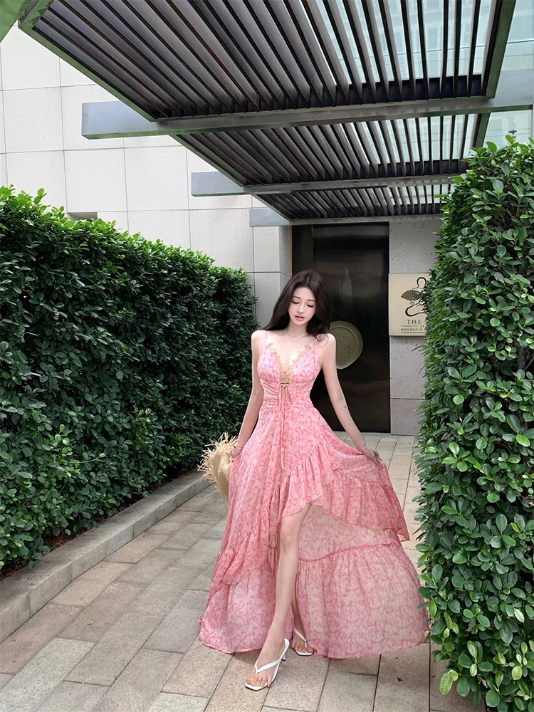 MQTIME - Chic Backless Maxi Dresses Women Print Sexy V Neck Suspender Irregular Ruffles Vestidos Beach Vacation Elegant Dresses