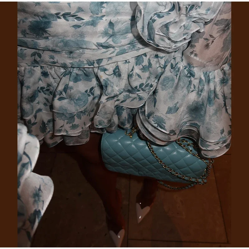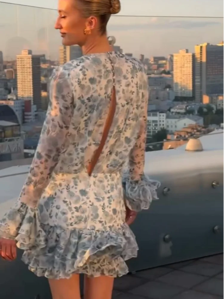 MQTIME - Chic Pleated Ruffled Hem Print Dress Women Long Flare Sleeve V-neck Hollow Out Irregular Mini Dresses 2025 Autumn Party Vestidos