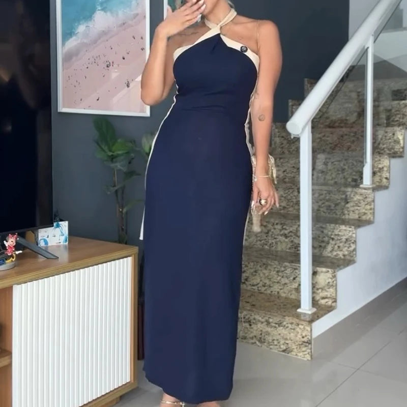 MQTIME - Color Blocking Lady Halter Slim A-line Dress Casual Streetwear Side Split Long Dress New Summer Hollow Out Backless Party Dress