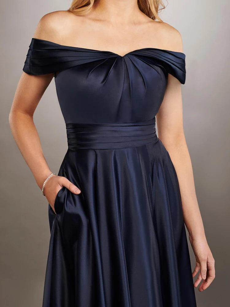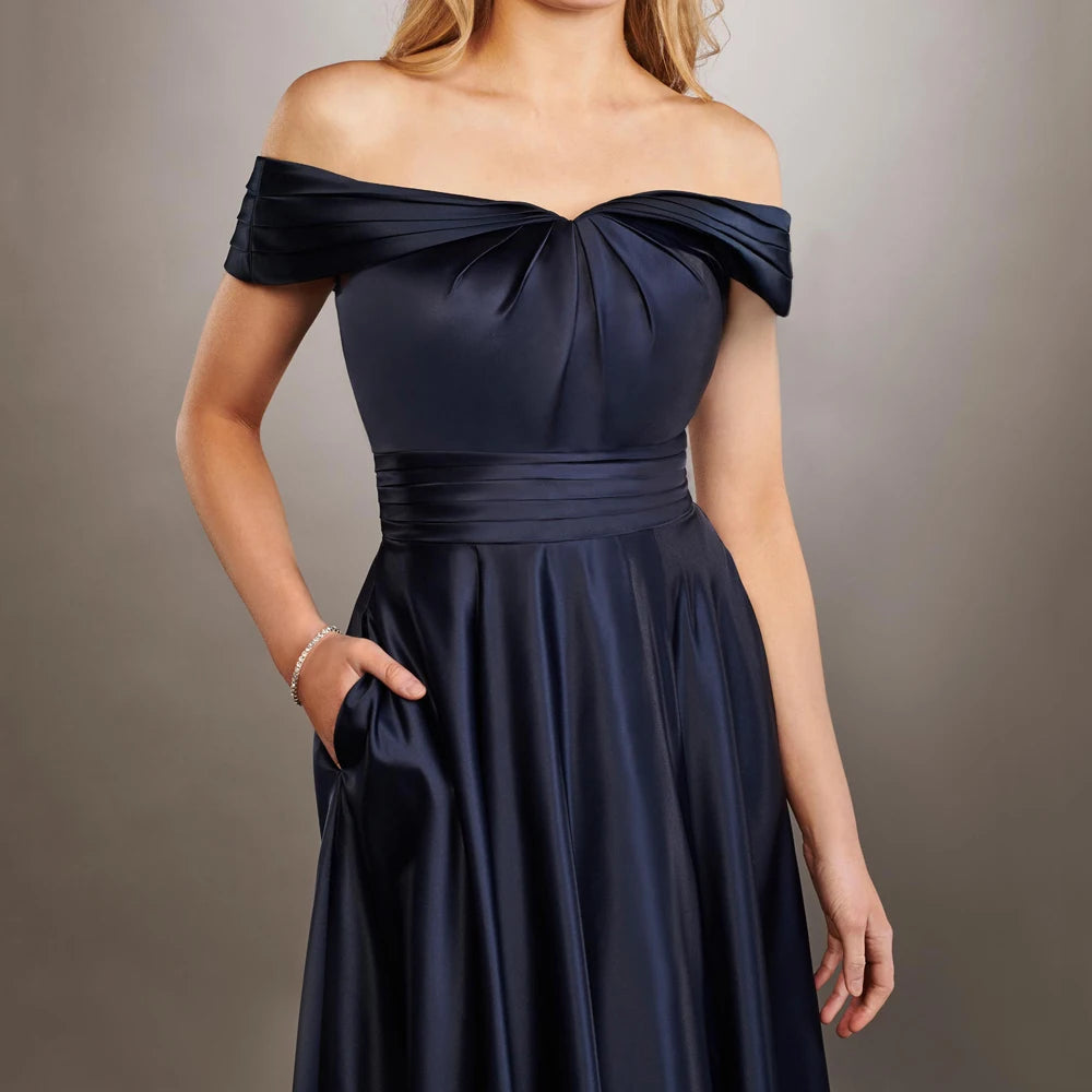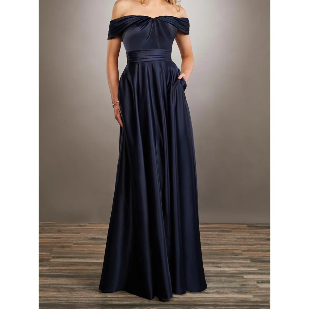 MQTIME - Dark Navy Bridesmaid Dress Satin Strapless Zipper Back Floor Length Wedding Party Gowns with Side Pockets