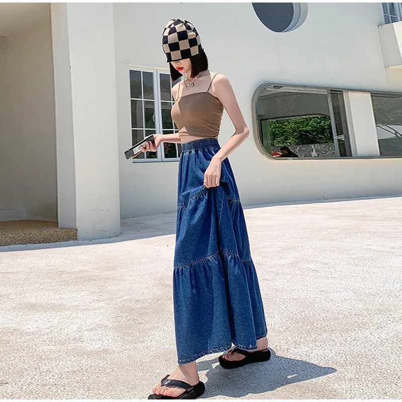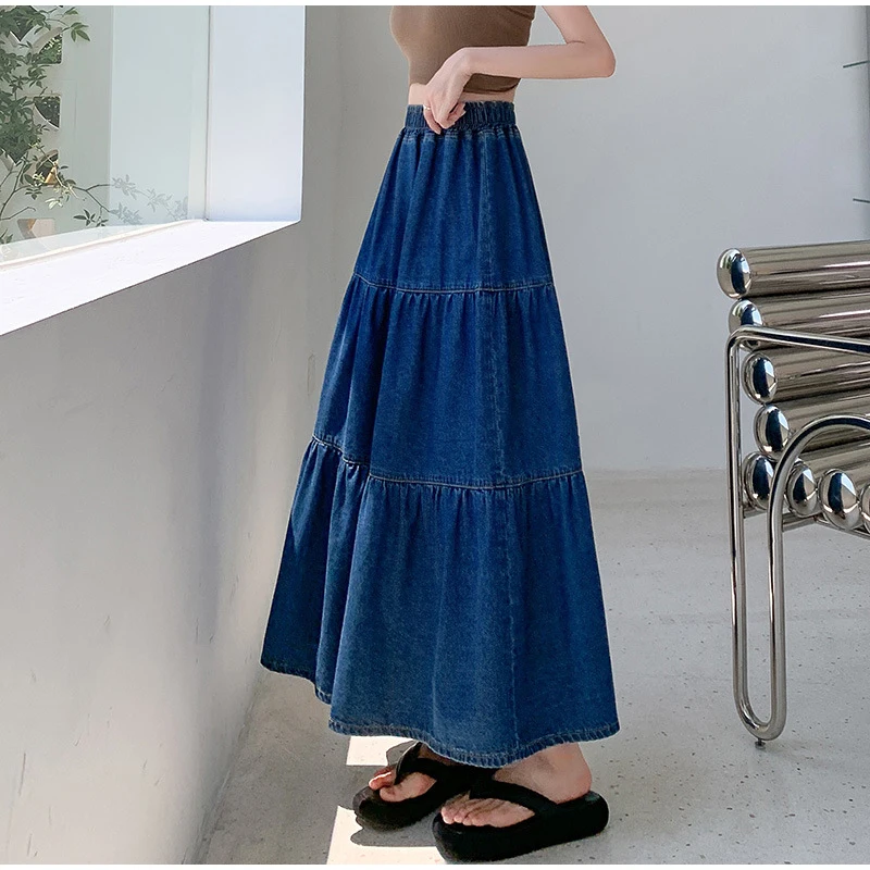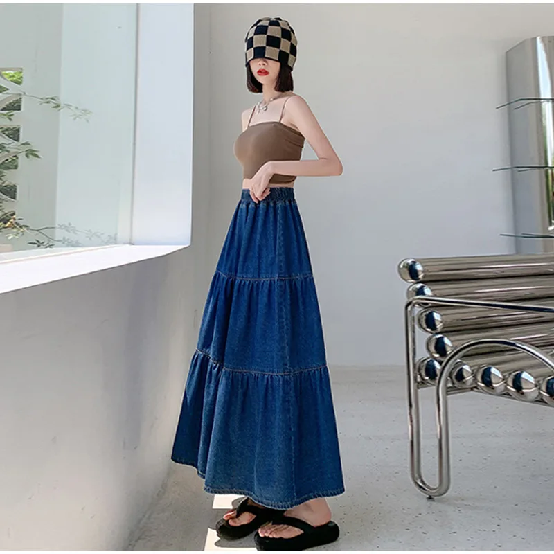 MQTIME - Denim Long Skirt Half Cake Umbrella Skirts For Woman Mid-length Elastic High Waist Dress Korean Fashion Y2k Clothing 2025
