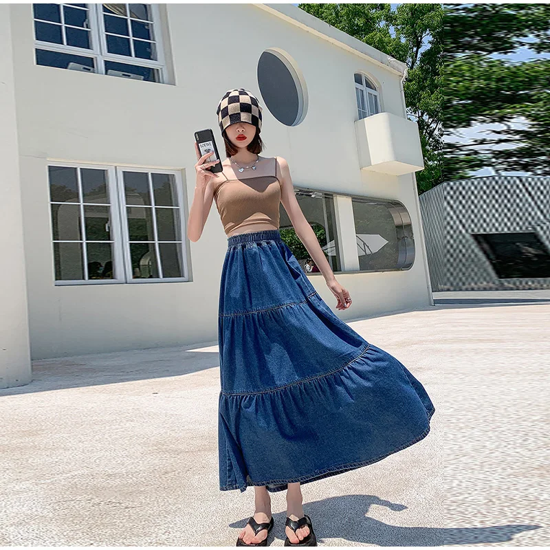MQTIME  -  Denim Long Skirt Half Cake Umbrella Skirts For Woman Mid-length Elastic High Waist Dress Korean Fashion Y2k Clothing 2025