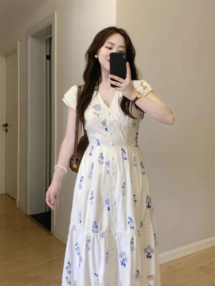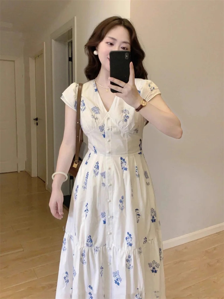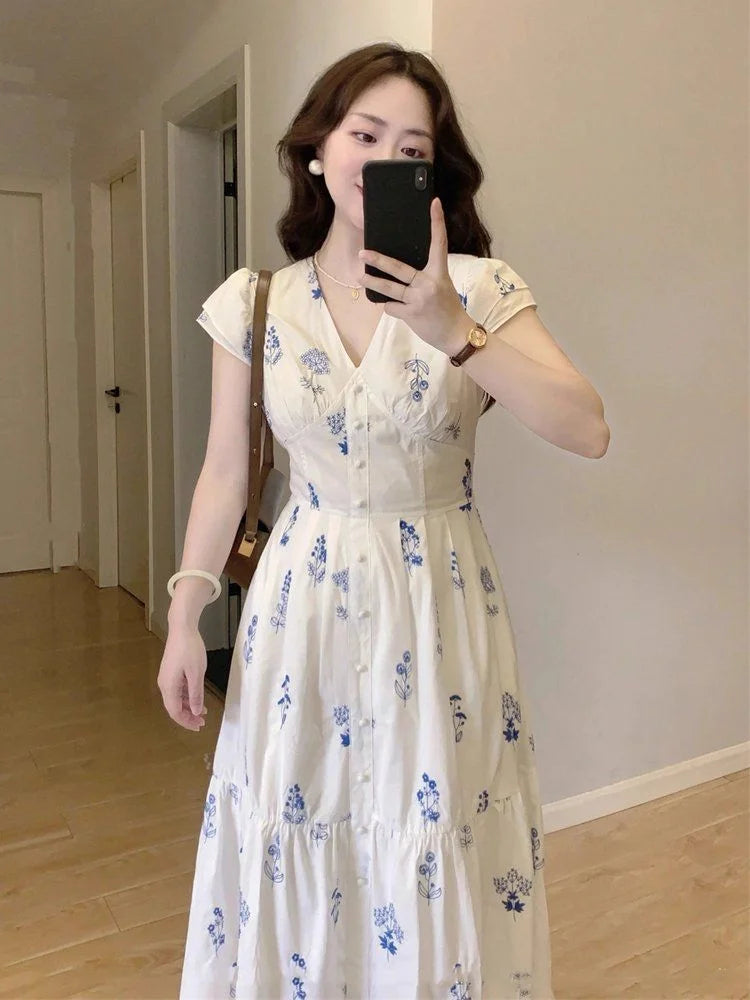 MQTIME - Dresses Women Sweet Floral Printed V Neck Short Sleeve Summer Fashion Elegant Dress Female Casual Temperament Chic