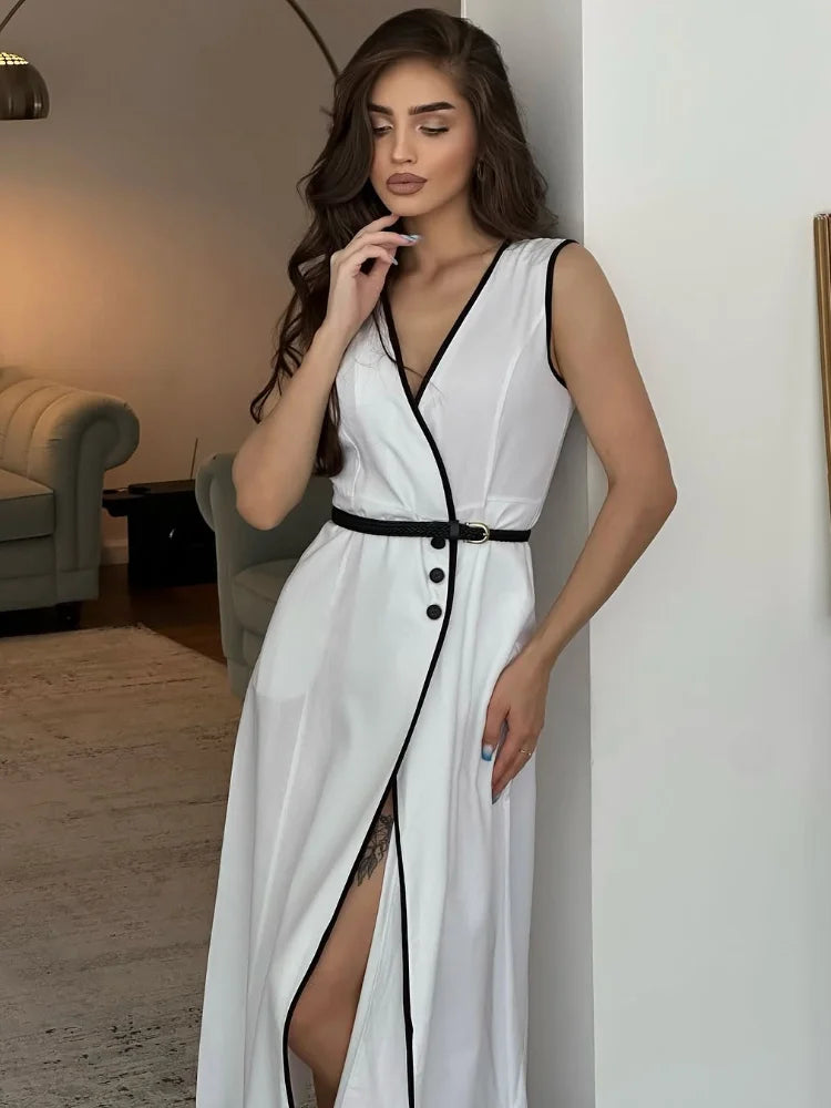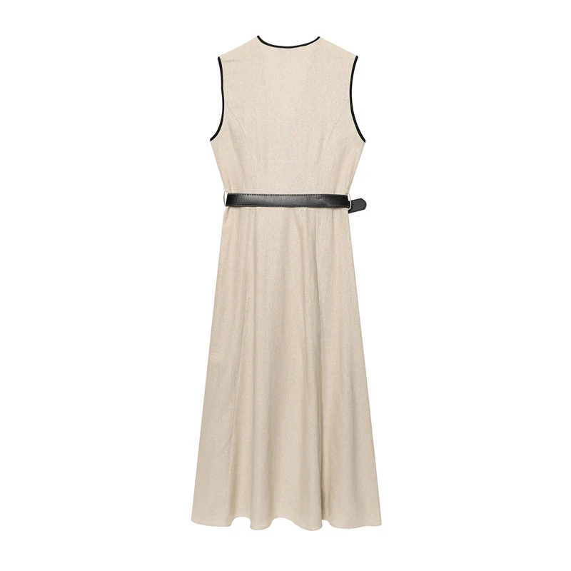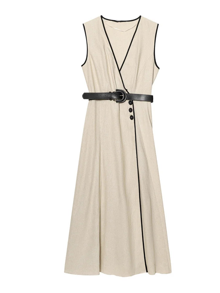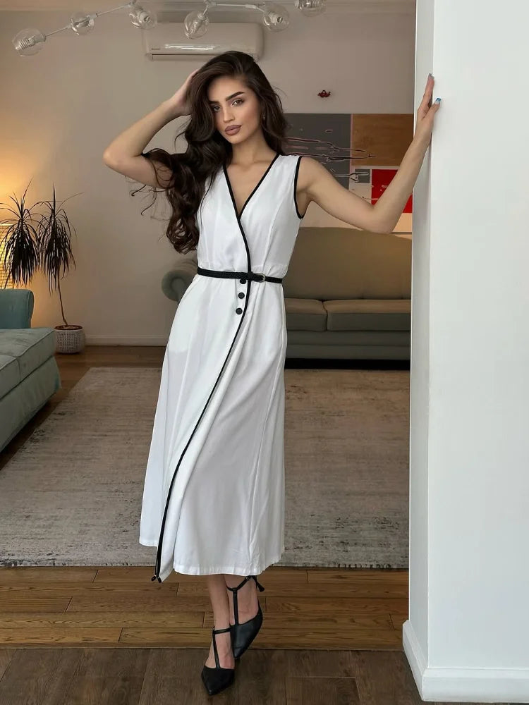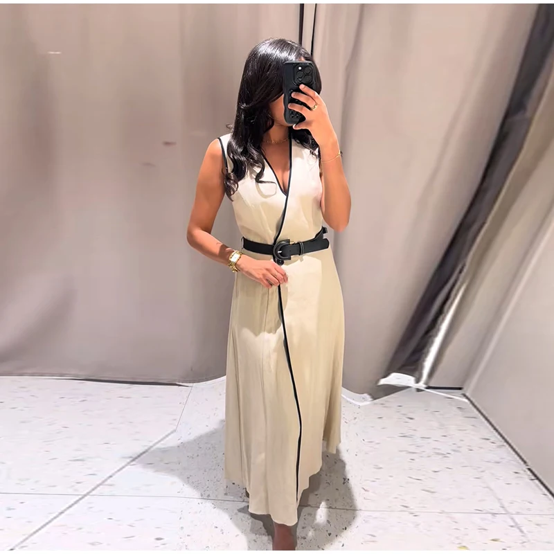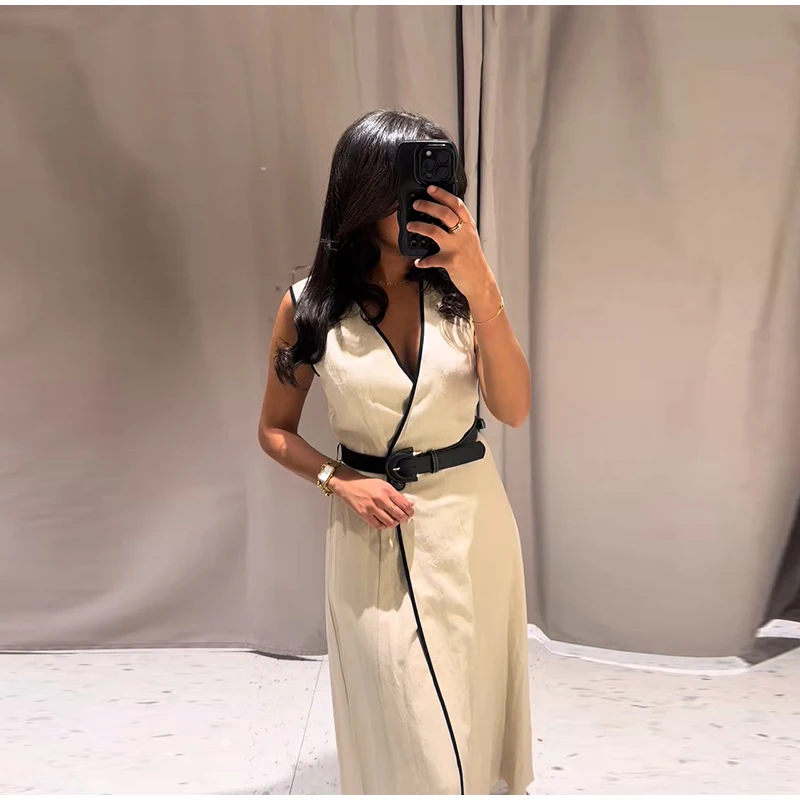 MQTIME - Elegant Cotton Sling Dresses Women Fashionable V-neck Sleeveless High Waist Slim Fit Long Dress Female Summer Holiday Robe