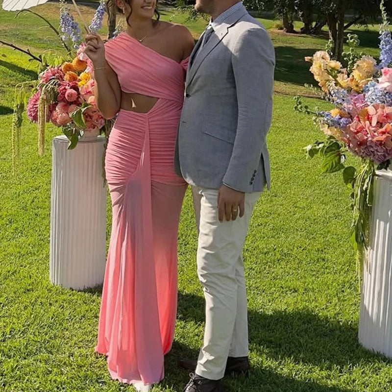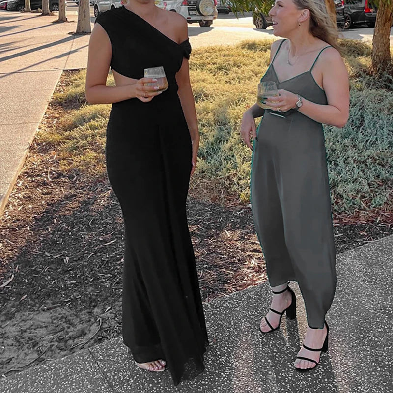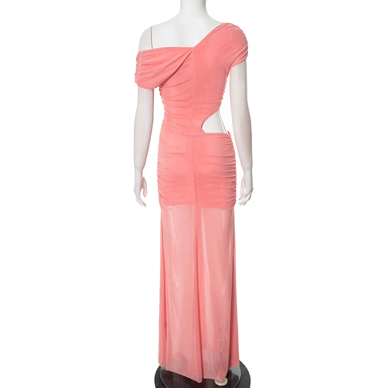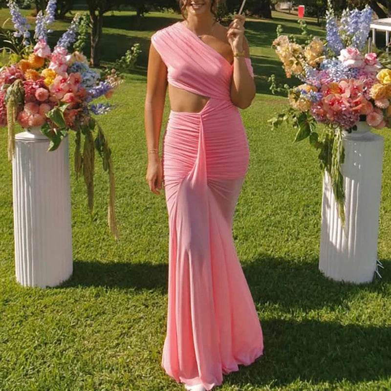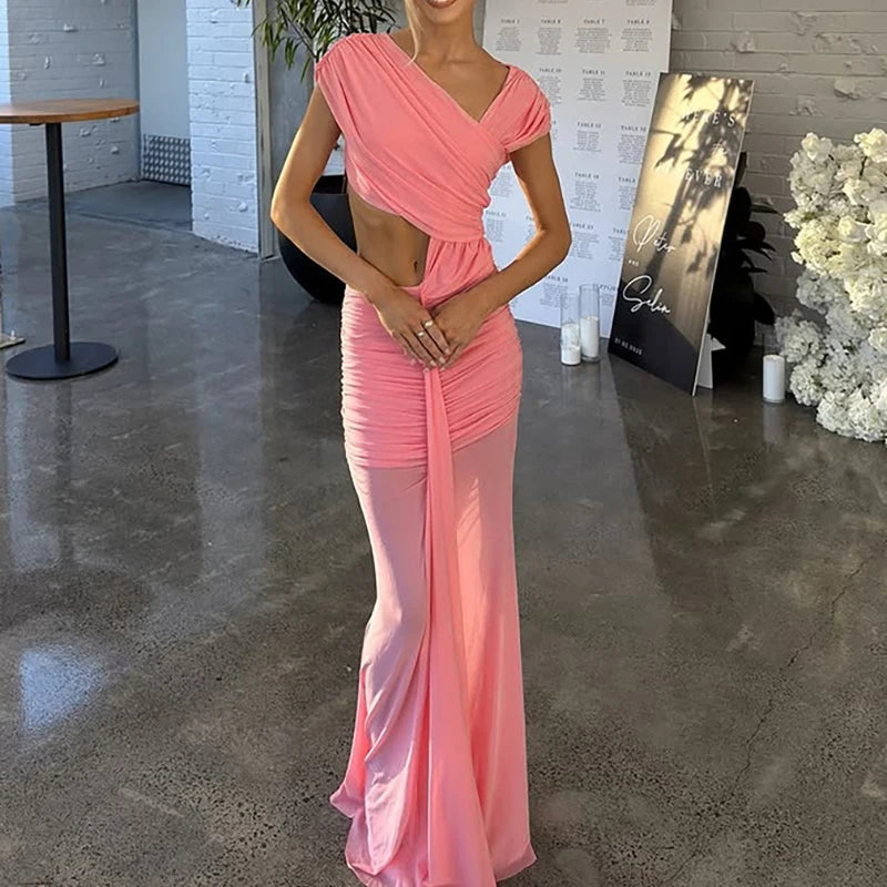 MQTIME - Elegant Hollow Out Irregular Evening Dress Women Sexy Slant Collar Slim Long Dress Fashion Hight Waist Solid Color Party Dresses