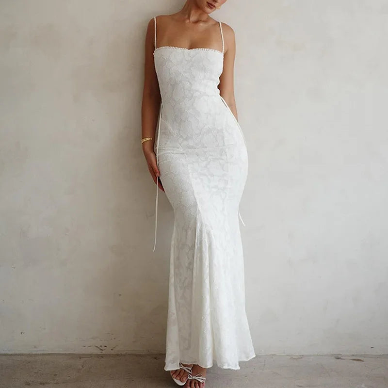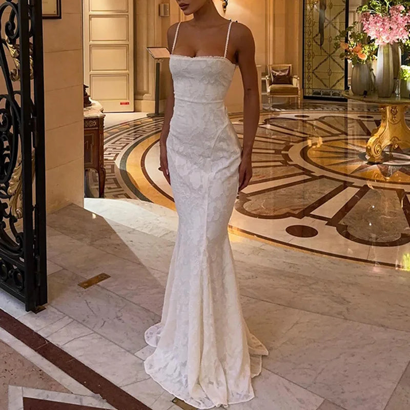 MQTIME - Elegant Lace Embroidery Hollow Long Dress Women Sexy Off Shoulder Solid Mermaid Dress Fashion Temperament Slim Suspender Dresses