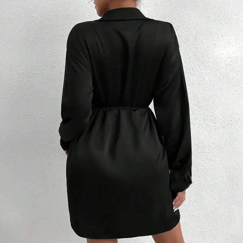 MQTIME  -  Elegant Lapel Collar Long Sleeve Mini Dress Fashion Hight Waist Button Satin Shirt Dress Casual Long Sleeve Solid Women's Dress
