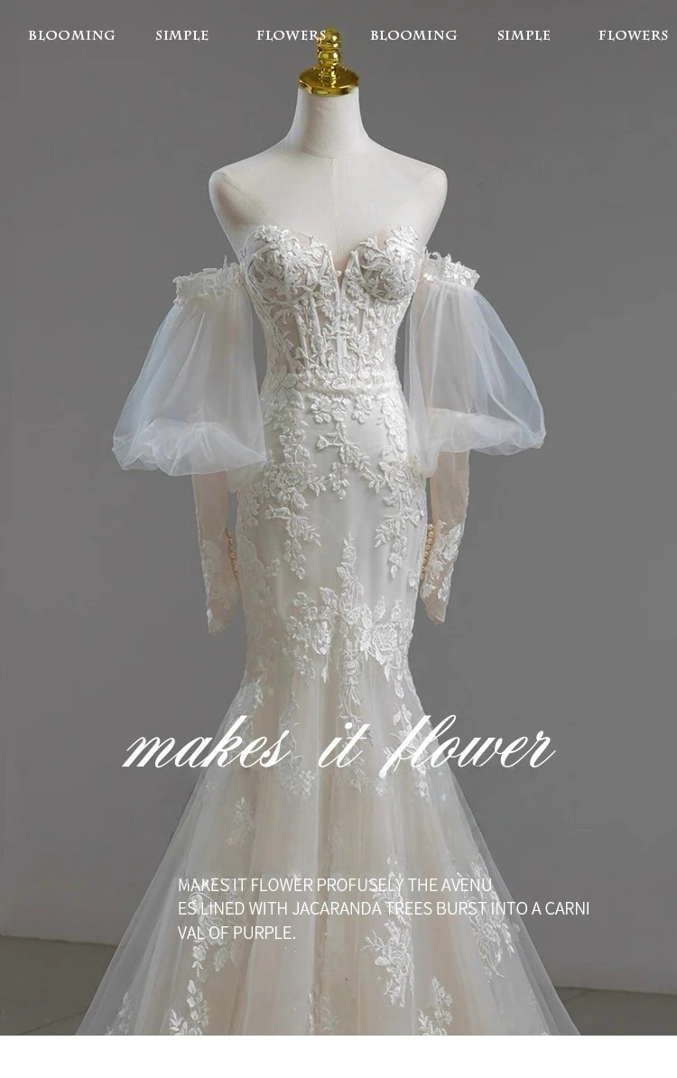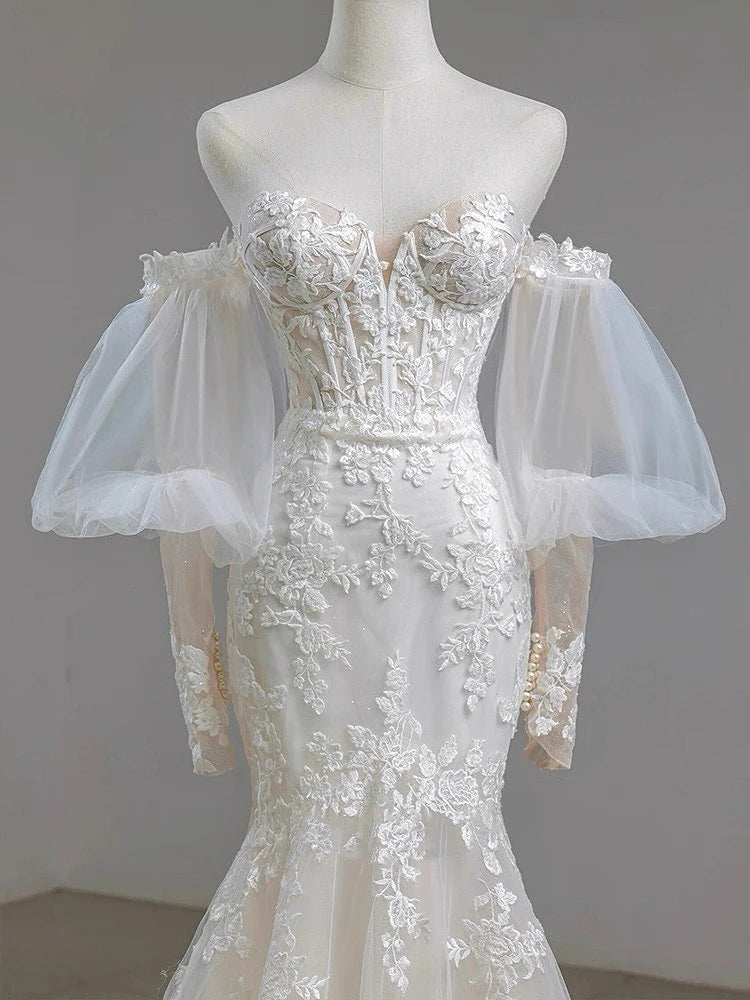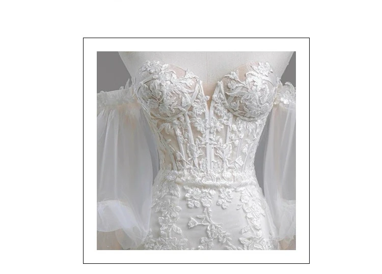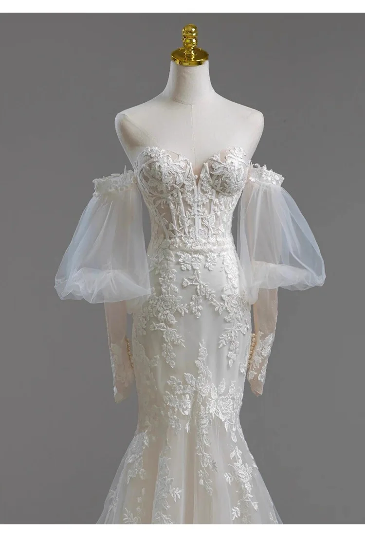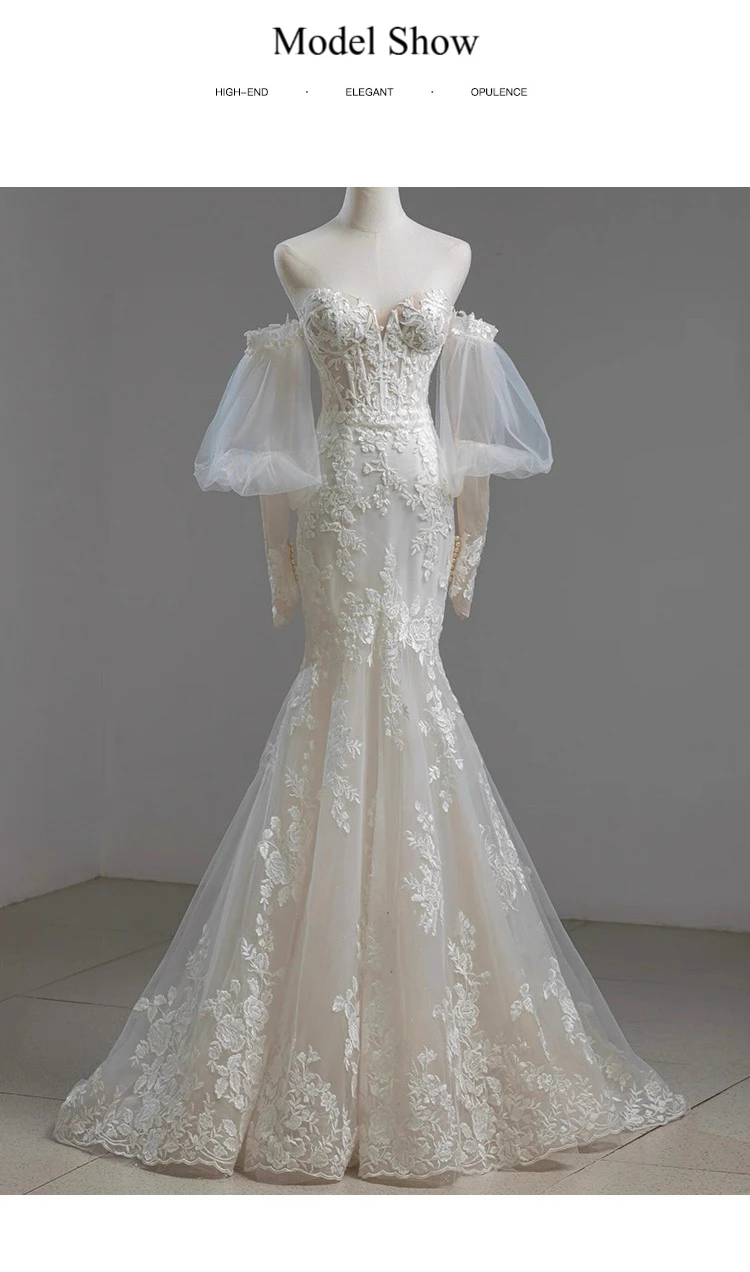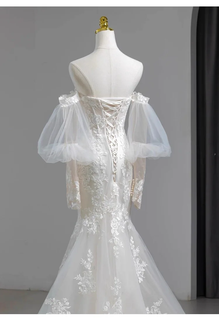 MQTIME - Elegant Noble White Lace Evening Dress Puff Sleeves Gauze Embroidery Slimming Trailing Mermaid Pom Dress Lady Party Dinners