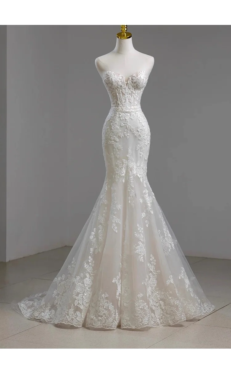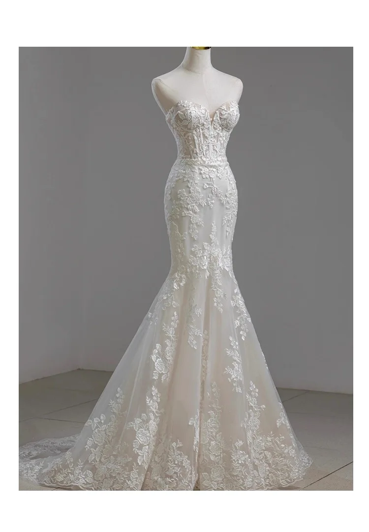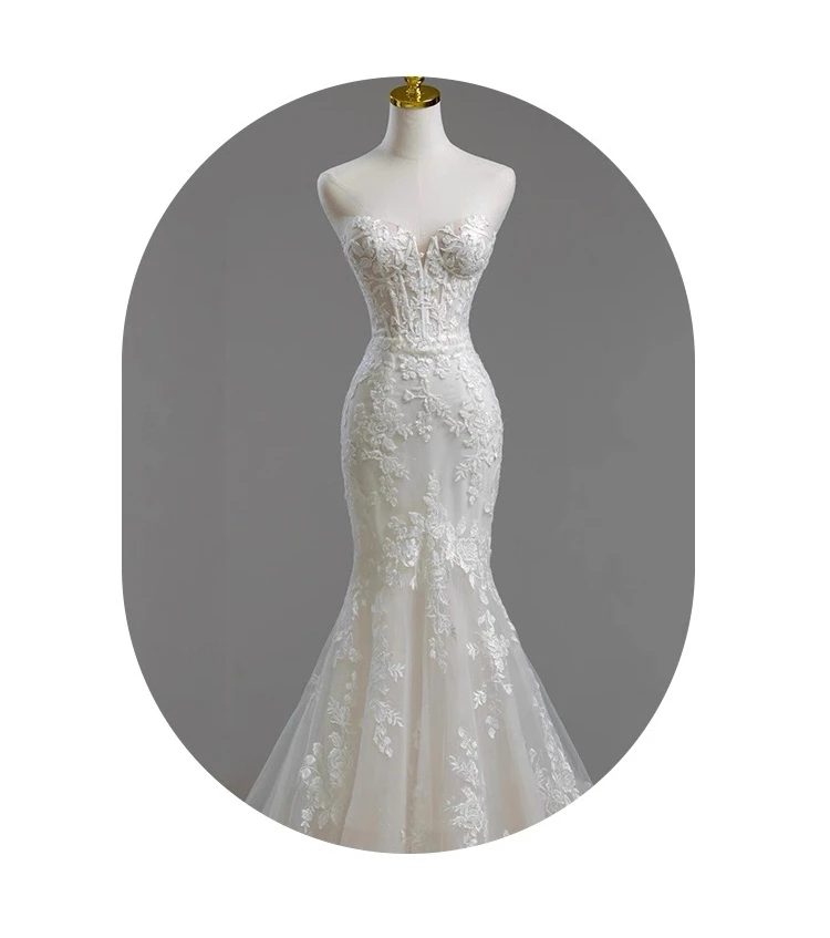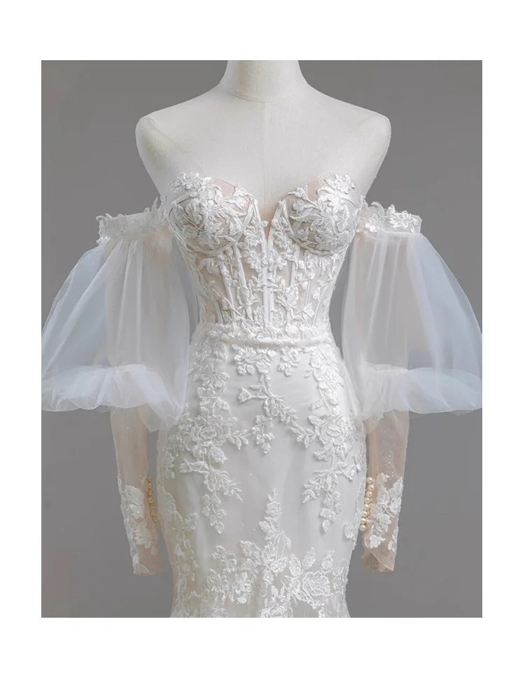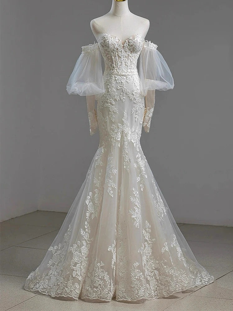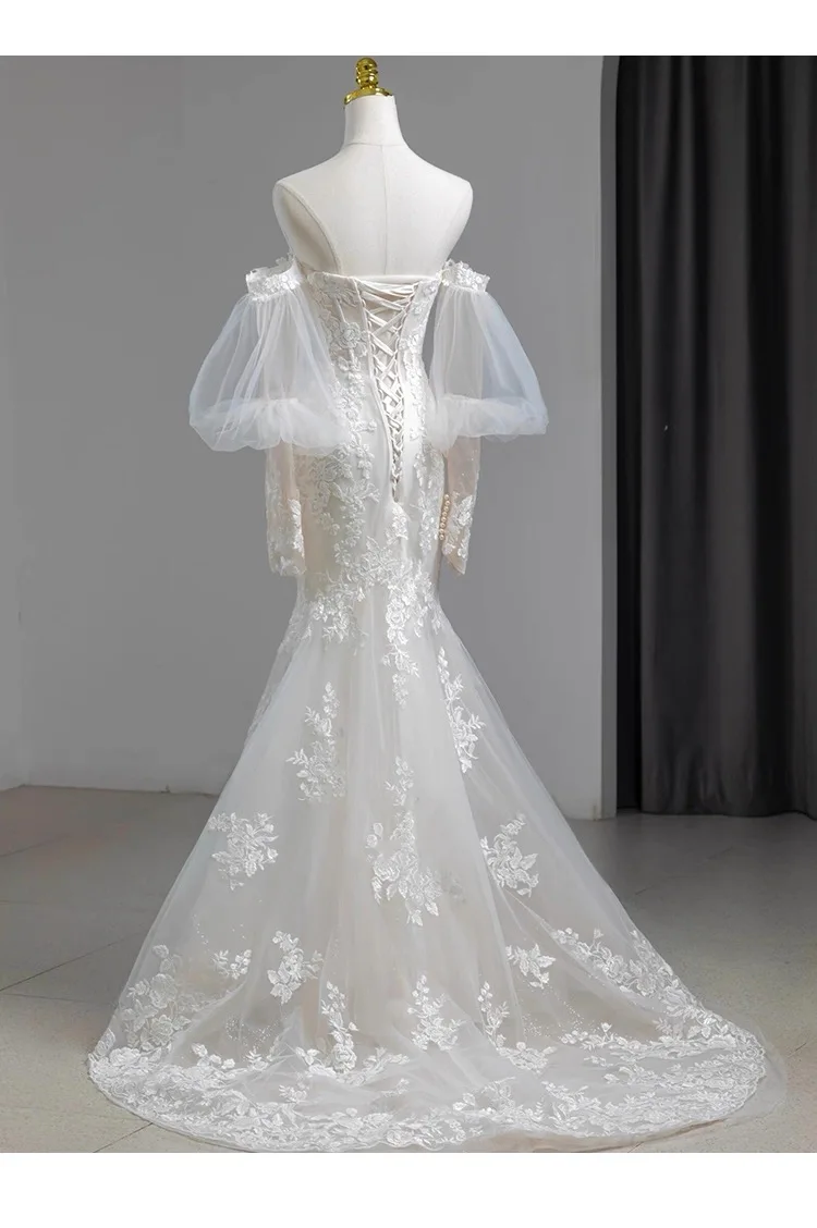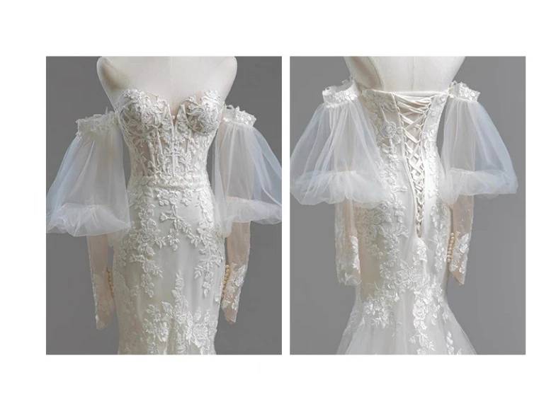 MQTIME - Elegant Noble White Lace Evening Dress Puff Sleeves Gauze Embroidery Slimming Trailing Mermaid Pom Dress Lady Party Dinners
