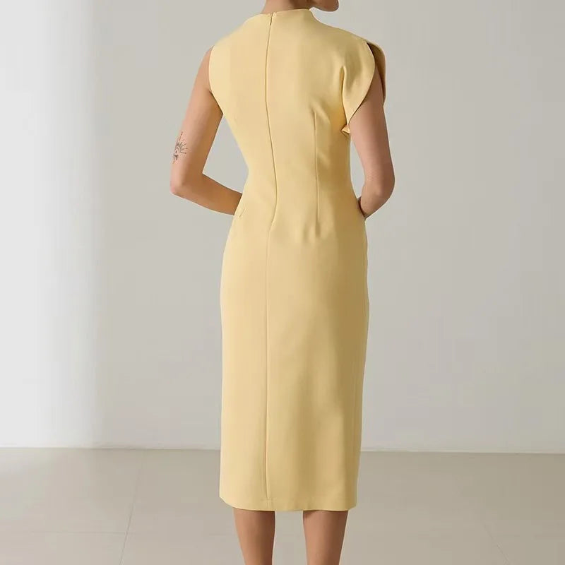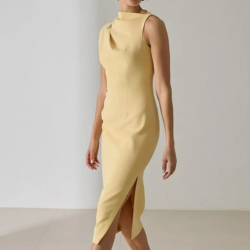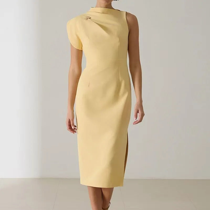 MQTIME - Elegant Office Lady Solid Straight Party Dress Spring Crew Neck Hollow Side Split Boho Dress Women Slim Bodycon Hips Dress Mujer