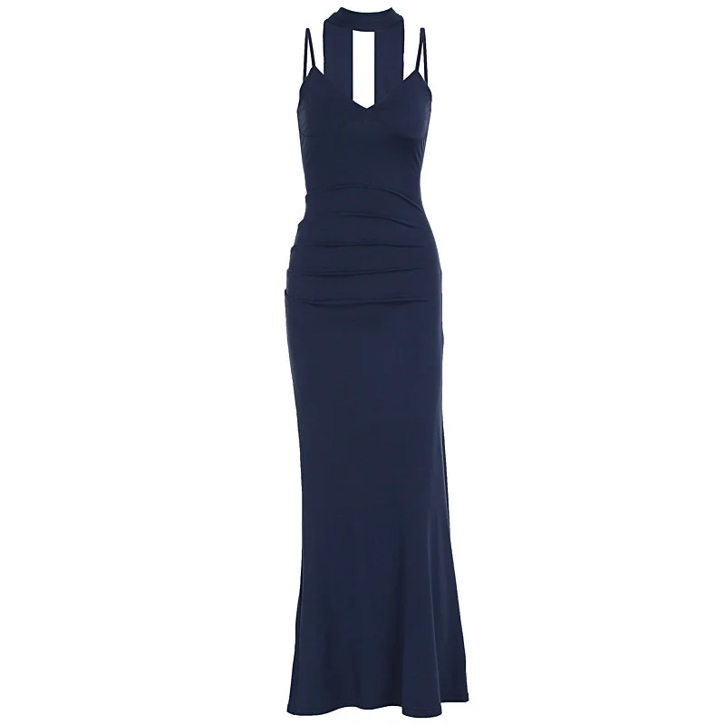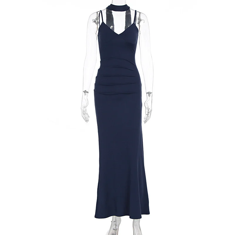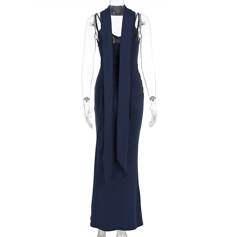 MQTIME - Elegant Ribbon Sexy Maxi Dress Women Gown Spaghetti Strap Solid Patchwork Slim Sleeveless Backless Club Party Dress