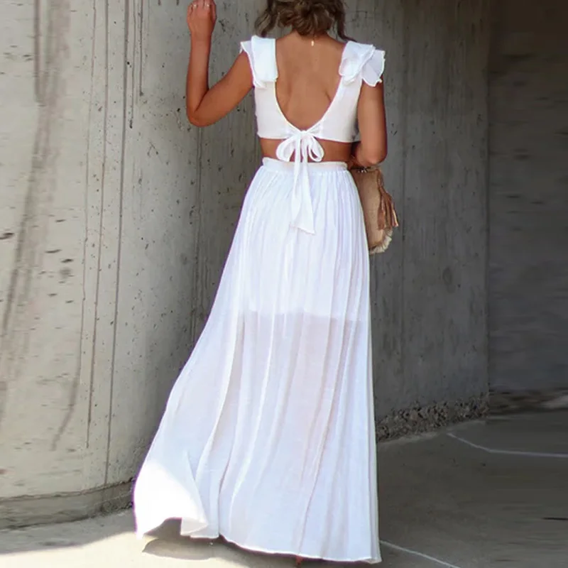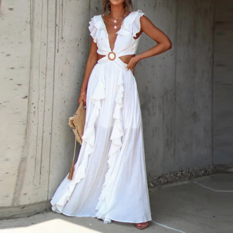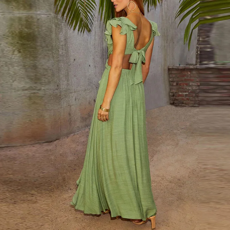 MQTIME - Elegant Ruffles Stitching Solid Color Party Dress Summer 2025 V-Neck Party Dress Ladies Chic Circle Waist Hollow Evening Dress