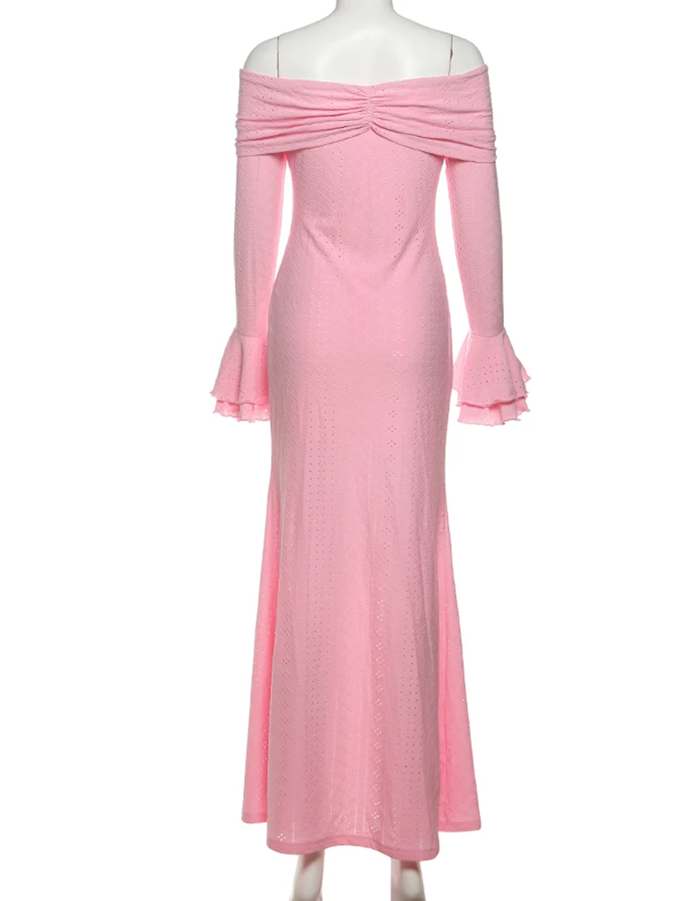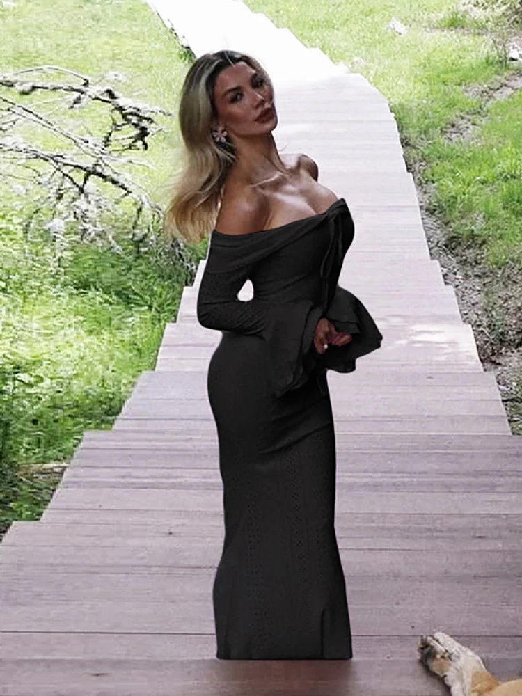 MQTIME - Elegant Solid Women Maxi Dress Classic High Street Off Shoulder Ruffle Sleeve Straight Long Robe Mujer Trend Vestidos