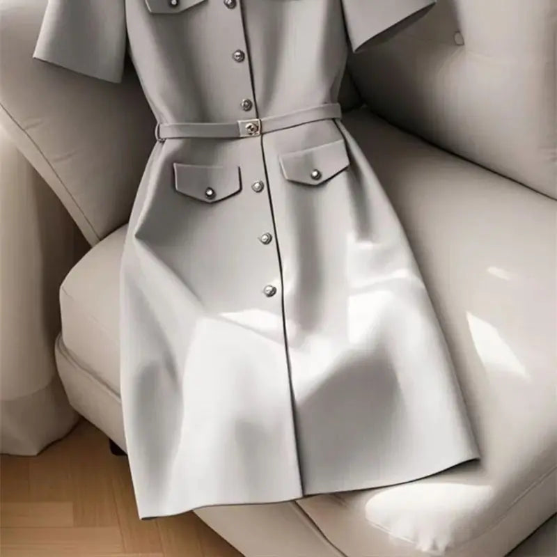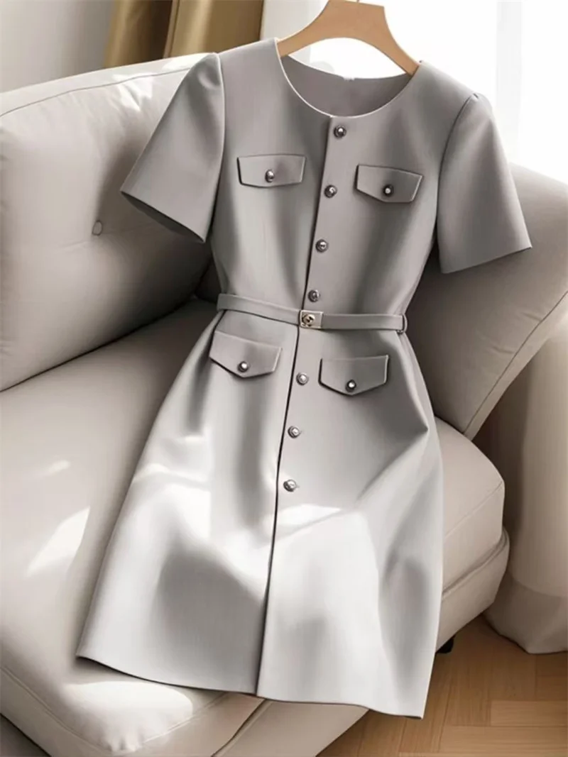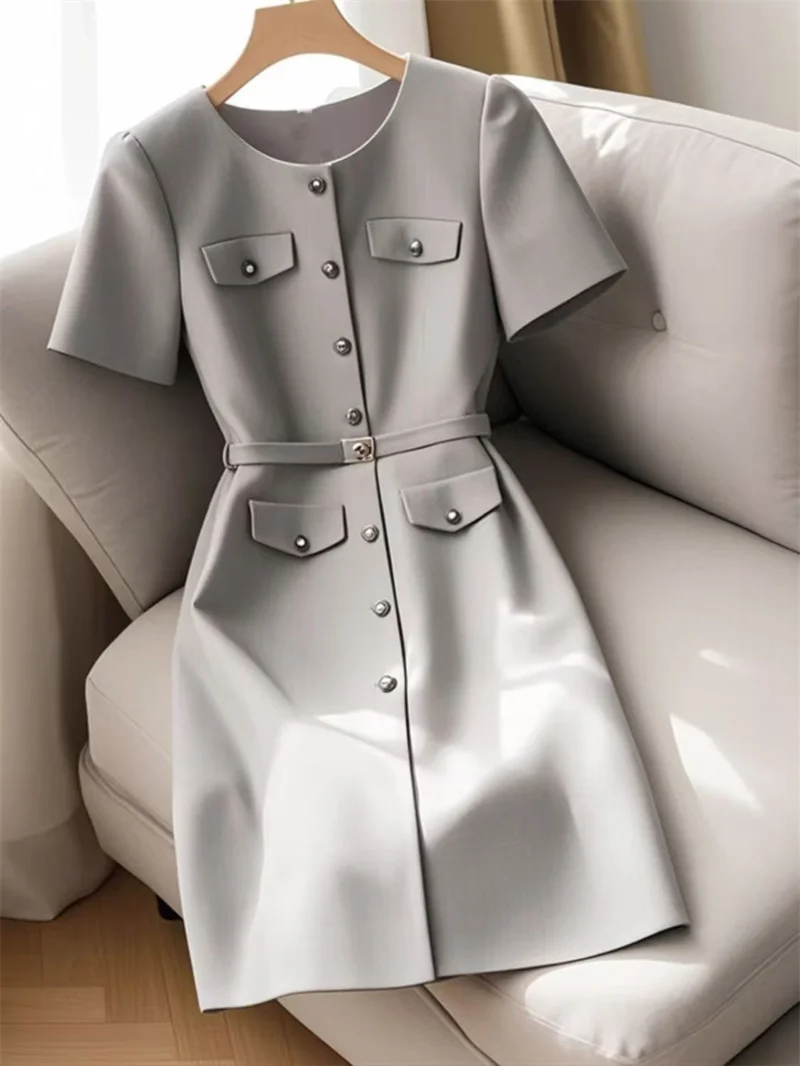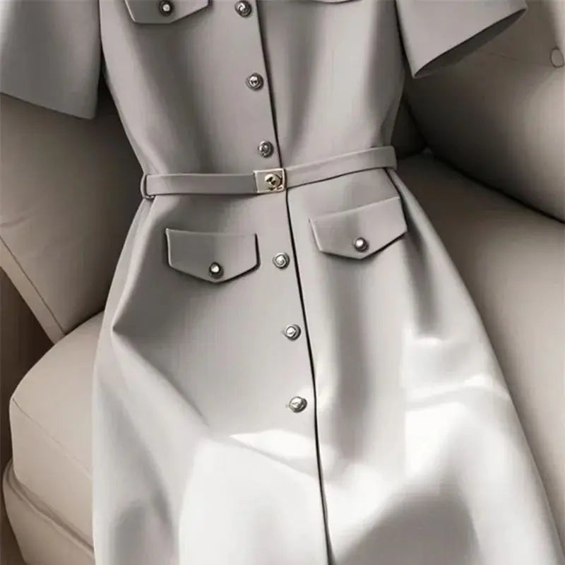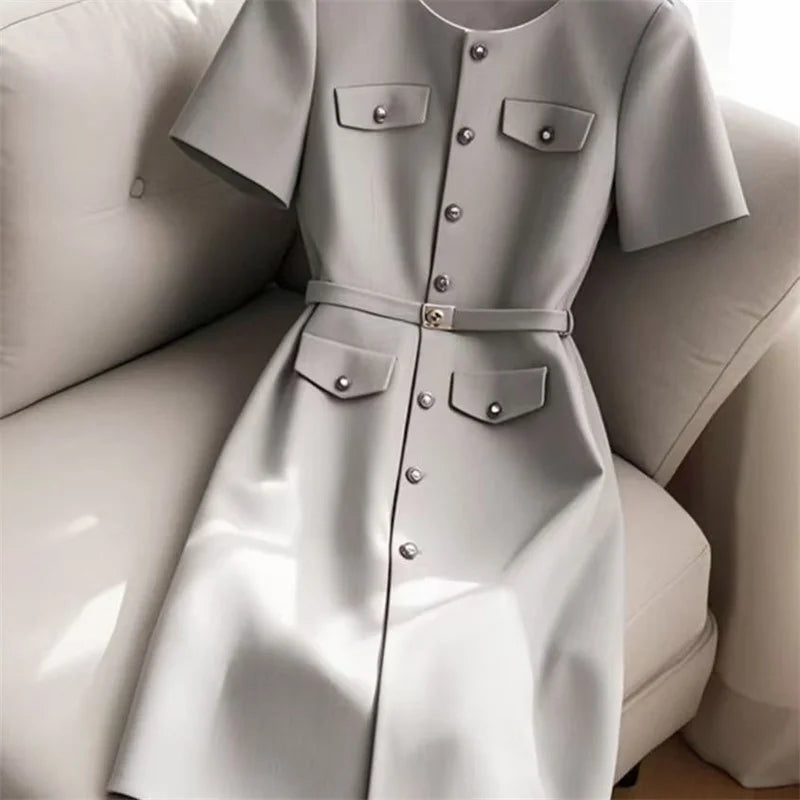 MQTIME - Elegant Women Formal Party Midi Dress Summer New Fashion Short Sleeve Single Breasted Office Lady A-Line Dresses with Belt 305B
