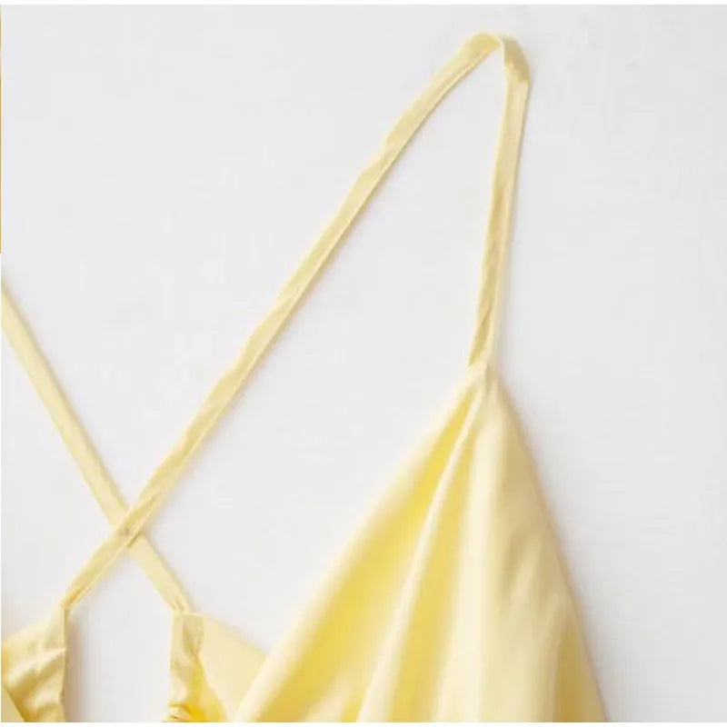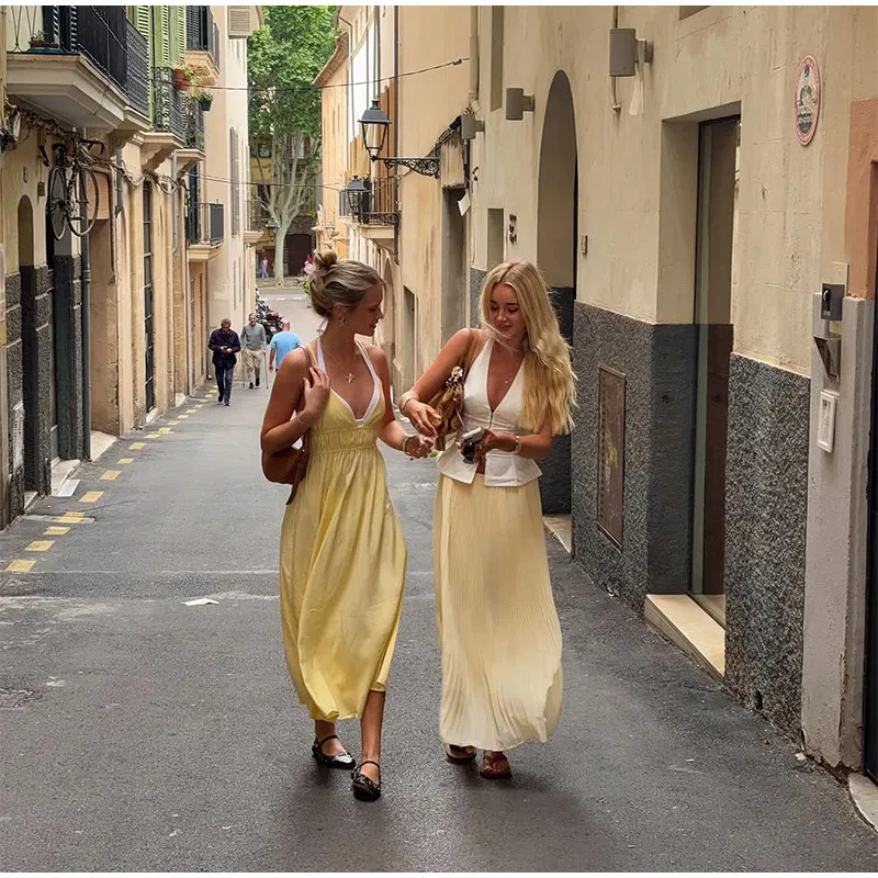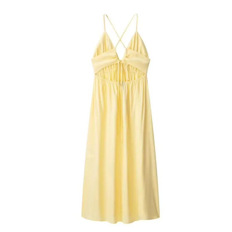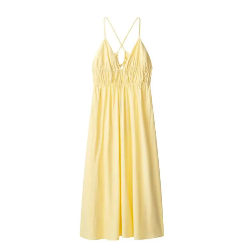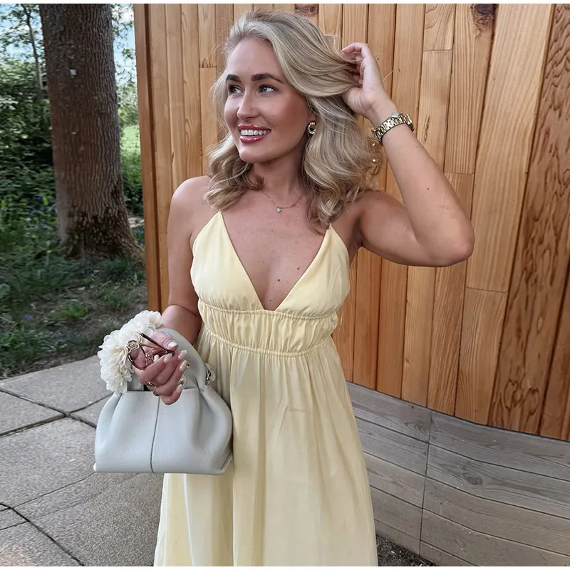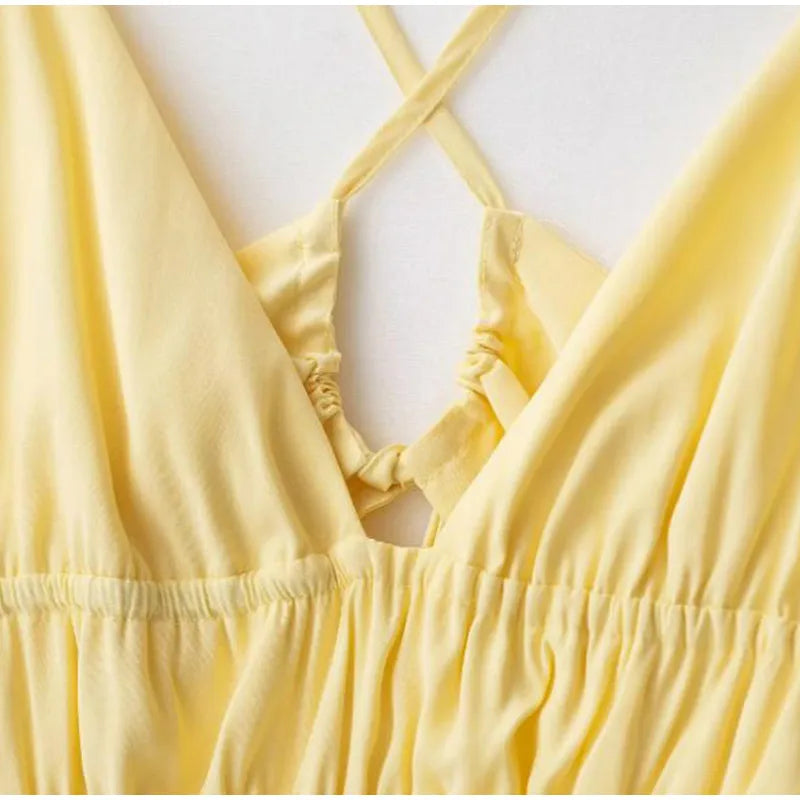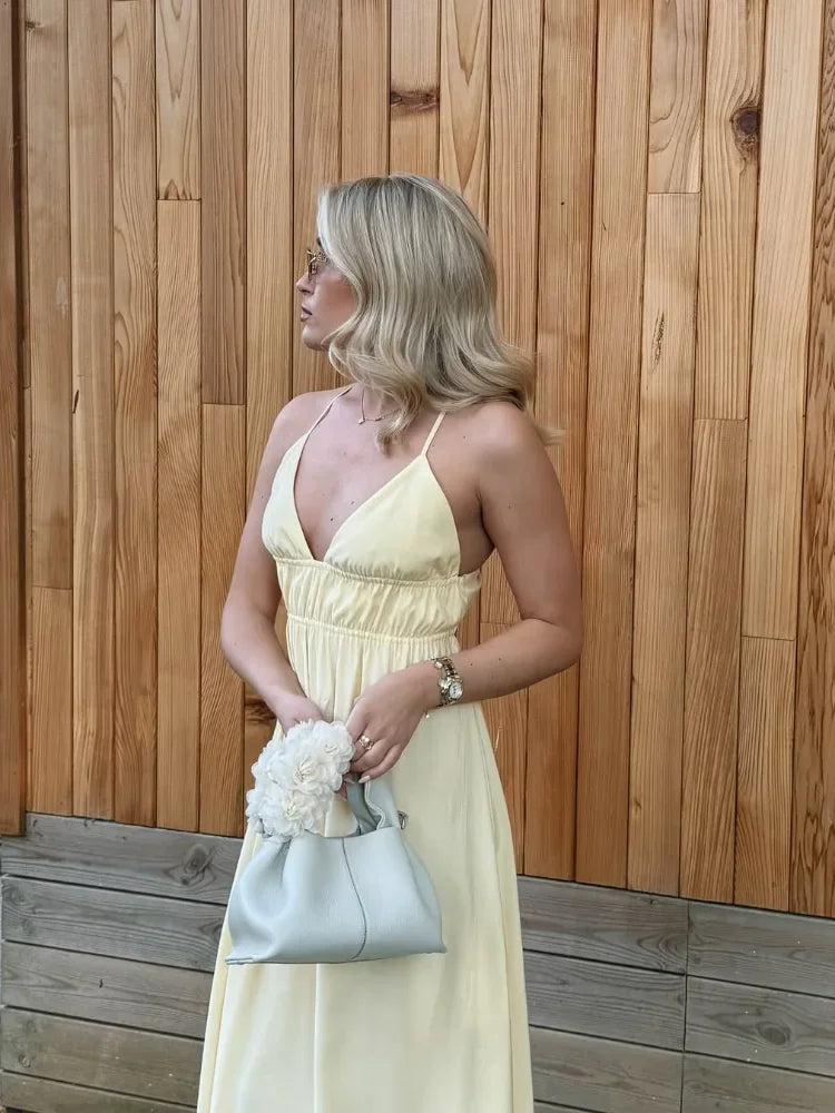 MQTIME - Elegant Yellow Elastic High Waist Maxi Sling Dress Women Sleeveless Off Shoulder Backless Deep V-neck Robes 2025 New Street Wear