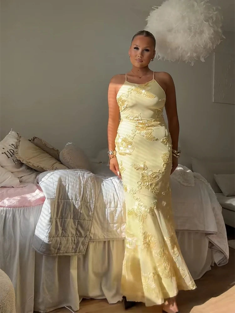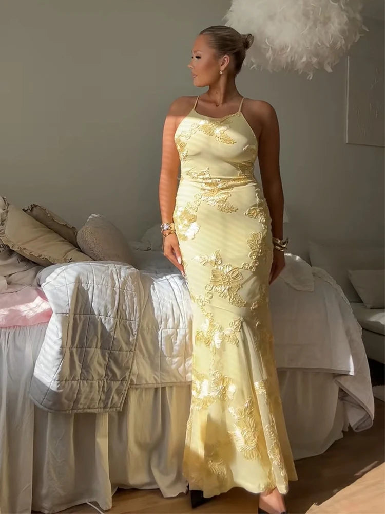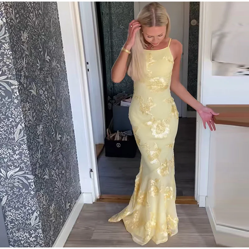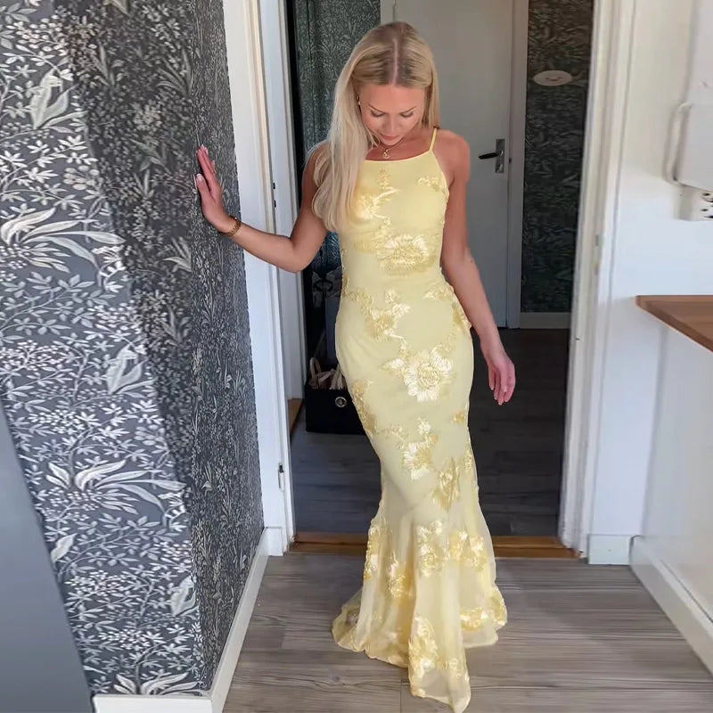 MQTIME - Embroidery Flower Fishtail Dress Women Spaghetti Strap Backless Sleeveless Zipper Holiday Party Dresses 2025 Summer Chic Robe