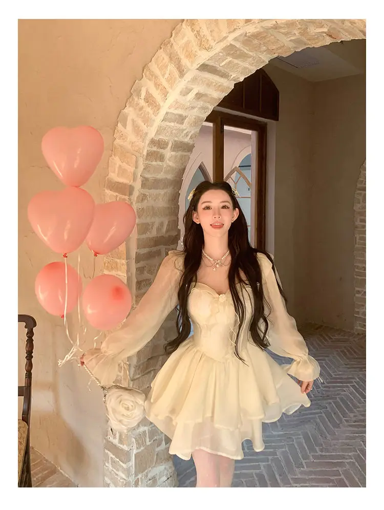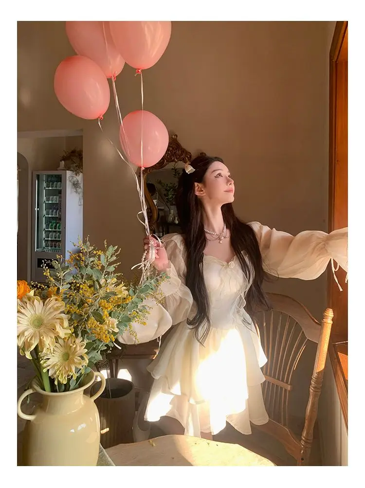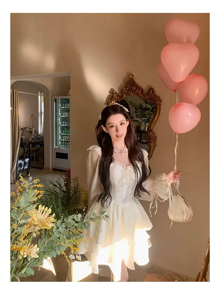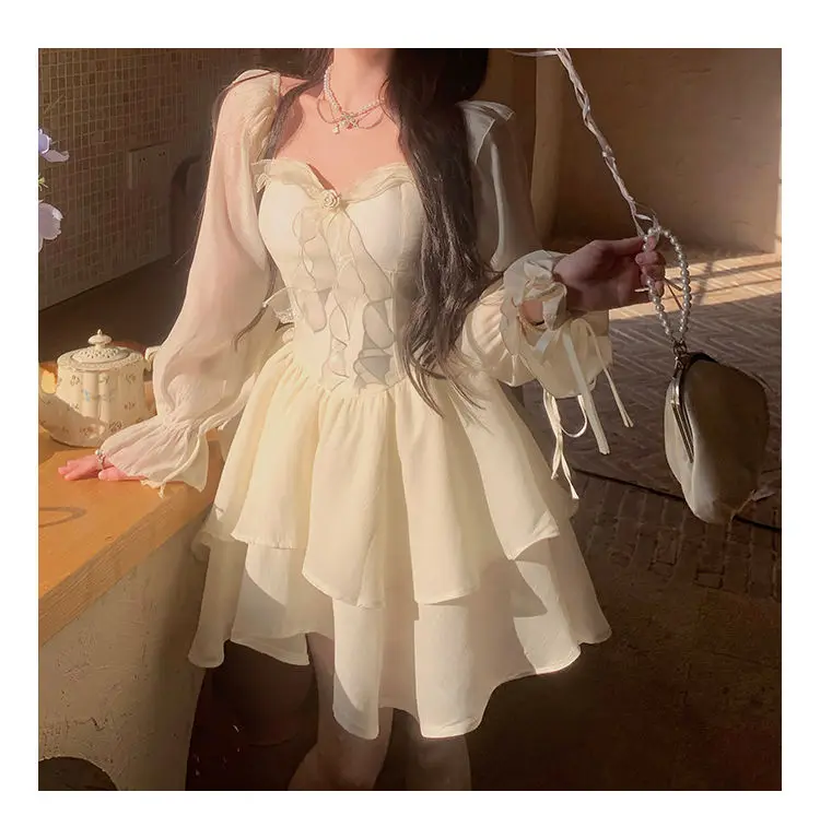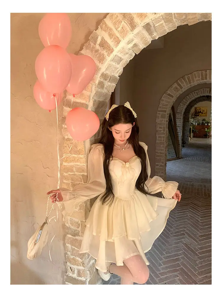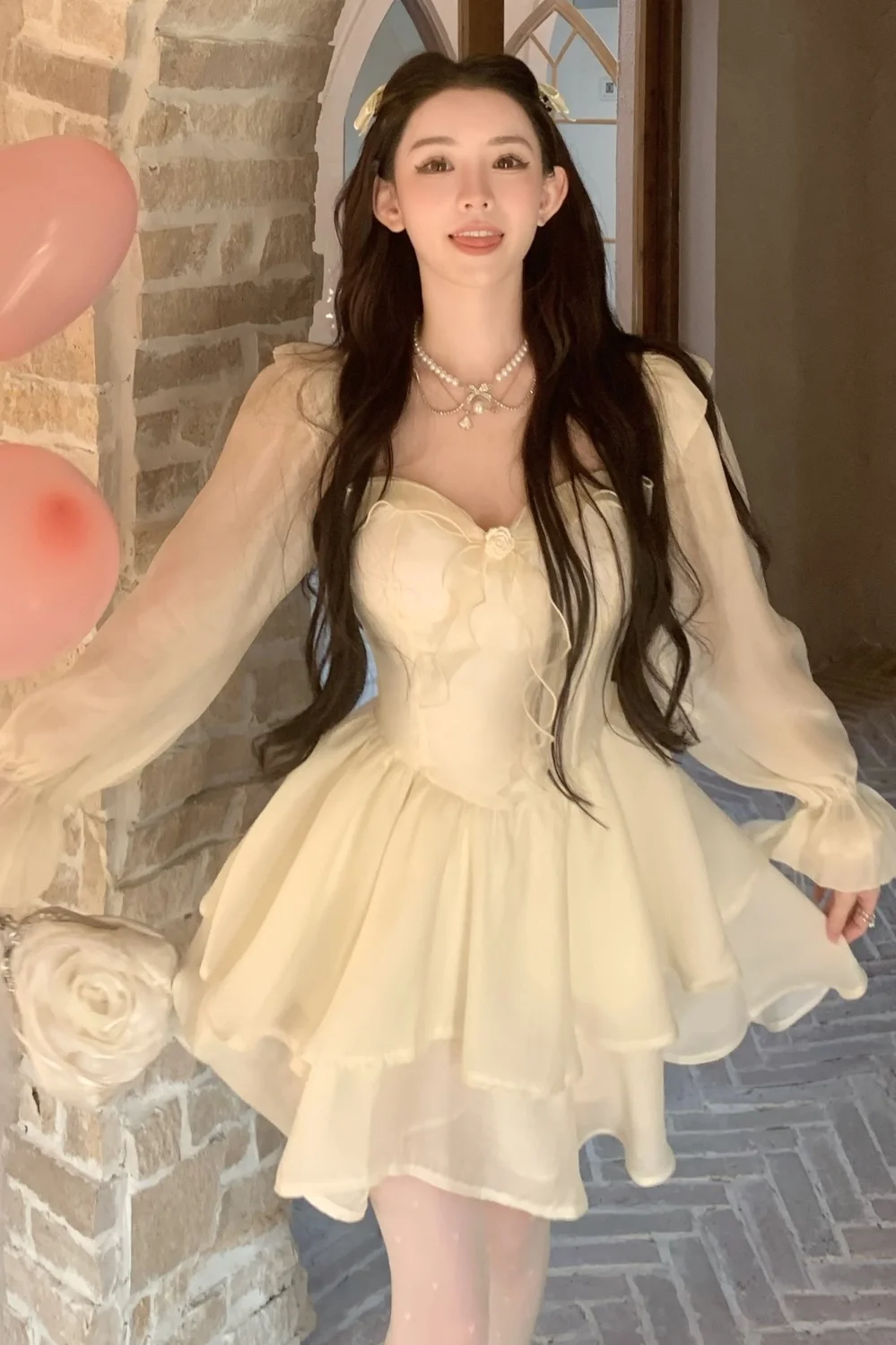 MQTIME - Fairy Sweet Bow Long Sleeve Dress Kawaii Grunge Lantern Dresses Korean Y2k Aesthetic Ball Gown Square Collar Robe Women