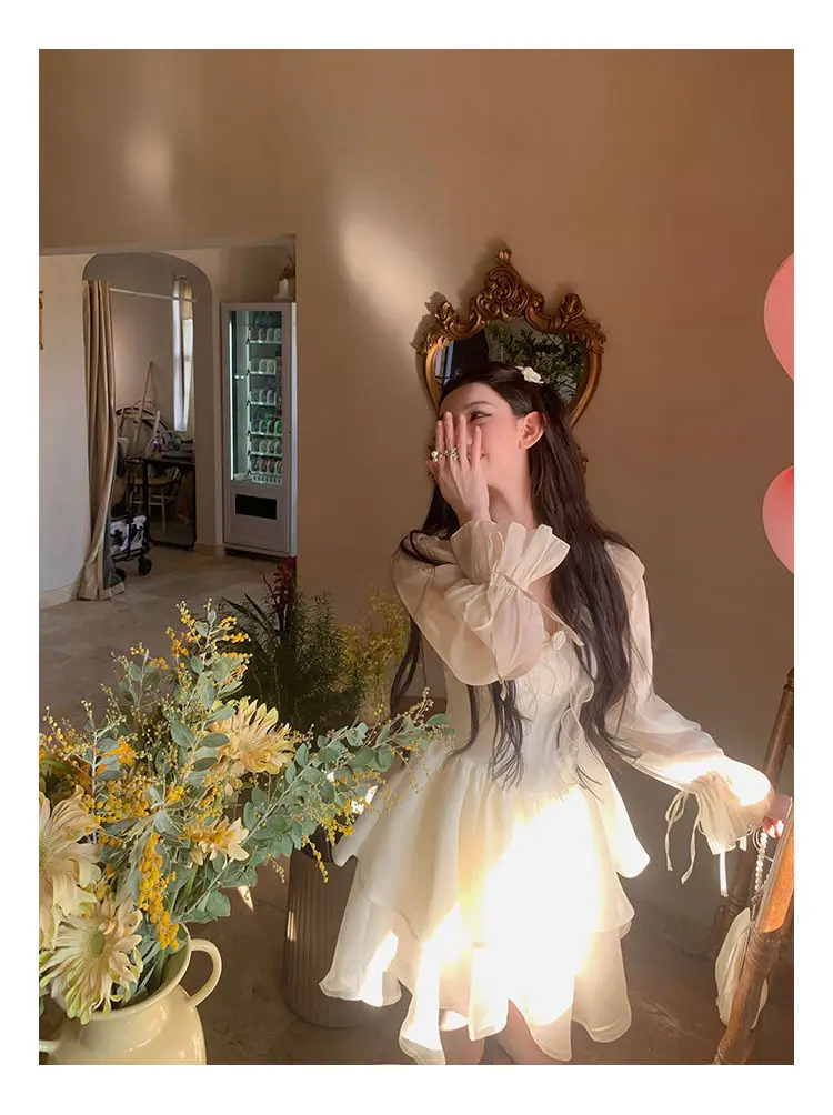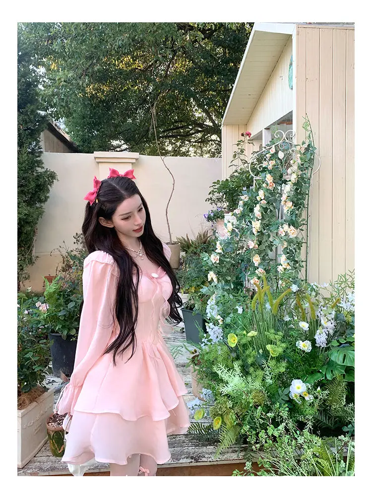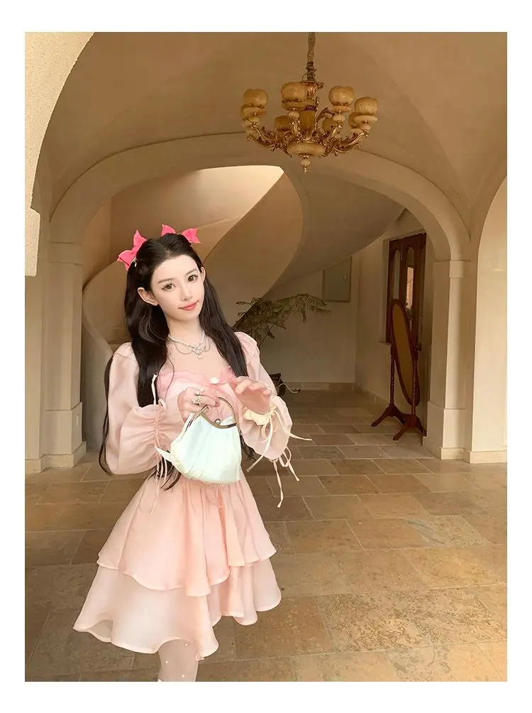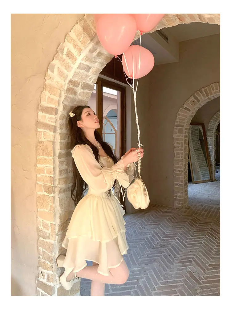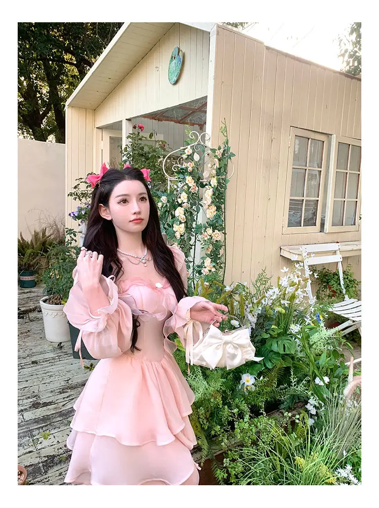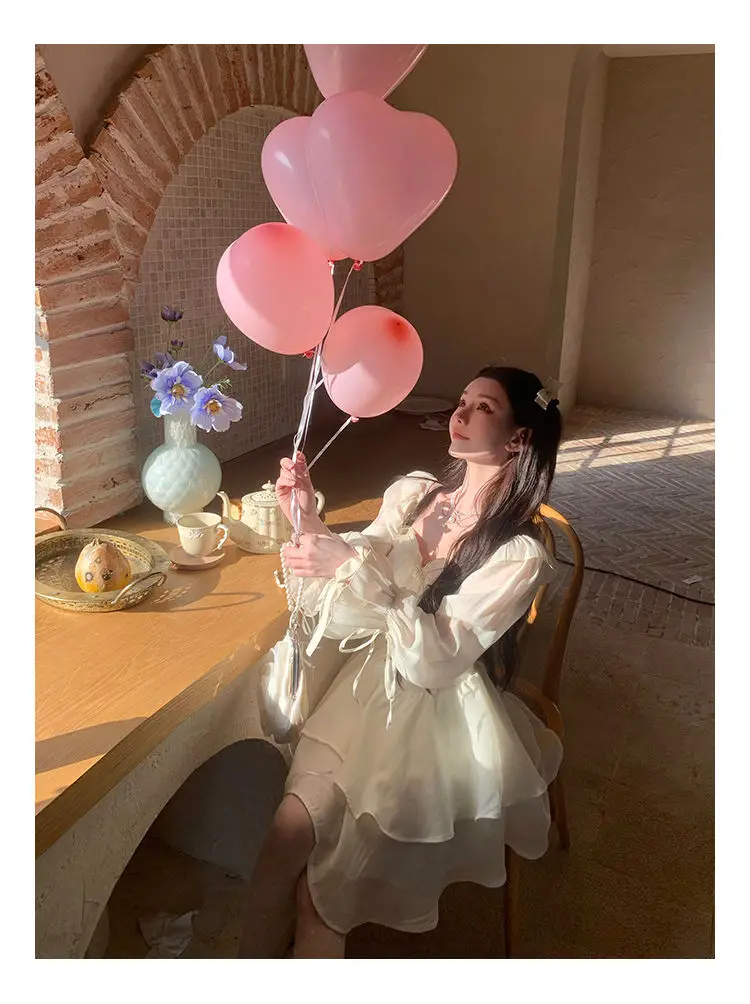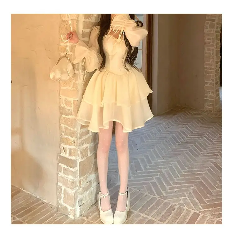 MQTIME - Fairy Sweet Bow Long Sleeve Dress Kawaii Grunge Lantern Dresses Korean Y2k Aesthetic Ball Gown Square Collar Robe Women