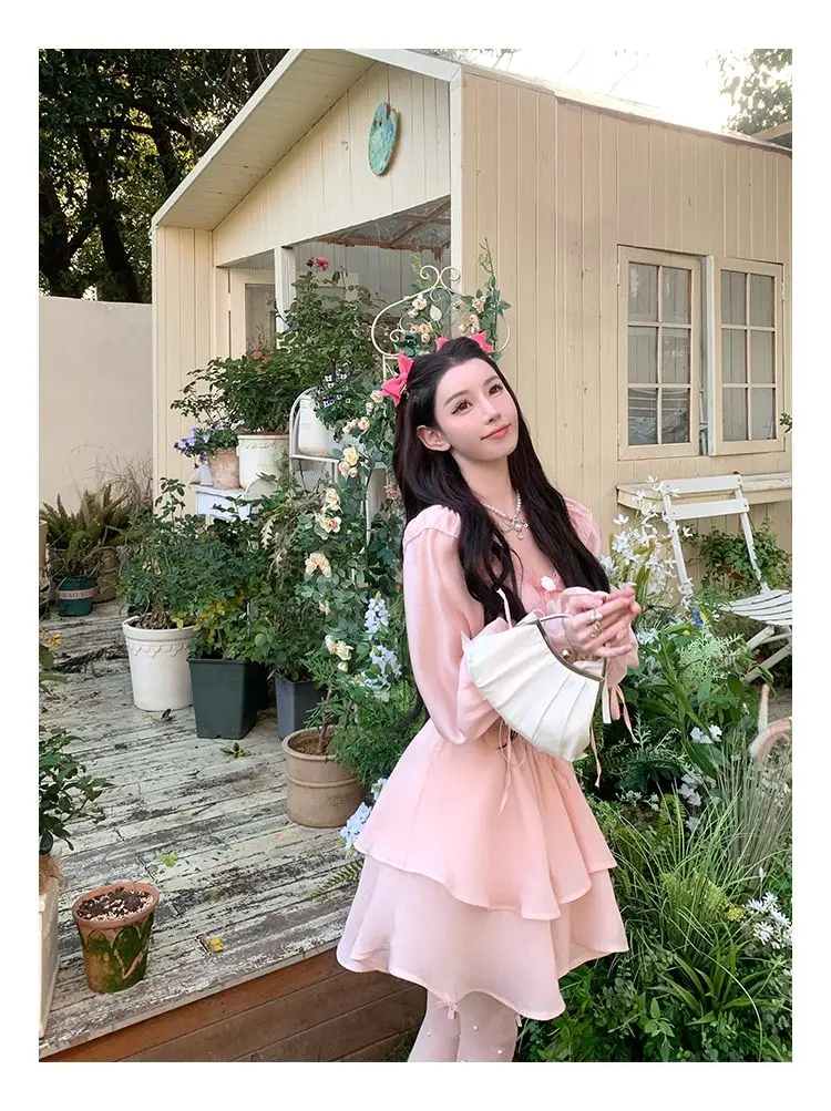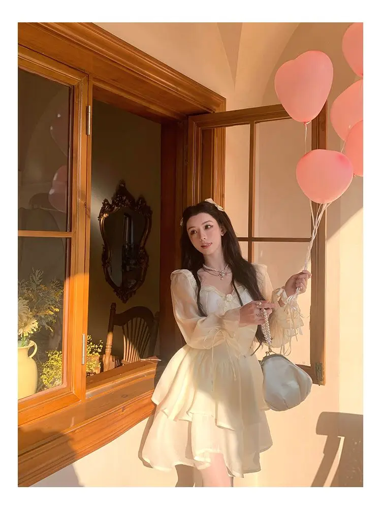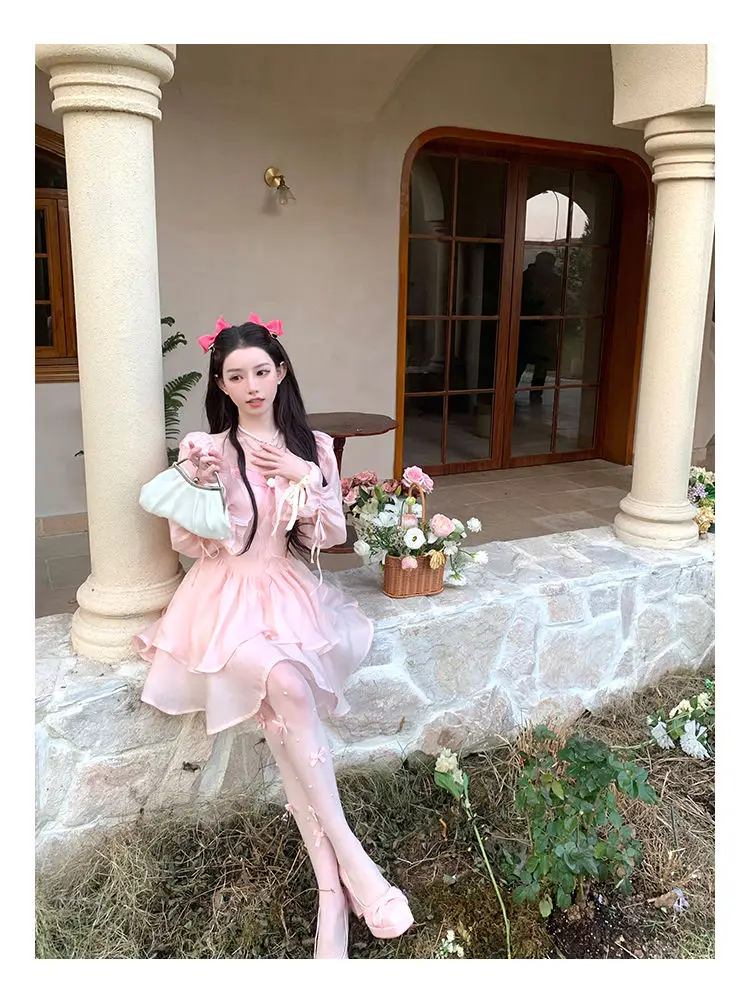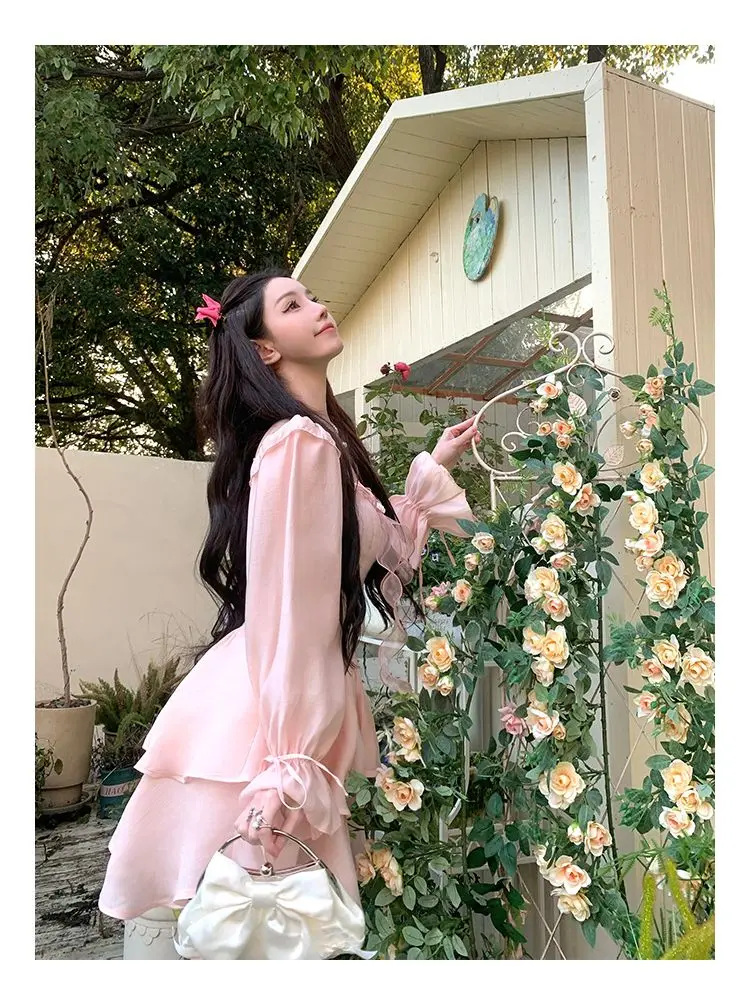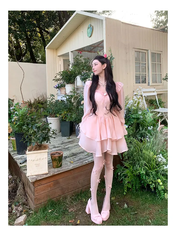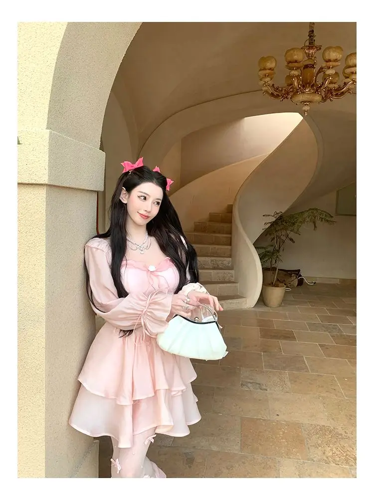 MQTIME - Fairy Sweet Bow Long Sleeve Dress Kawaii Grunge Lantern Dresses Korean Y2k Aesthetic Ball Gown Square Collar Robe Women
