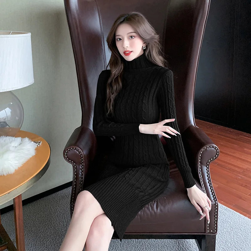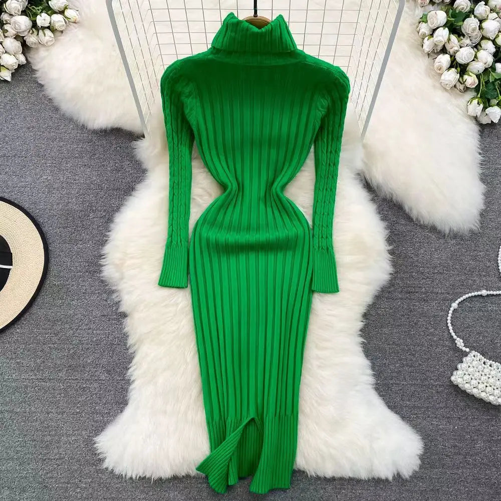 MQTIME - Fall/Winter 2025 Women's Sexy High Neck Long Sleeve Midi Fit Hip Knitted Dress