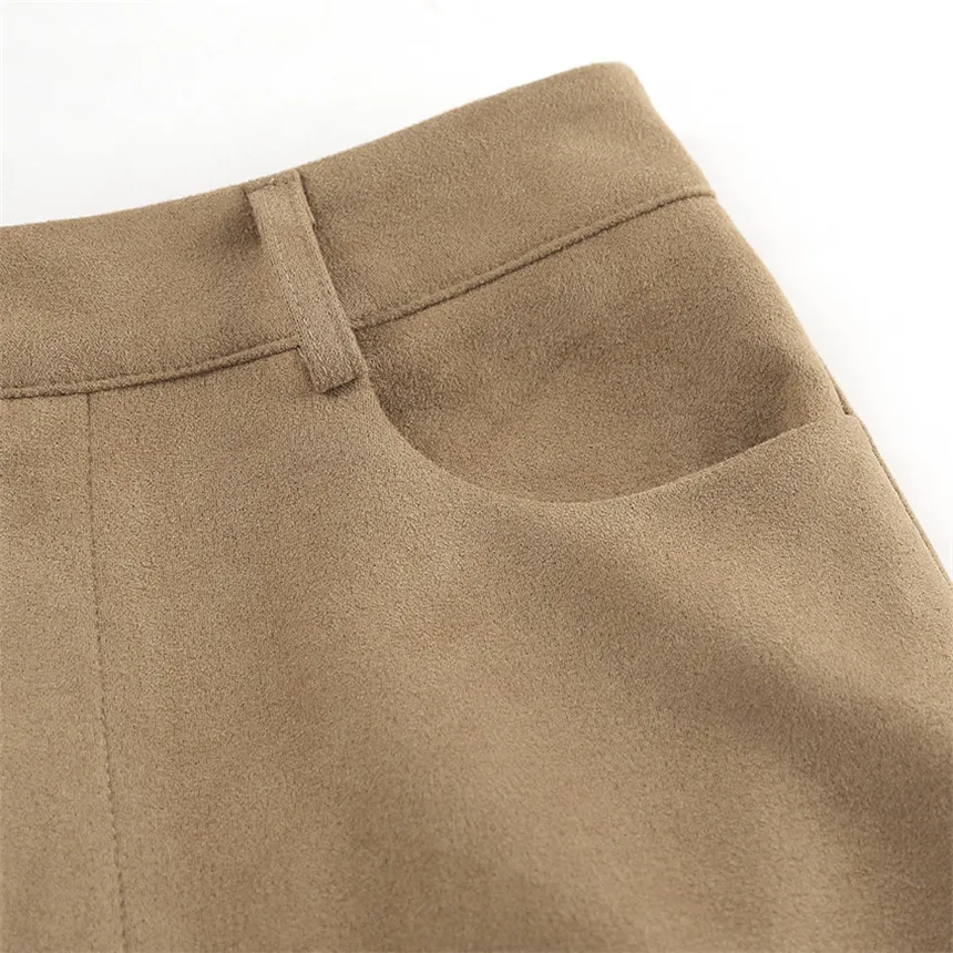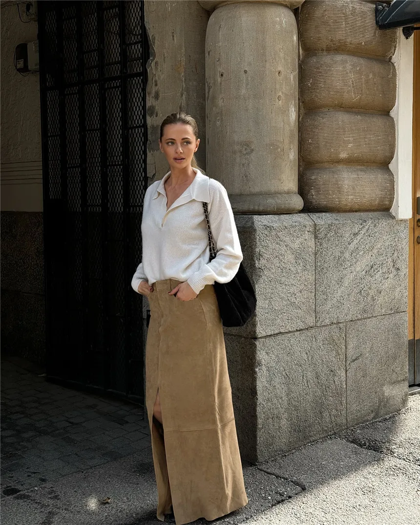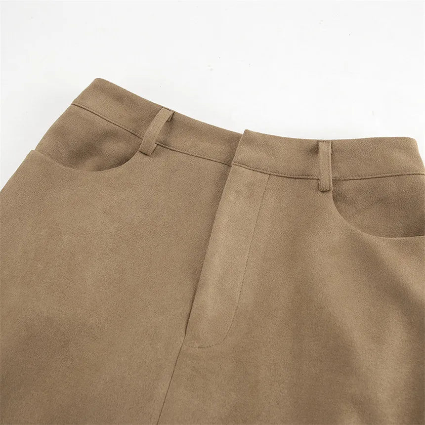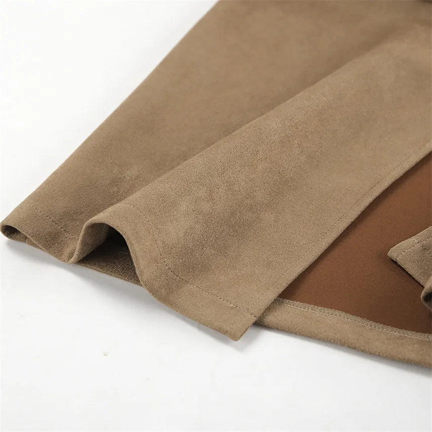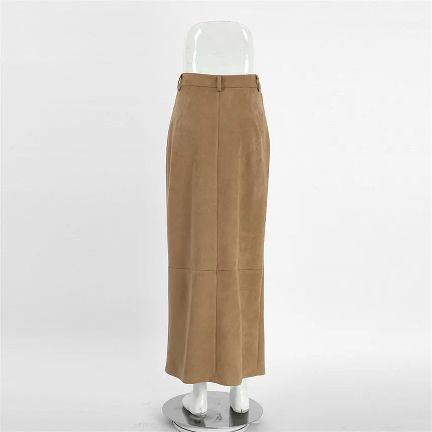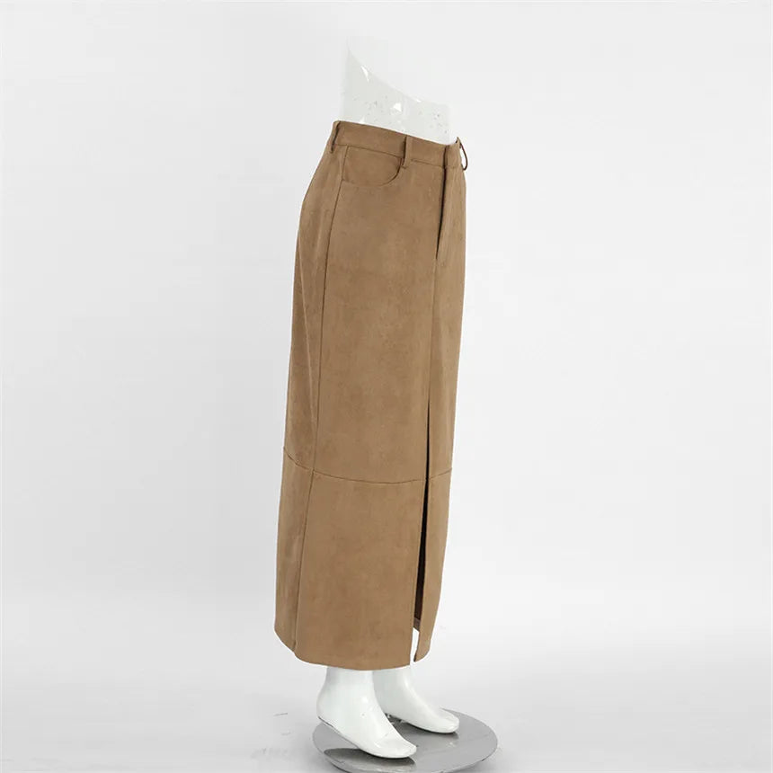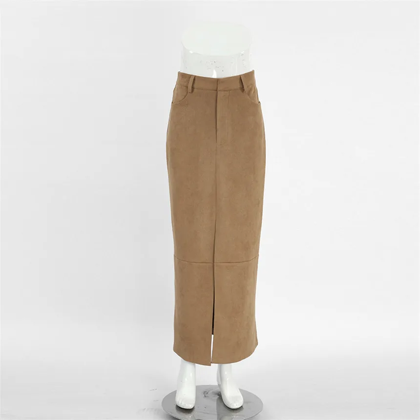 MQTIME - Fall Winter Vintage Suede Skirt New Women's Split Brown Long Skirts High Street Office Lady Elegant High Waist Slim Dress
