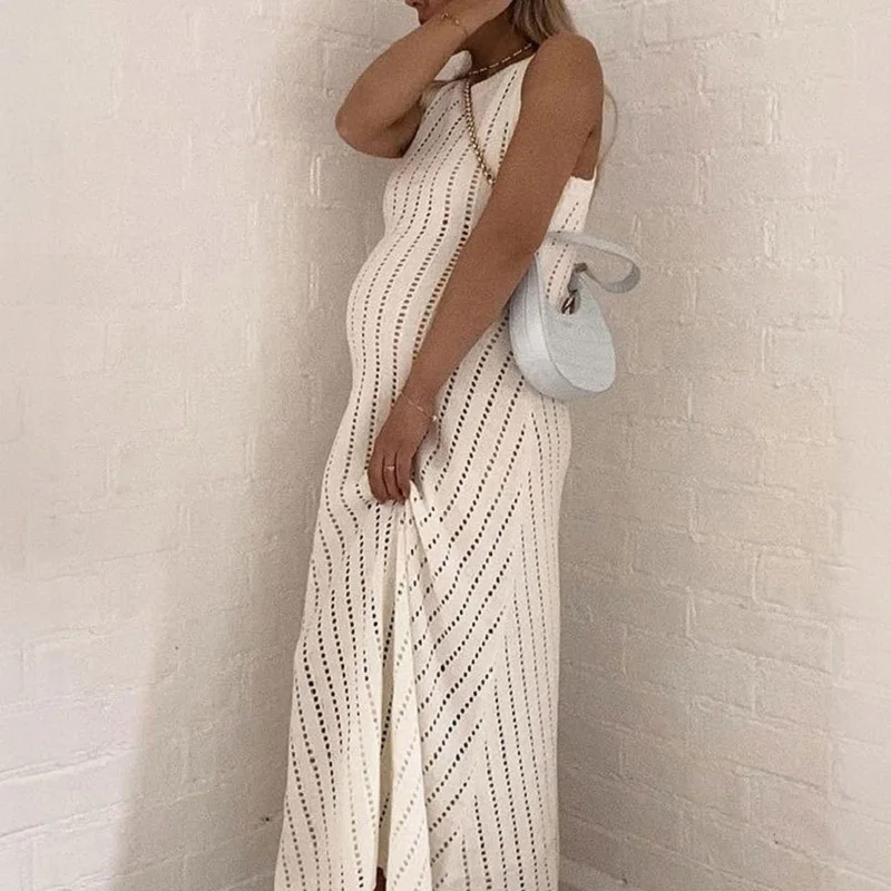 MQTIME - Fashion O Neck Sleeveless Women's Knitted Dress Crochet Hollow Summer Beach Long Dress Bikini Cover Up Holiday Solid Color Dress