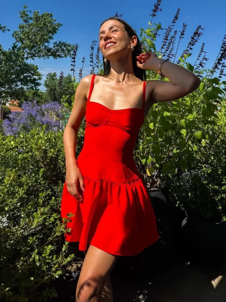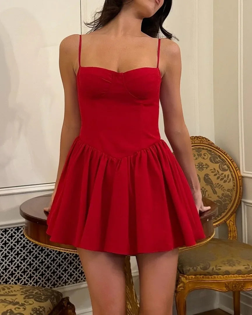 MQTIME - Fashion Red High Waist Pleated Mini Vestido Women Sleeveless Off Shoulder Low-cut Ruffle Chest Wrapped Slim Dress New Party Wear
