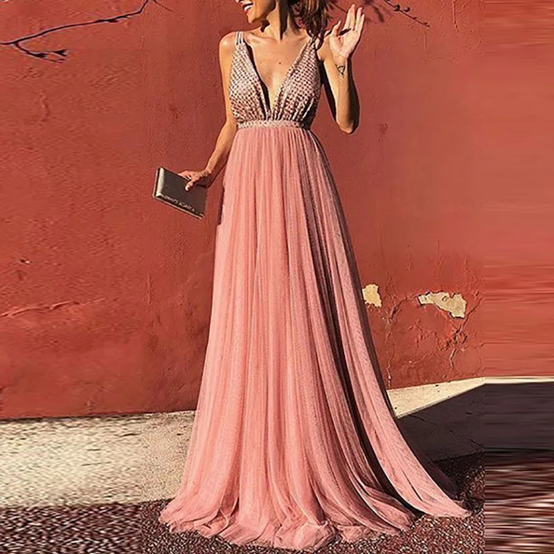 MQTIME - Fashion Sequined Patchwork Waist Solid Long Dress Sexy Sleeveless Split Gowns Dress Lady Elegant Deep V-neck Evening Party Dress