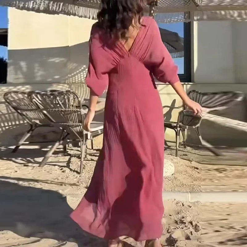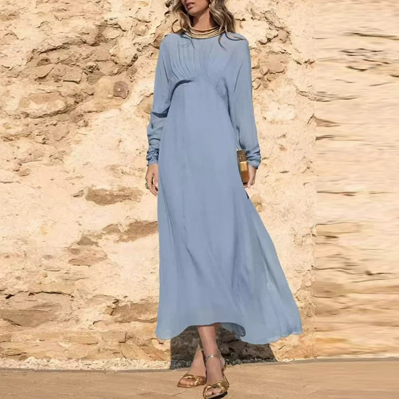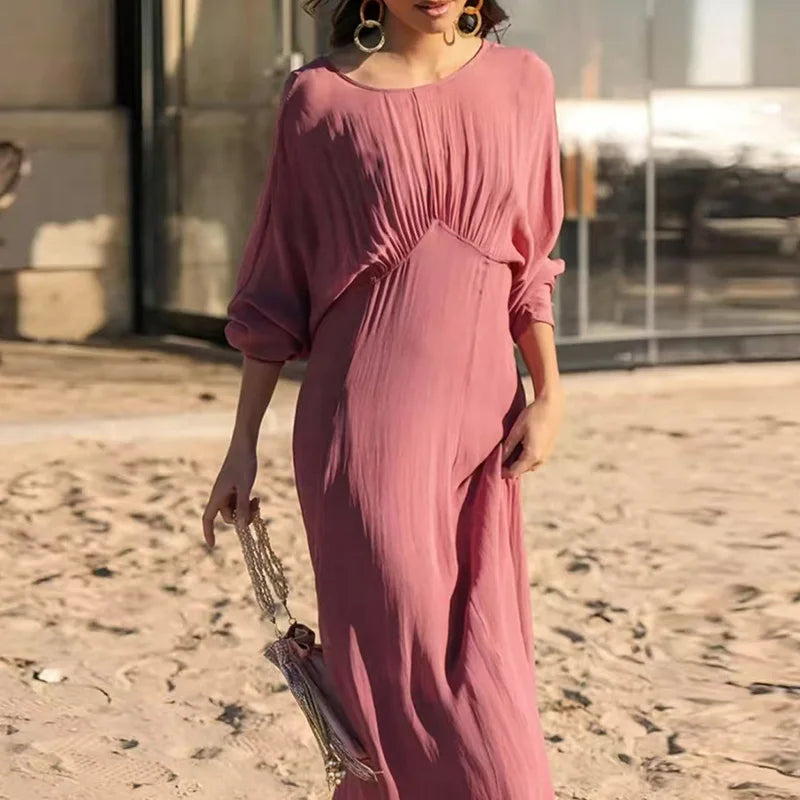 MQTIME - Fashion Solid Color Long Sleeve Pleat Dress Elegant O Neck Loose Beach Dress Summer New Simple Backless Women's Commuting Dress