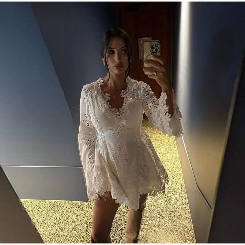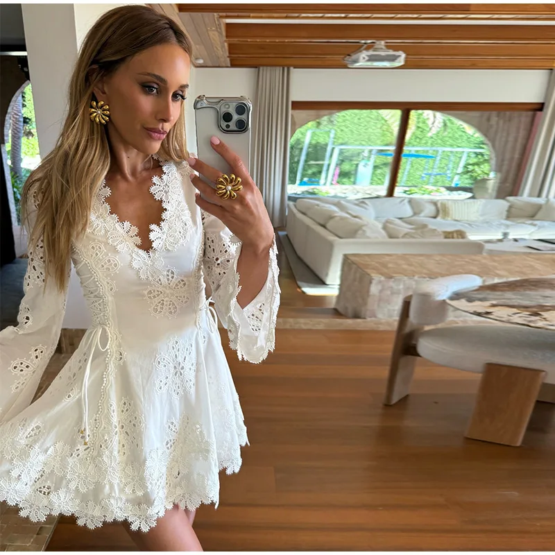 MQTIME - Flower Embroidery Hollow Out A-line Dress Women Slim V-neck Long Sleeve High Waist Dresses Elegant Summer Vacation Party Robe