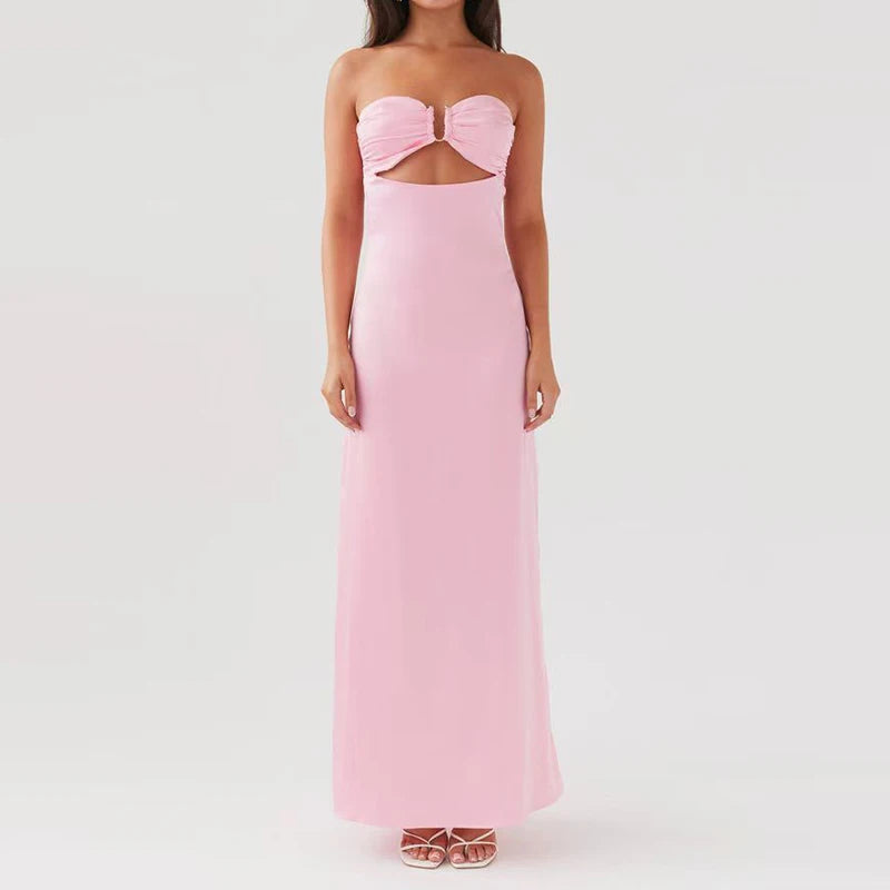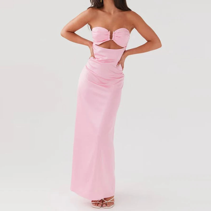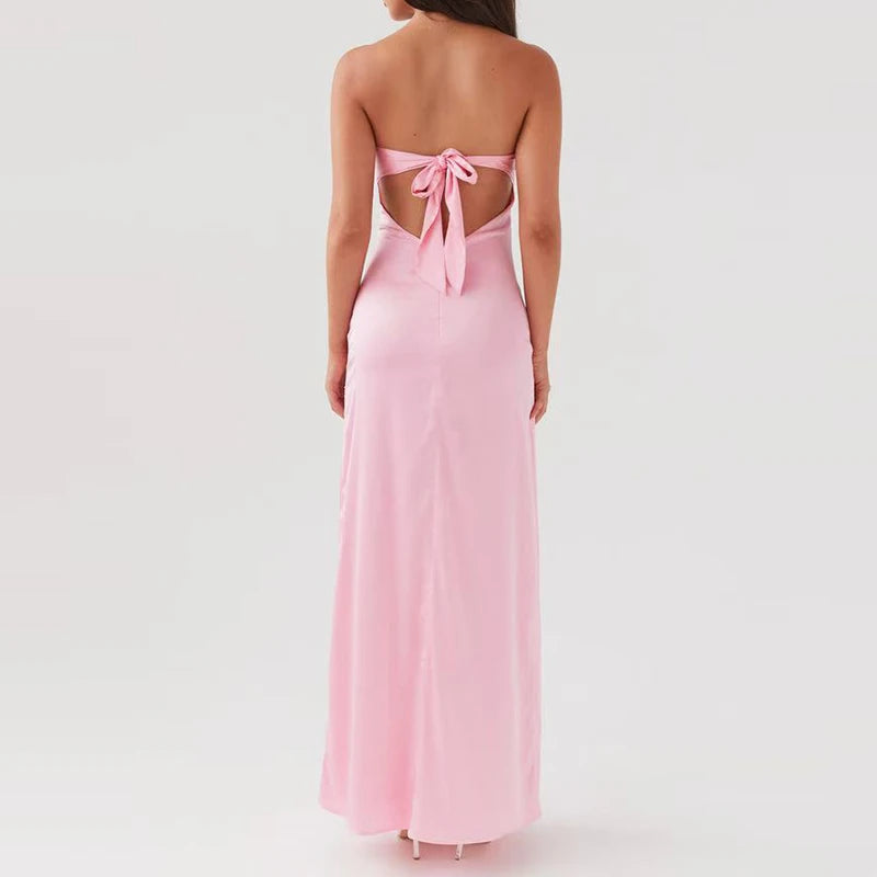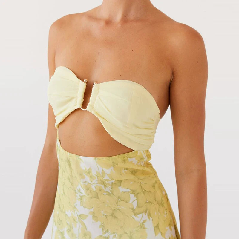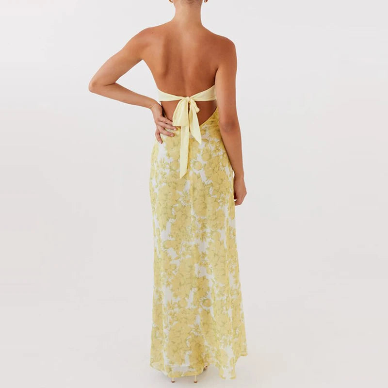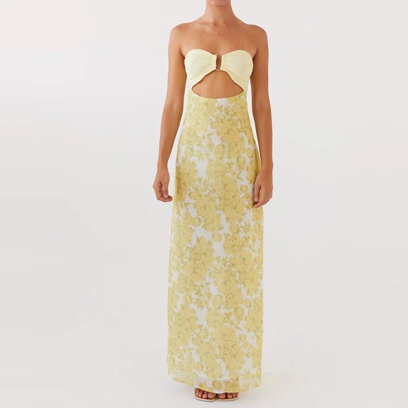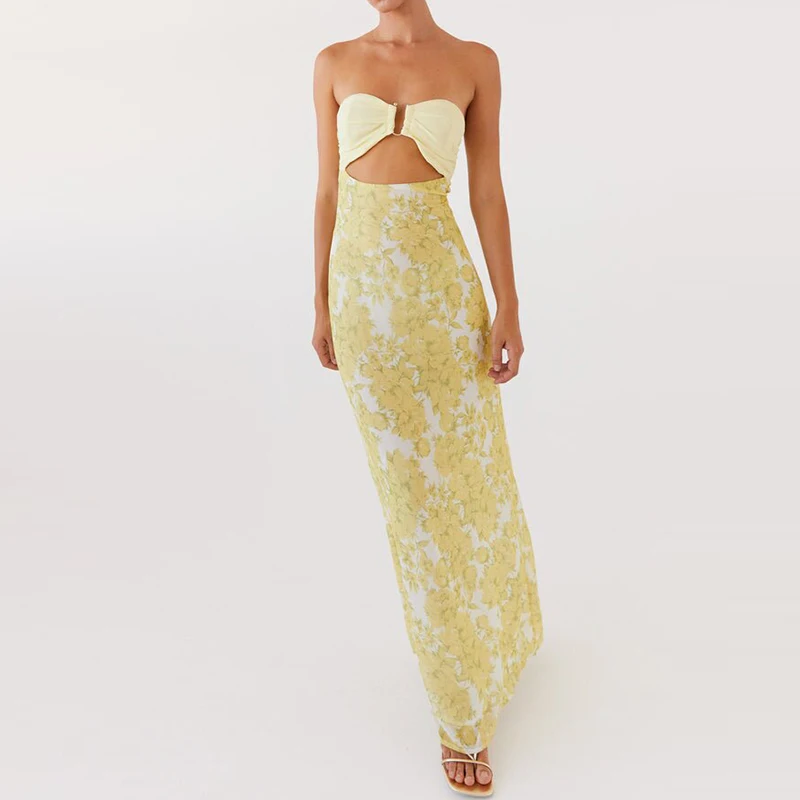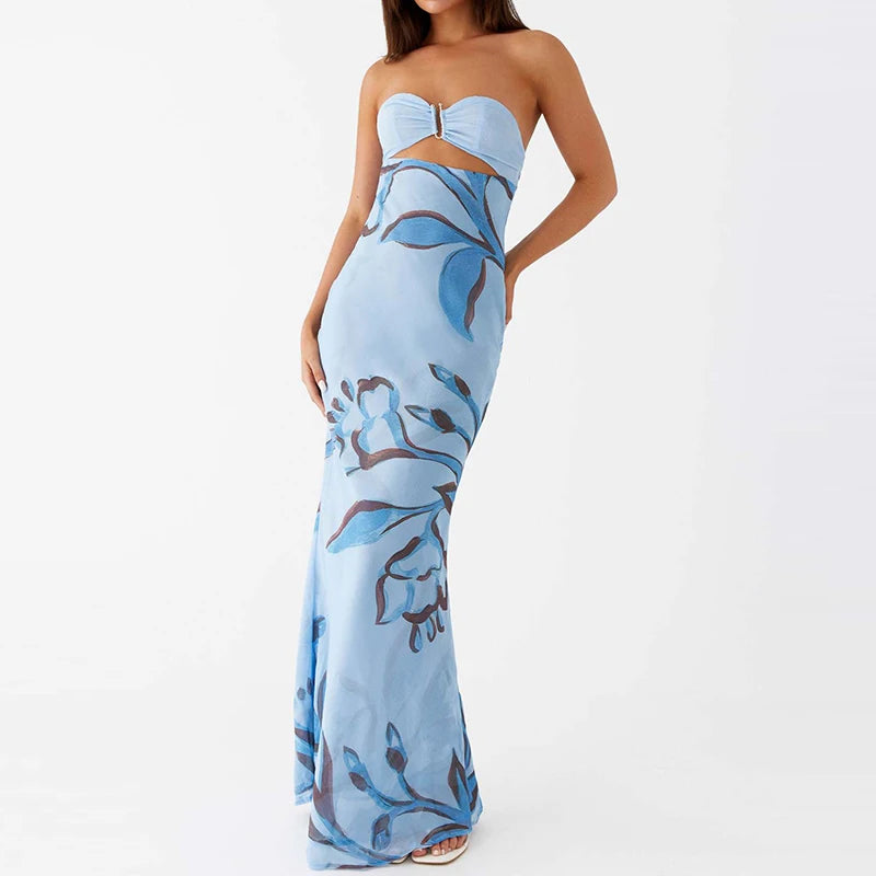 MQTIME - Flower Print Patchwork Strapless Evening Dress Lady Casual Off Shoulder High Waist Party Dress Elegant Backless Slim Long Dress