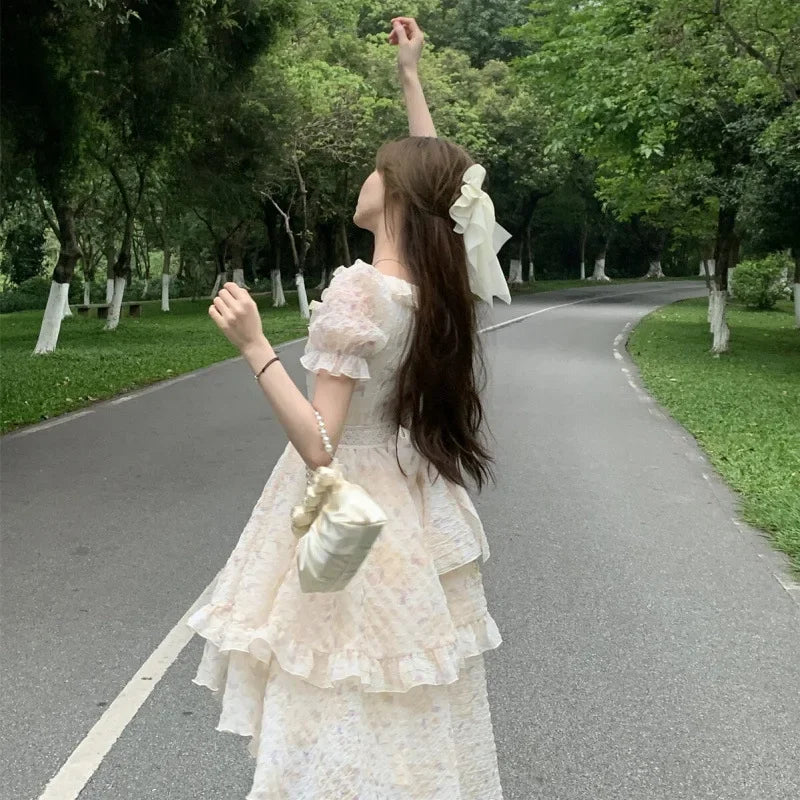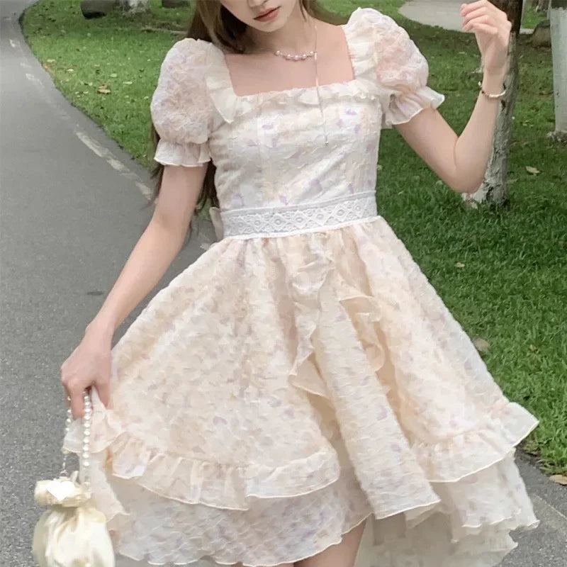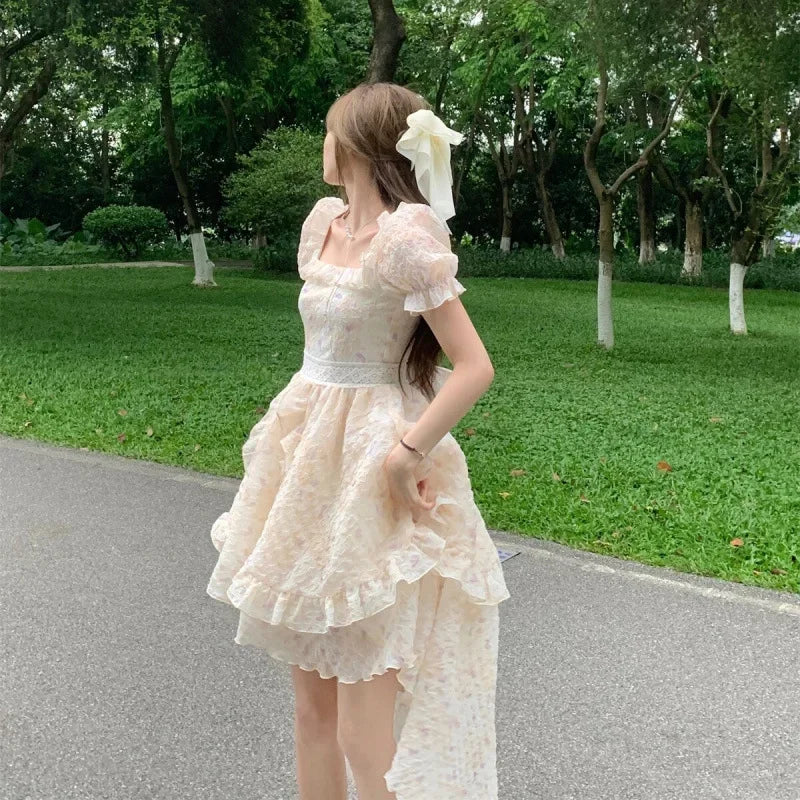 MQTIME  -  French Floral Summer Dress Women's Sweet Waist Cinching Butterfly Knot Puffy Skirt Short Sleeve Mini Dress from Mainland China
