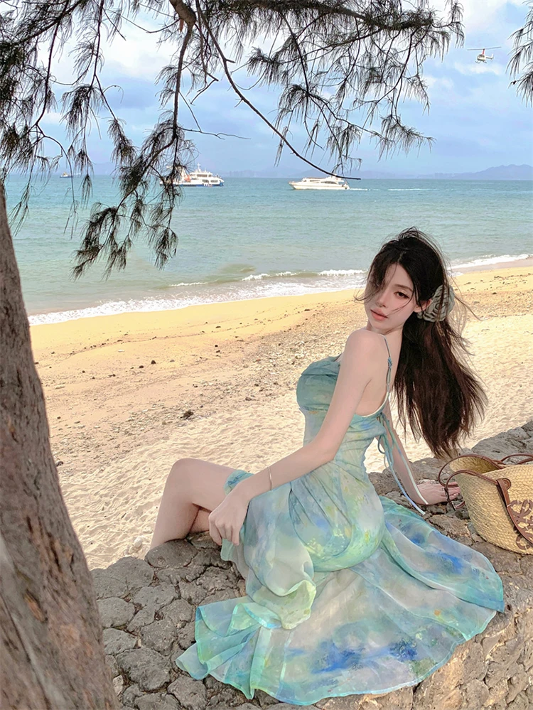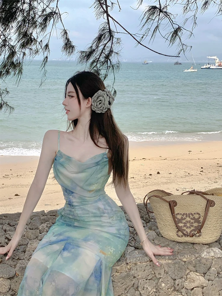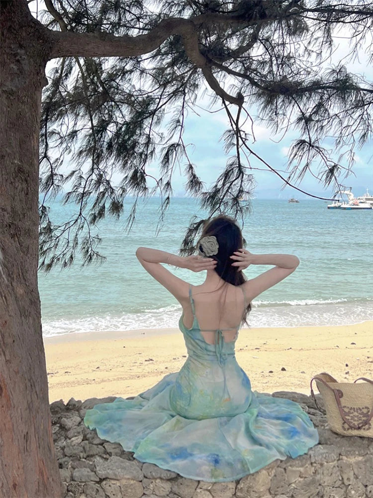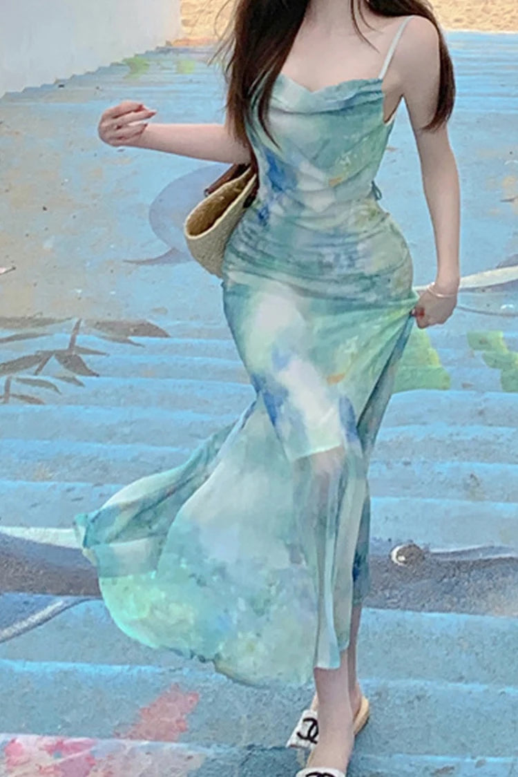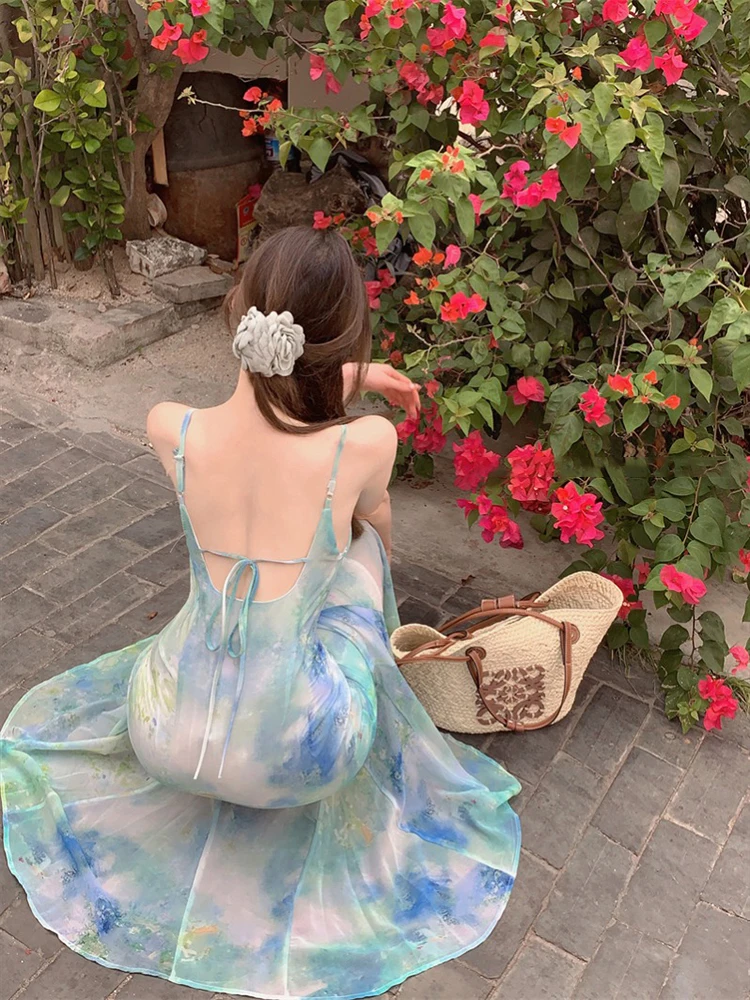 MQTIME  -  French tie dyed flower suspender chiffon dress for women's summer vacation dress backless fishtail dress