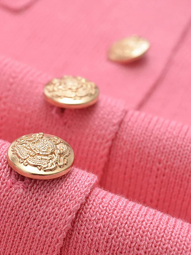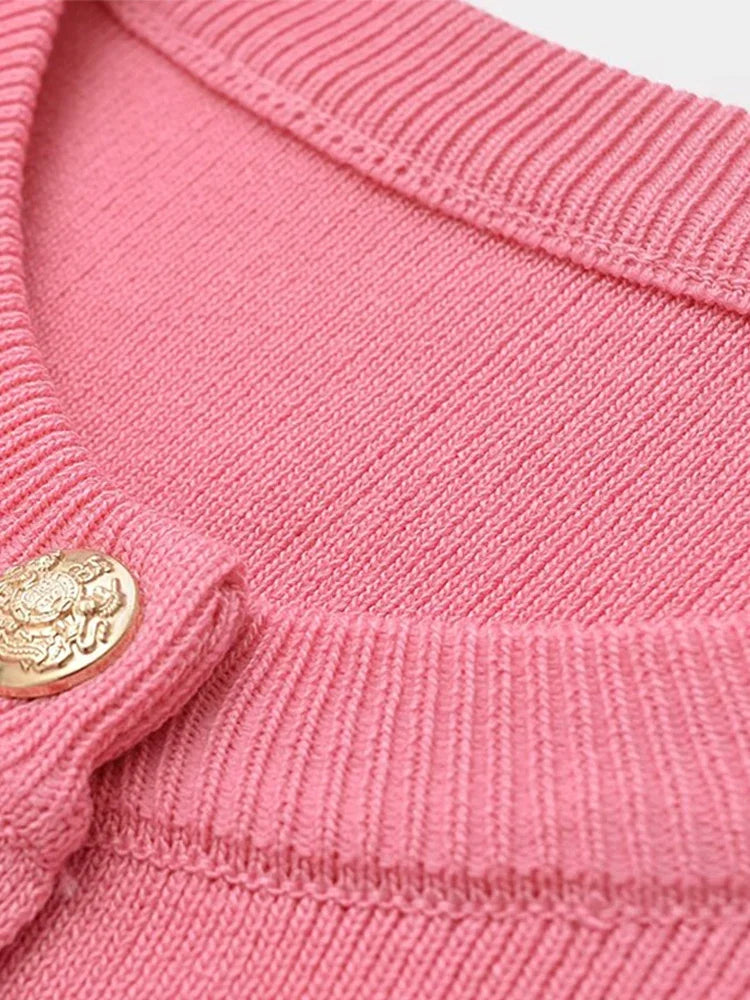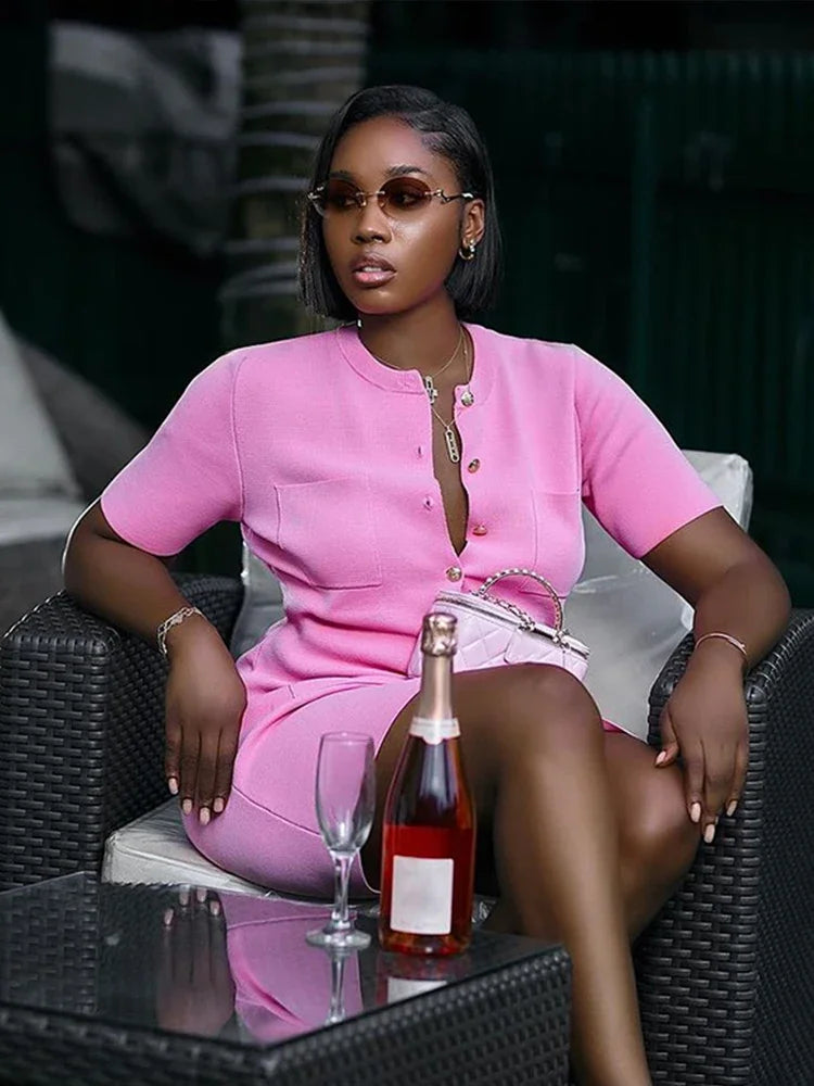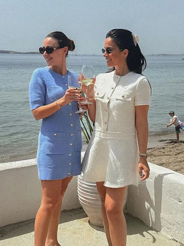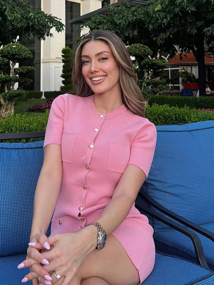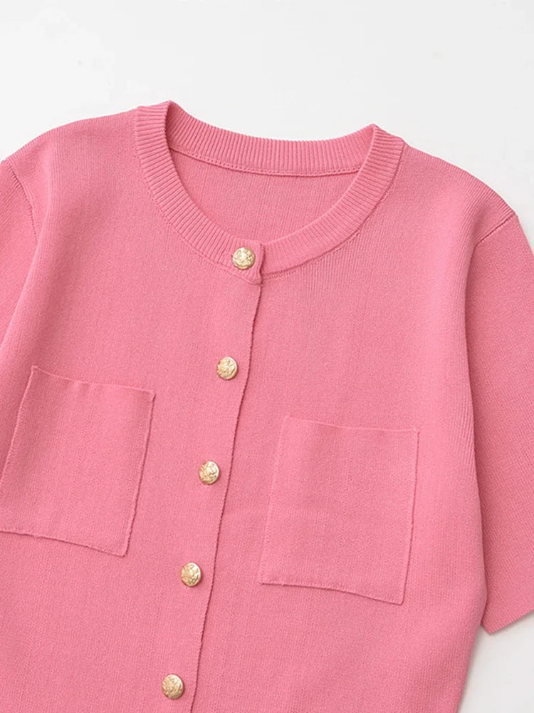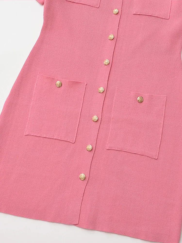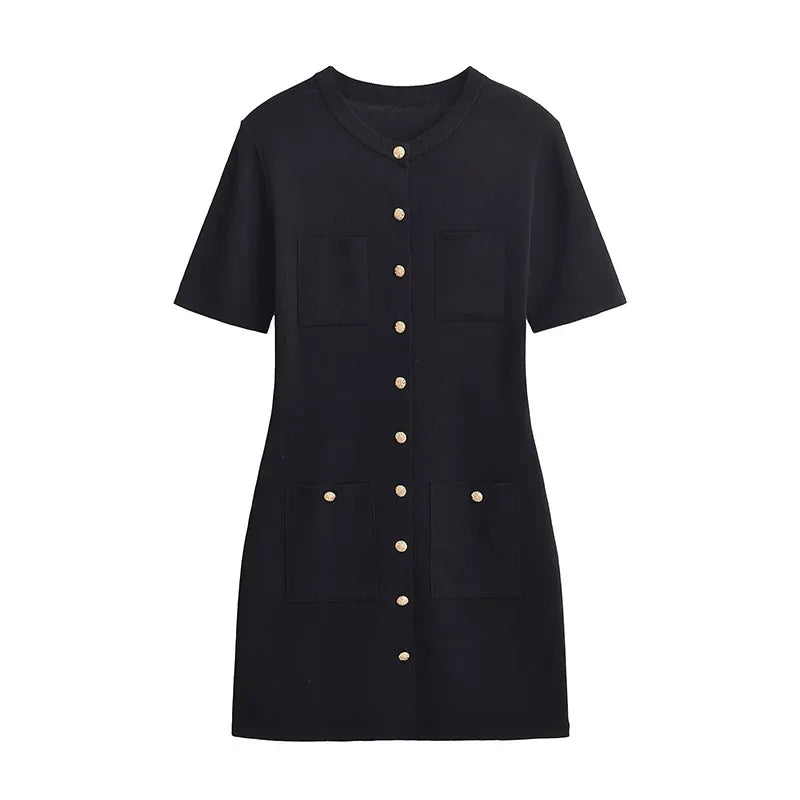MQTIME - Gold Button Pocket Knitted Short Dresses Solid Color Round Neck French Simple Slimming Fashion Single Breasted Straight Dress
