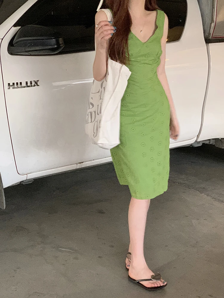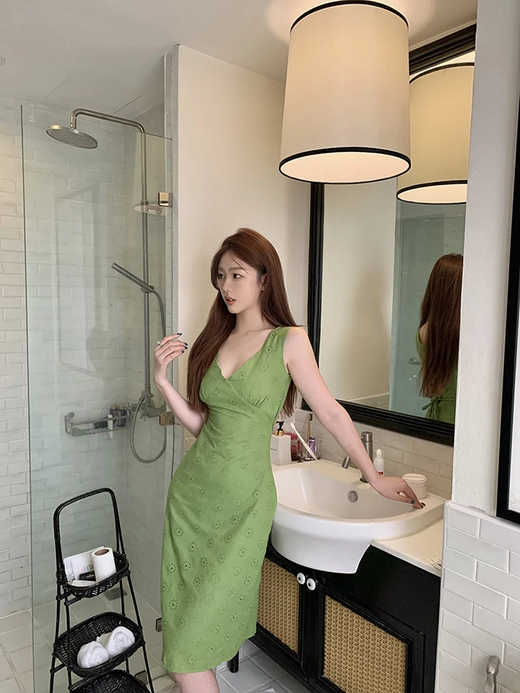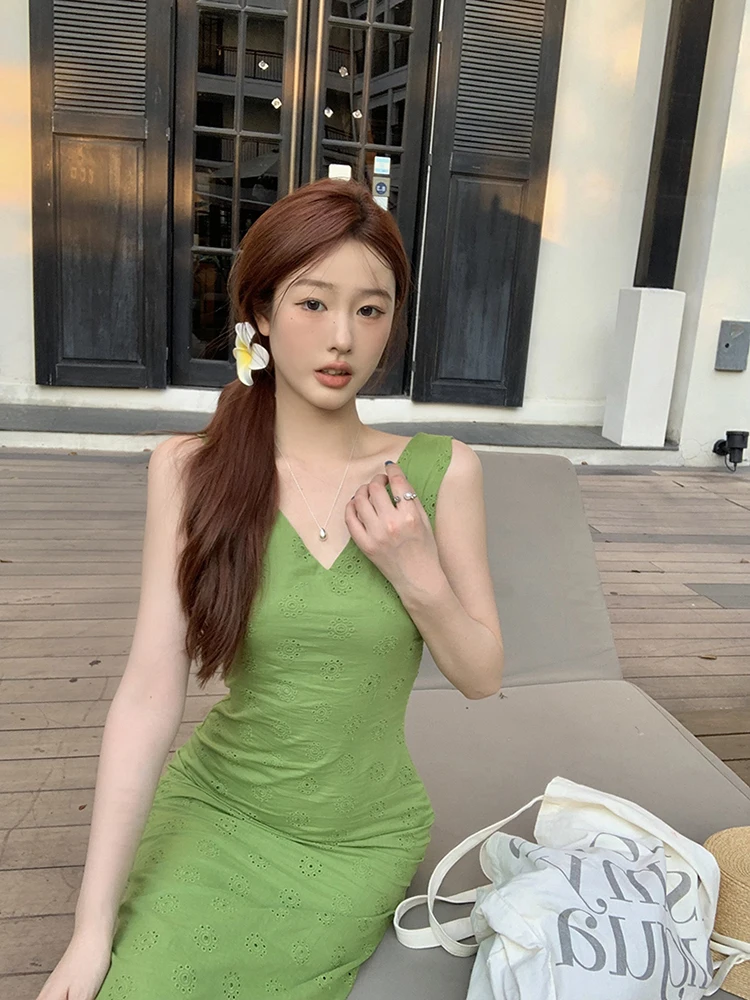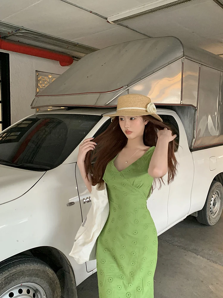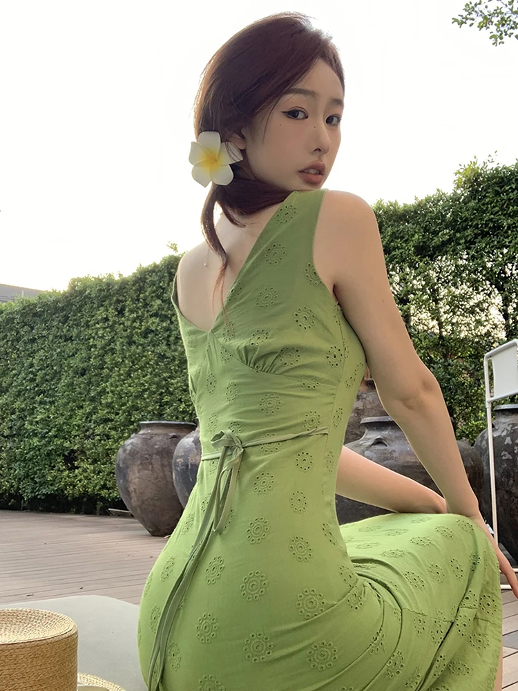 MQTIME - Green hollow V-neck suspender dress for women's summer sexy long Dress tie up wrap around buttocks Dress