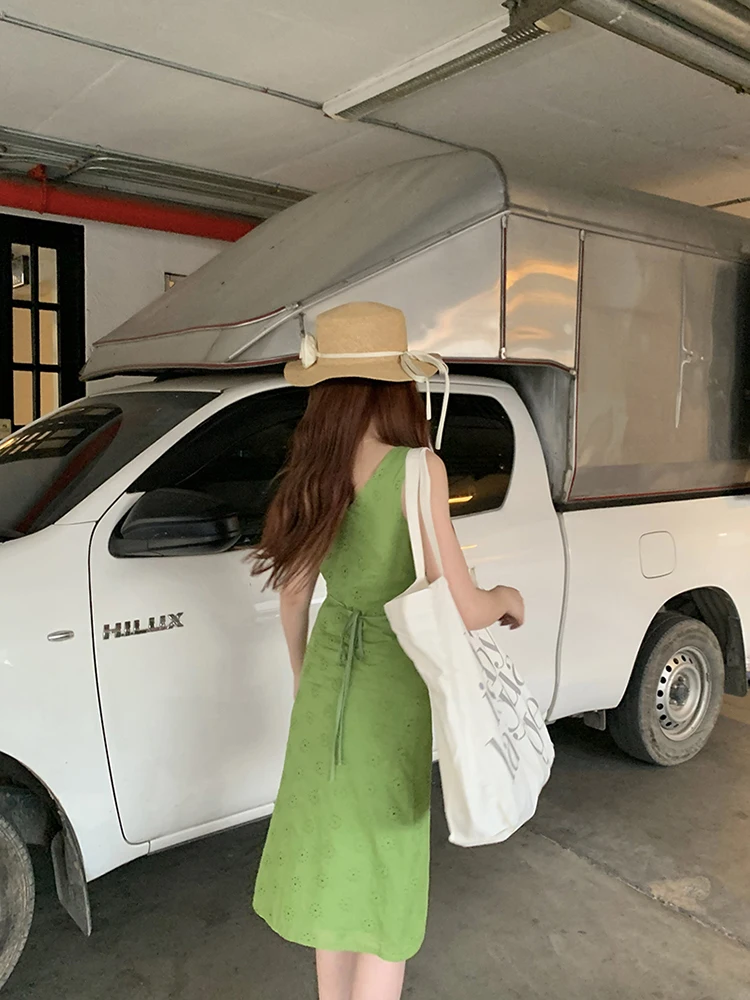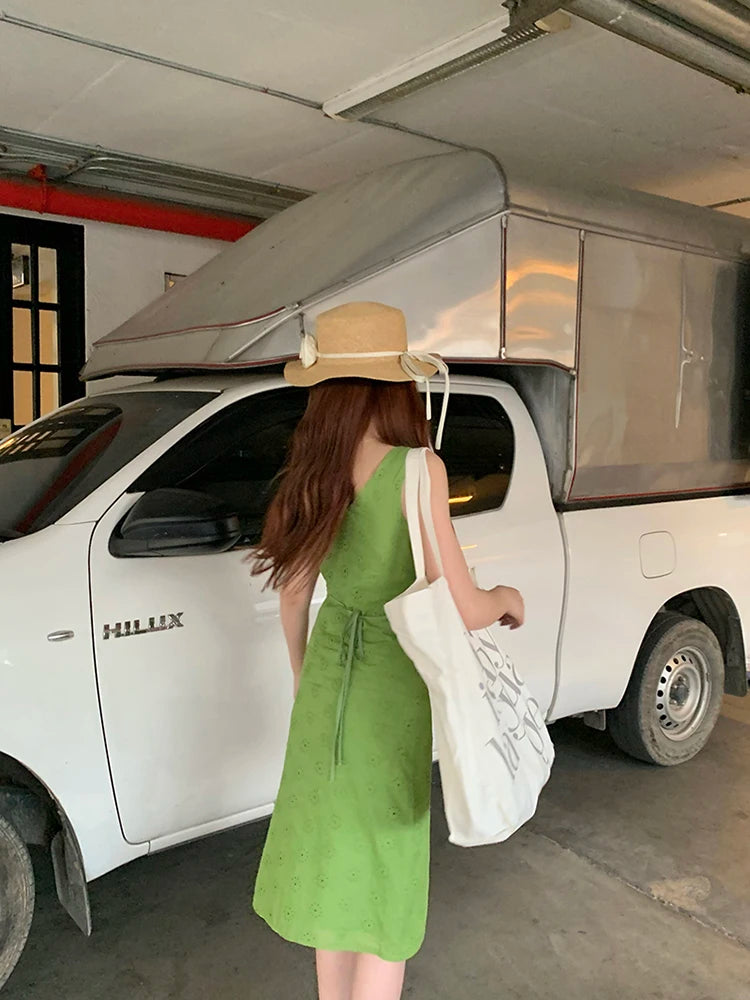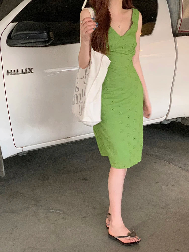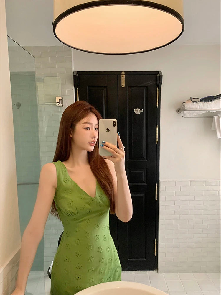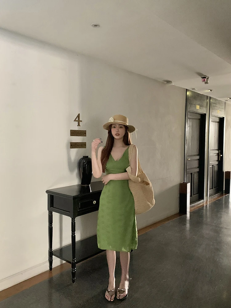 MQTIME - Green hollow V-neck suspender dress for women's summer sexy long Dress tie up wrap around buttocks Dress