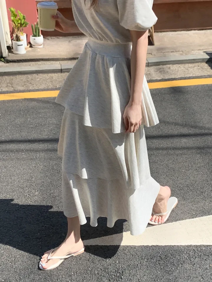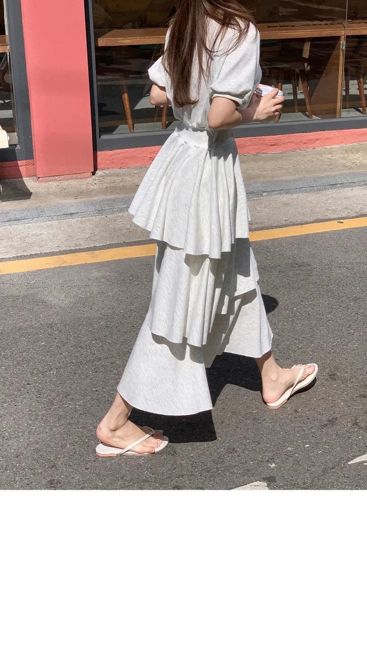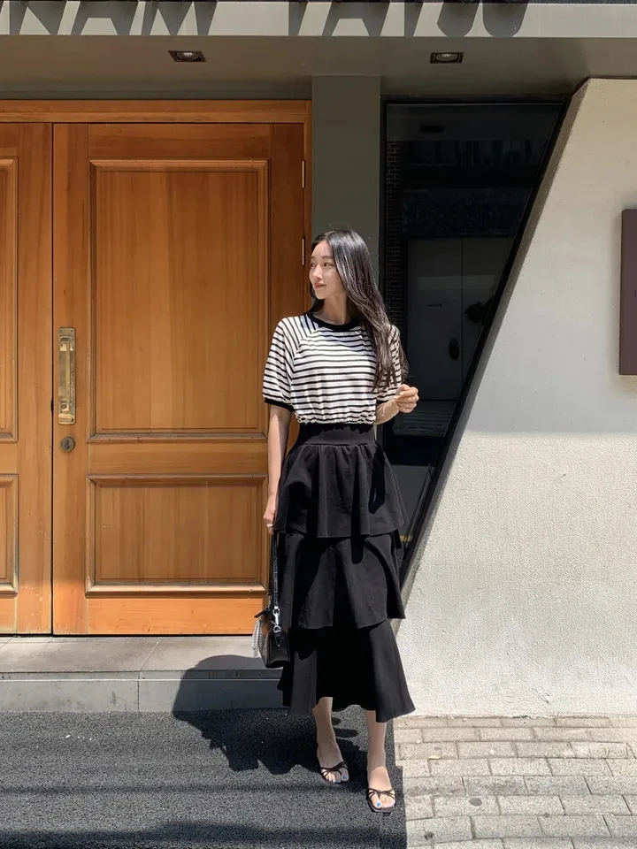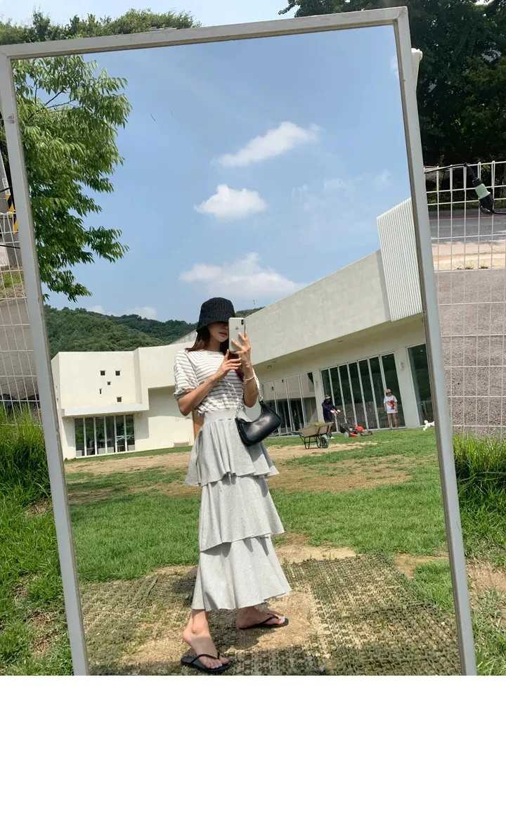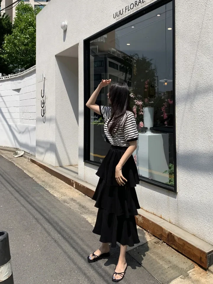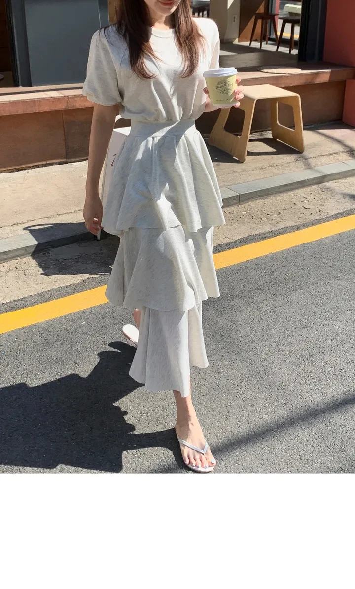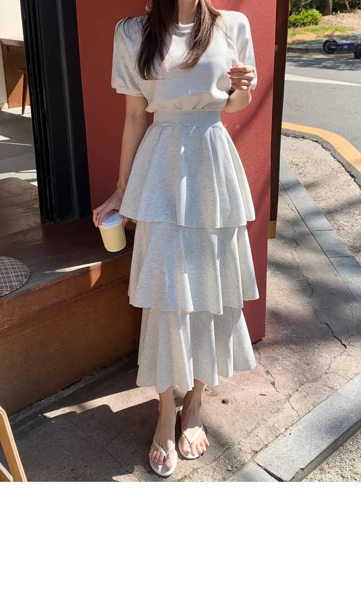 MQTIME - Korean Style Summer Women's Dress Lady Stretchy Tiered Dress for Travel Female Ruffled Hem Knitted Midi Dress Sweet Cake Dresses