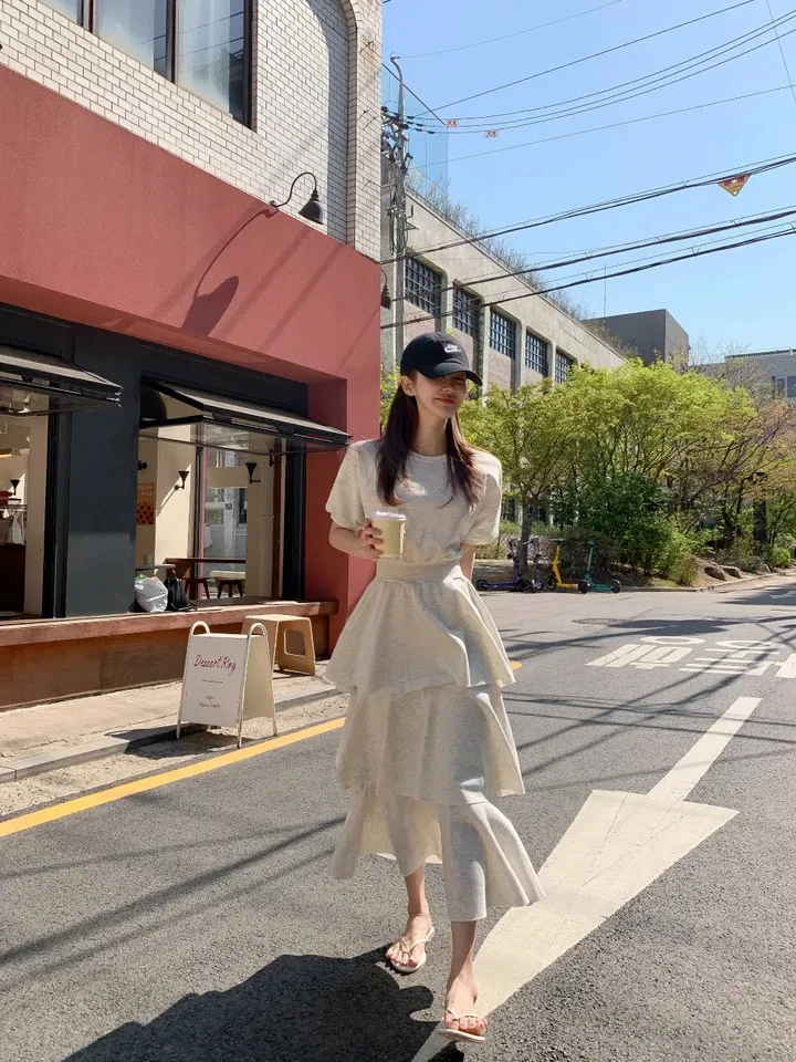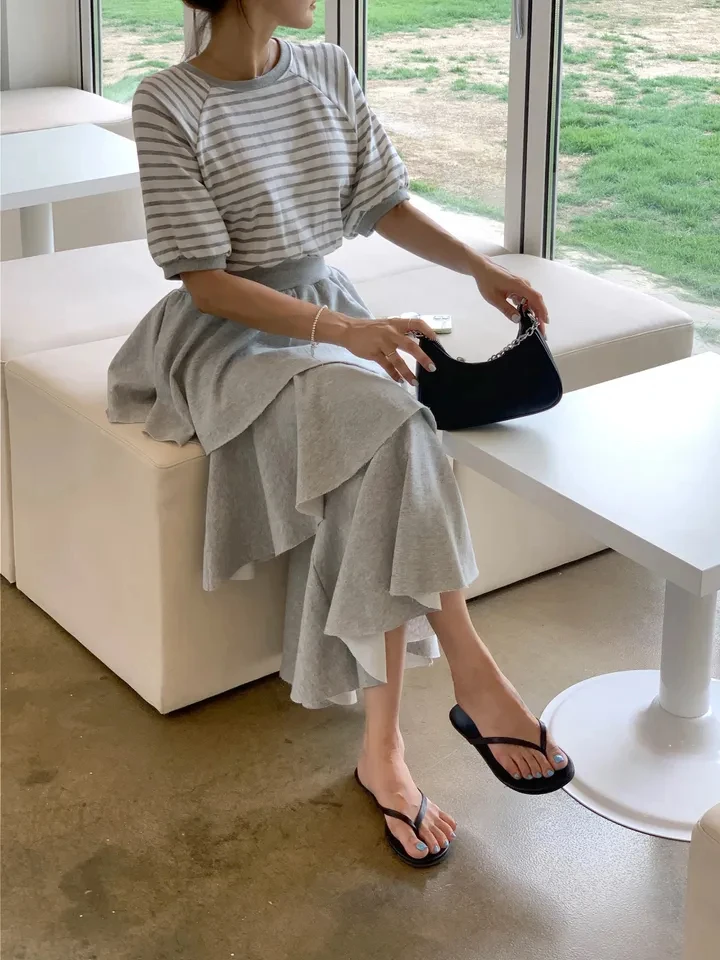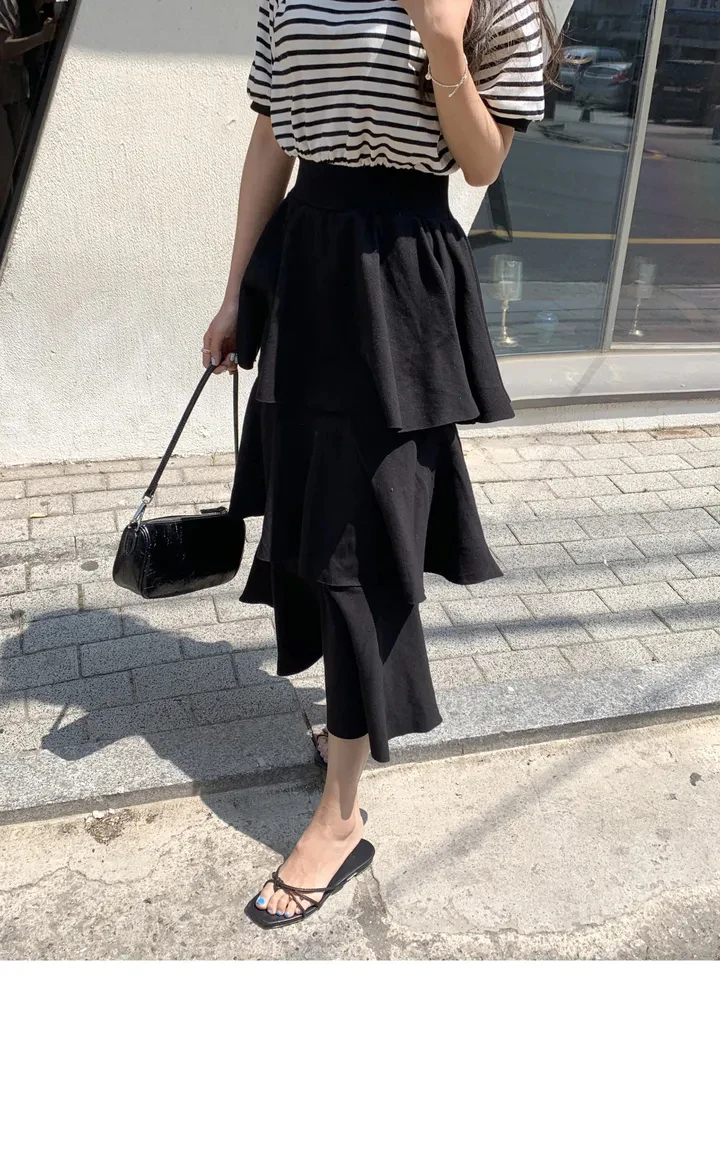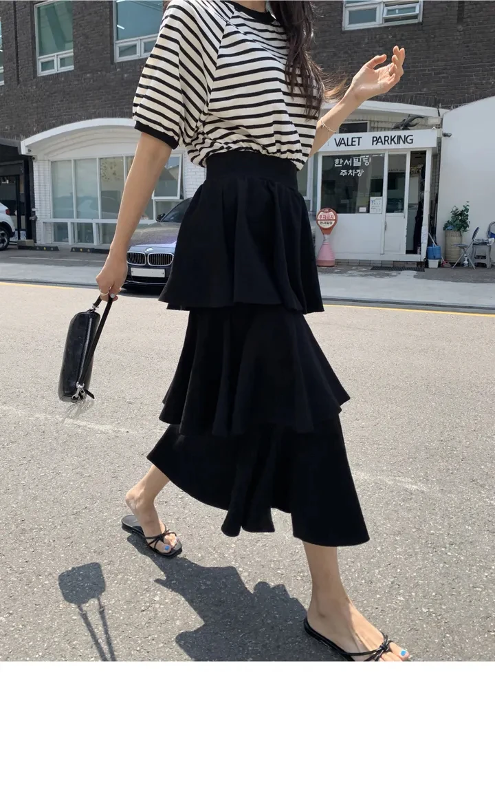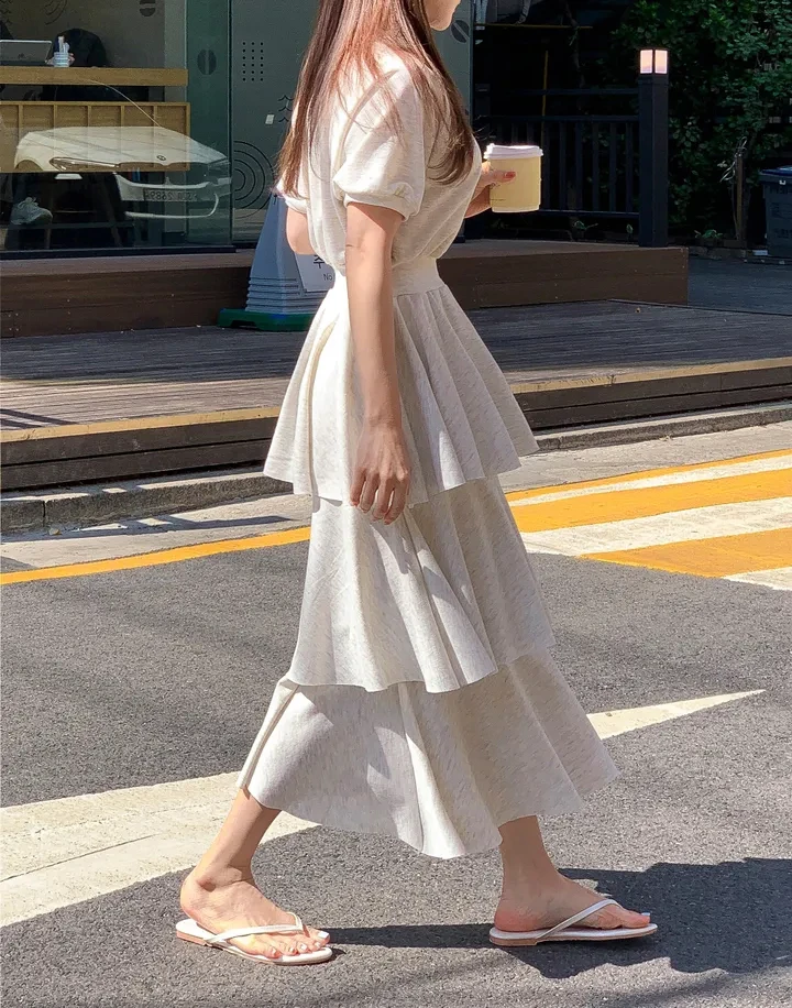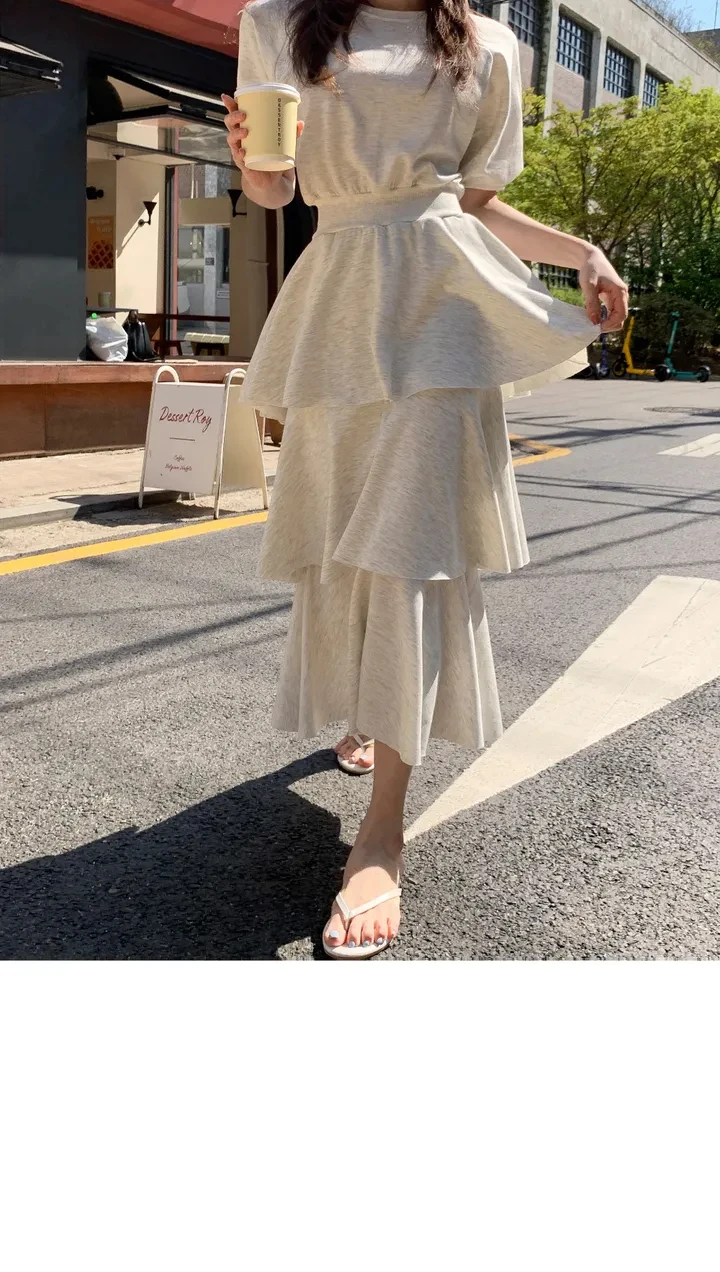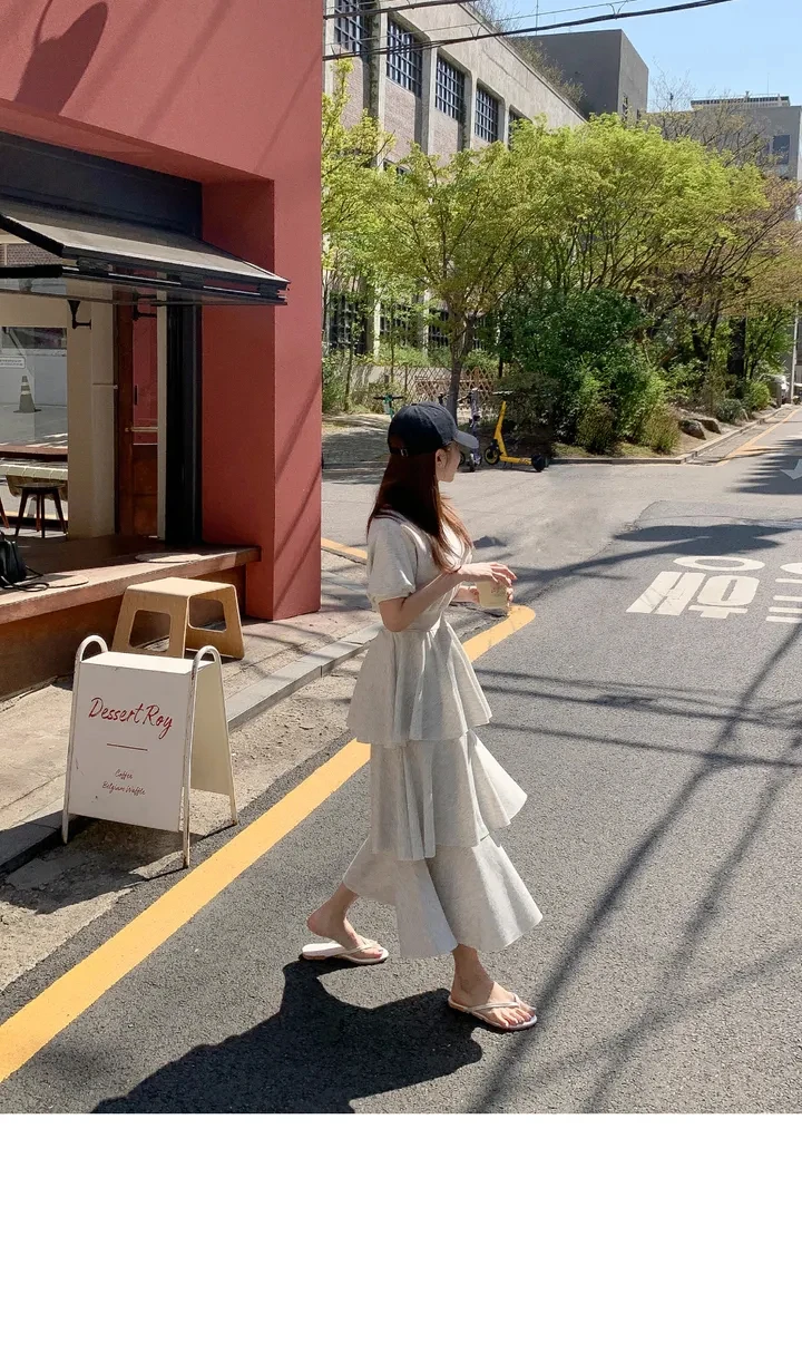 MQTIME - Korean Style Summer Women's Dress Lady Stretchy Tiered Dress for Travel Female Ruffled Hem Knitted Midi Dress Sweet Cake Dresses
