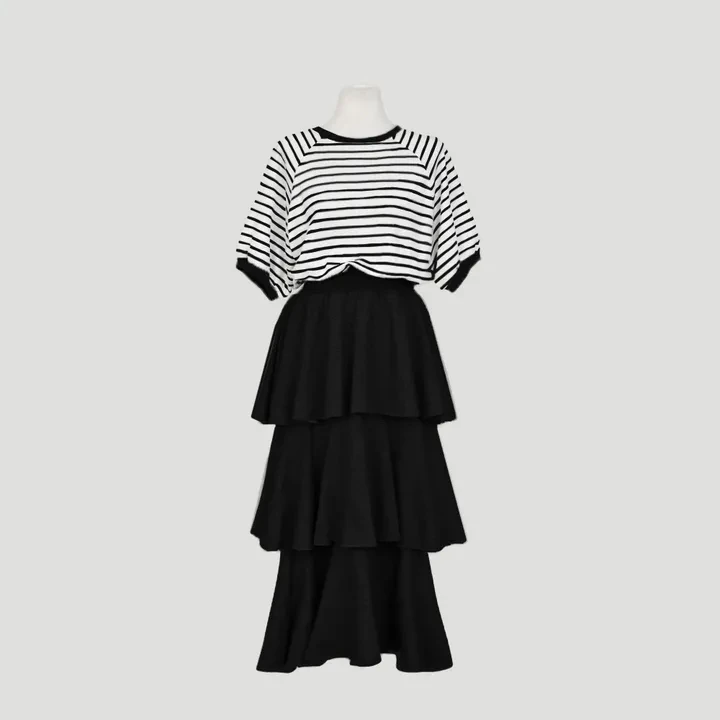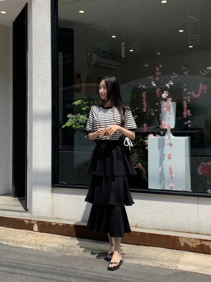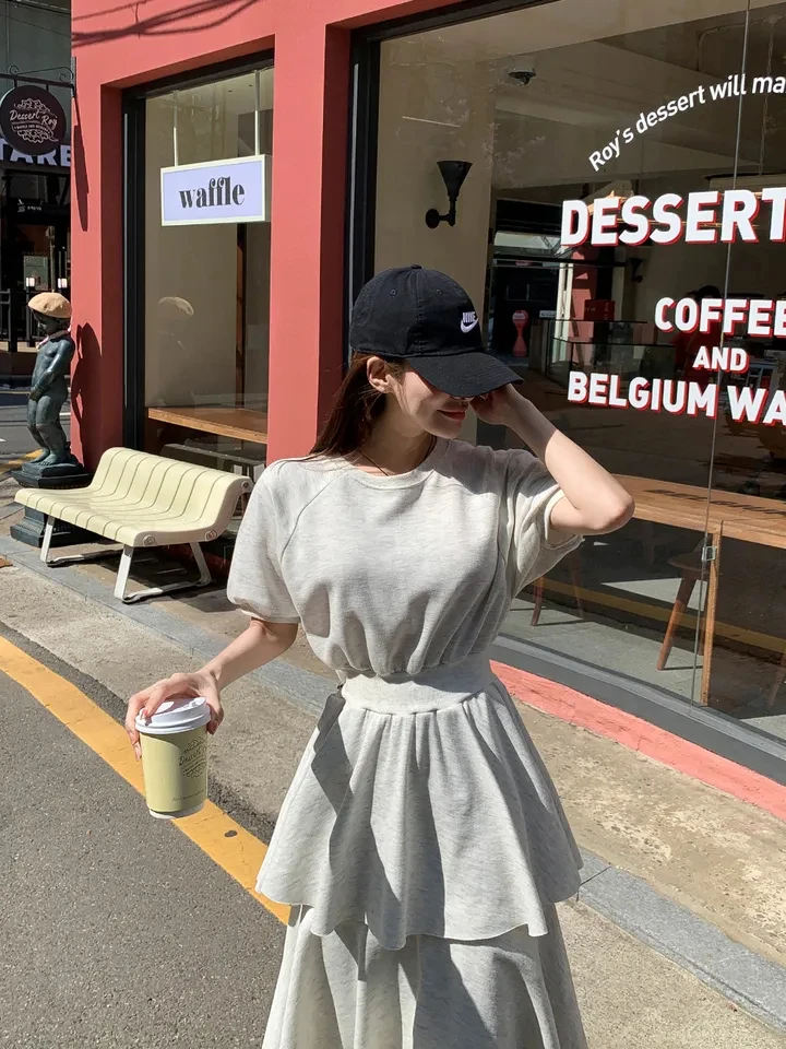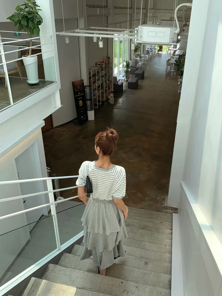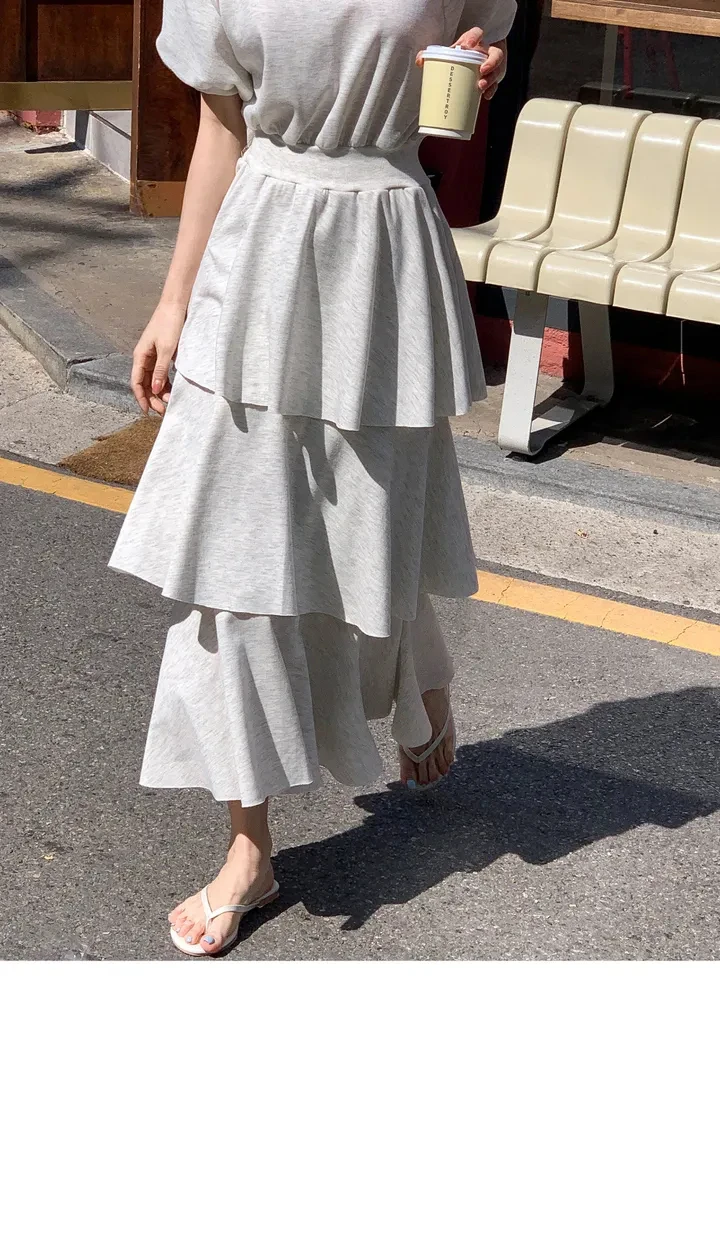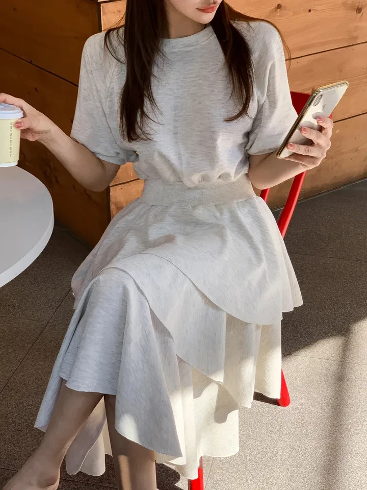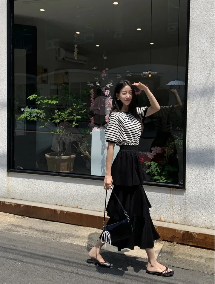MQTIME - Korean Style Summer Women's Dress Lady Stretchy Tiered Dress for Travel Female Ruffled Hem Knitted Midi Dress Sweet Cake Dresses