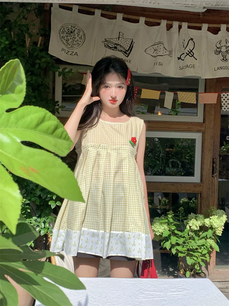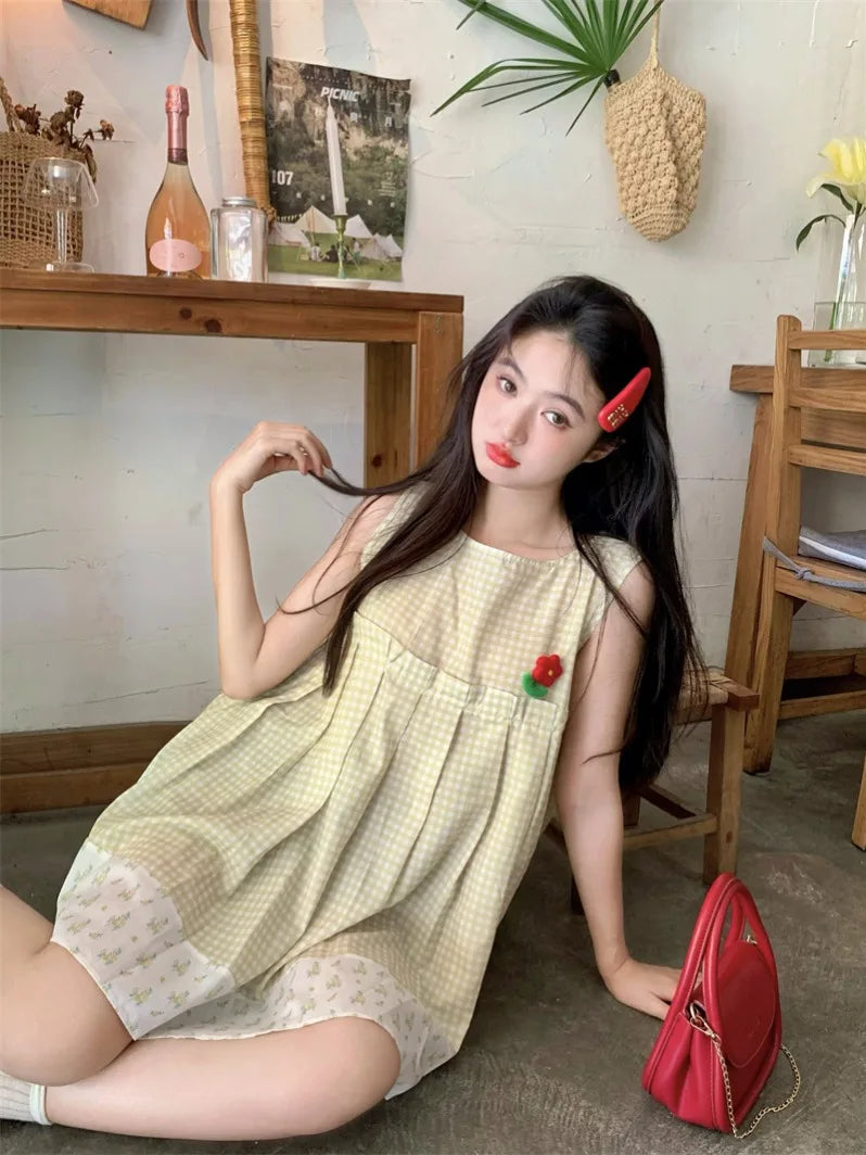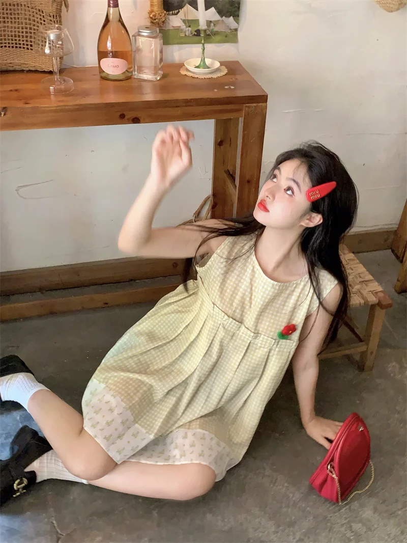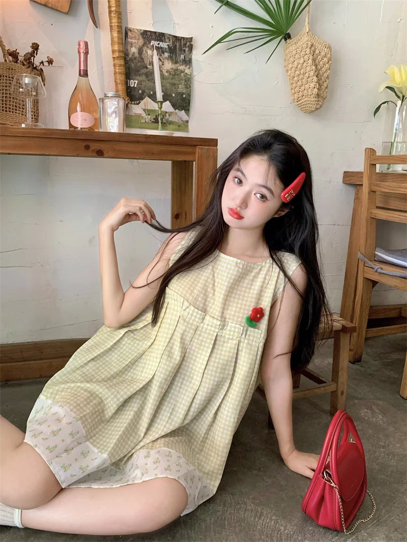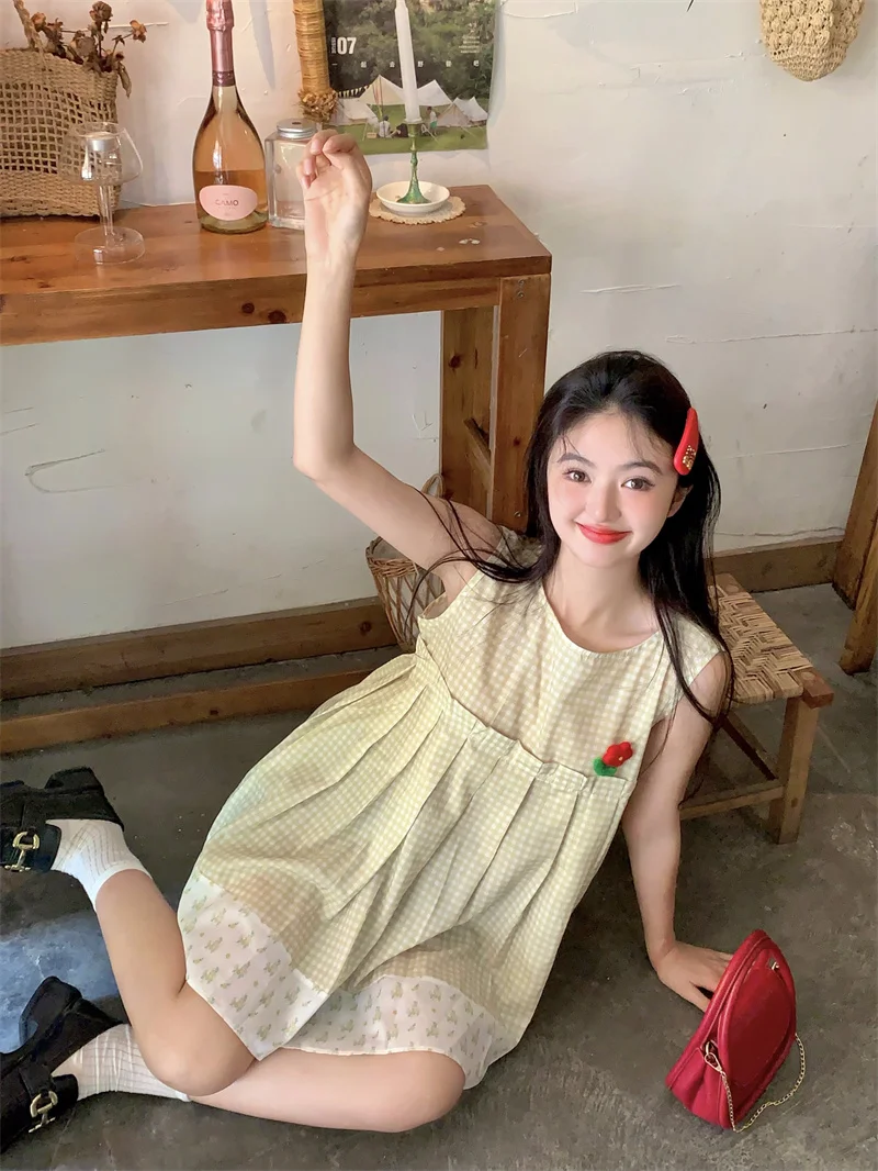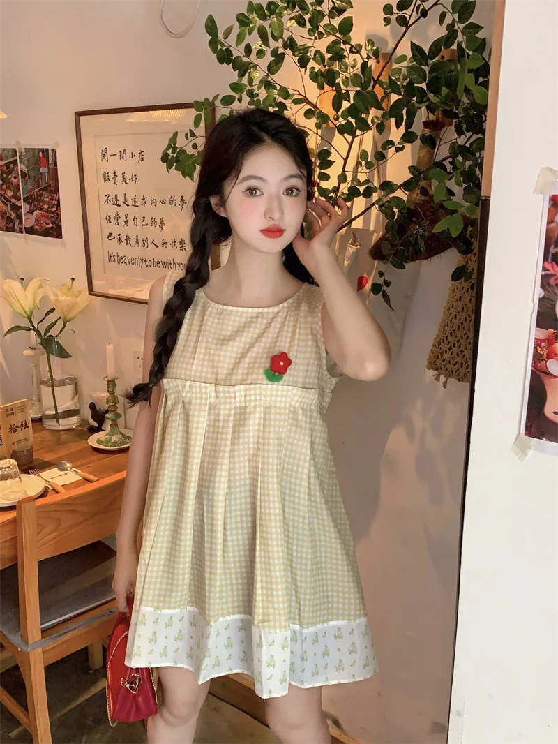 MQTIME - Korean Style Sweet Female College Students Dress Fashion Floral Patchwork Yellow Plaid Sundress Sleeveless Women's Tank Dresses