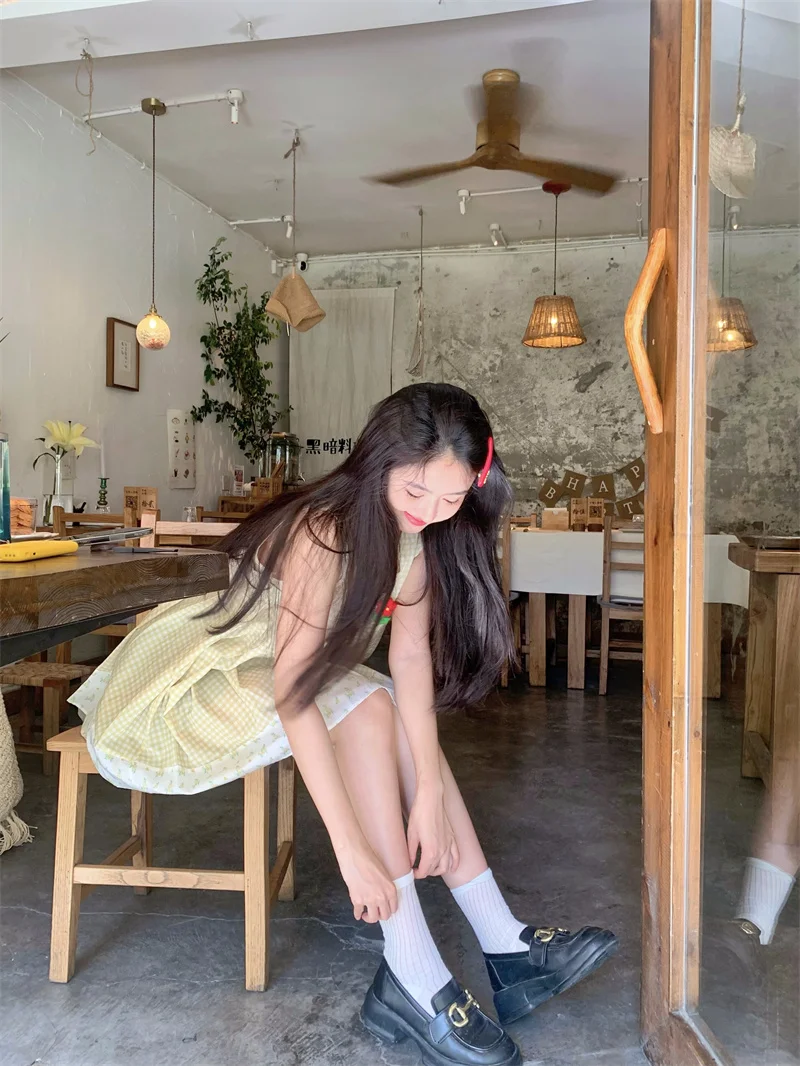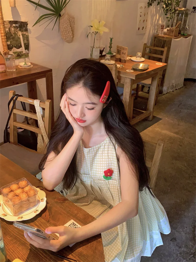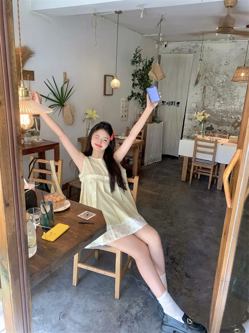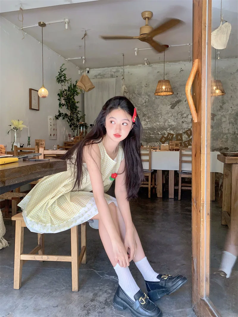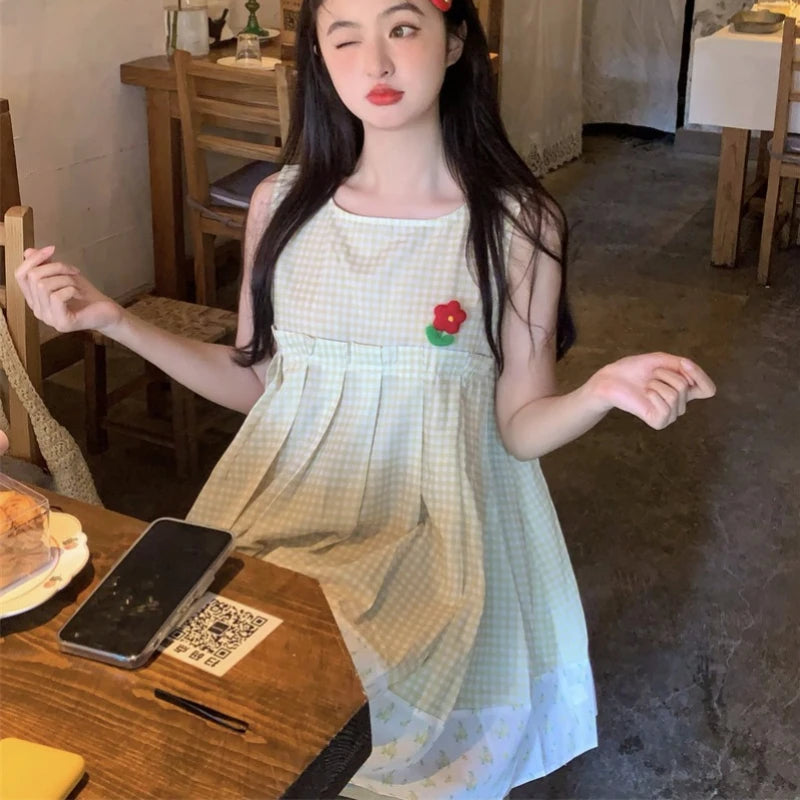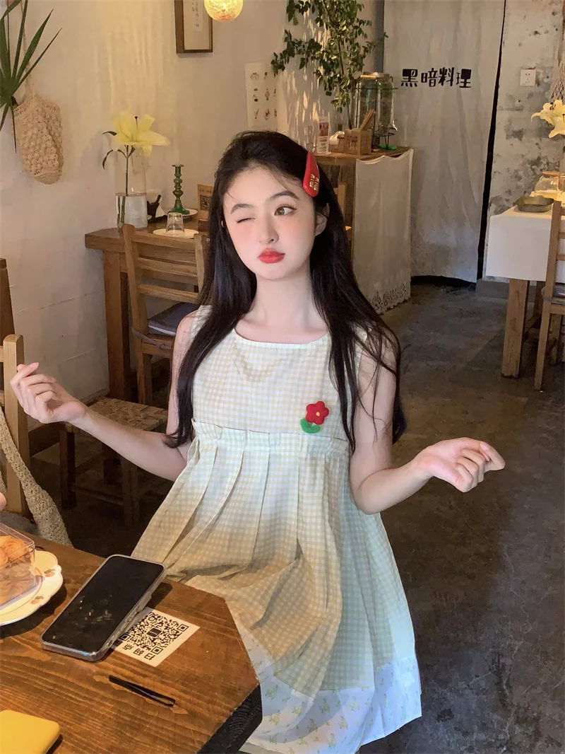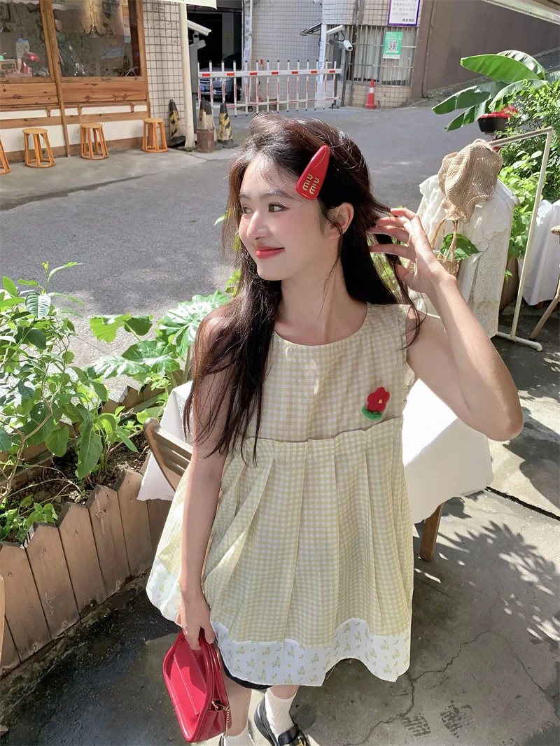 MQTIME - Korean Style Sweet Female College Students Dress Fashion Floral Patchwork Yellow Plaid Sundress Sleeveless Women's Tank Dresses