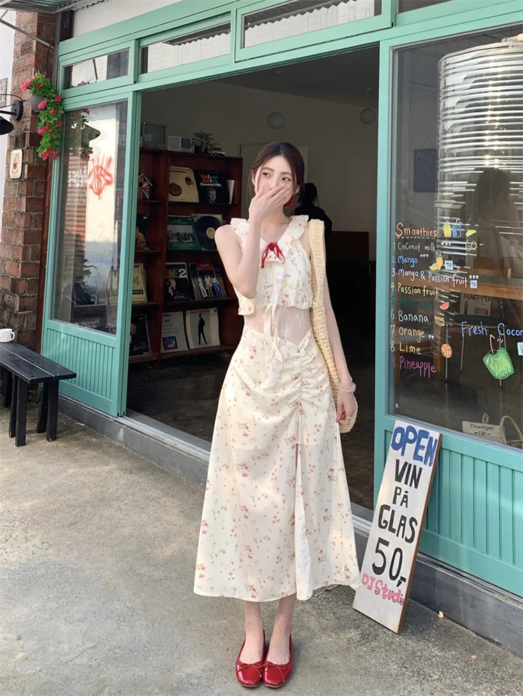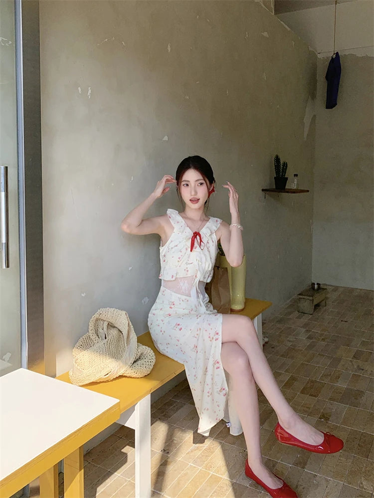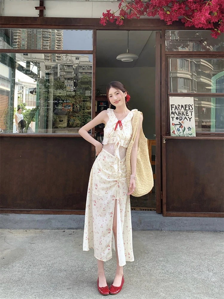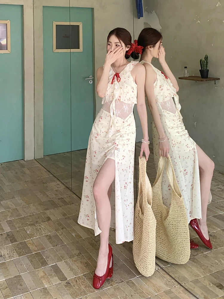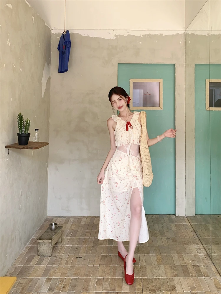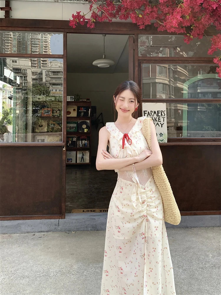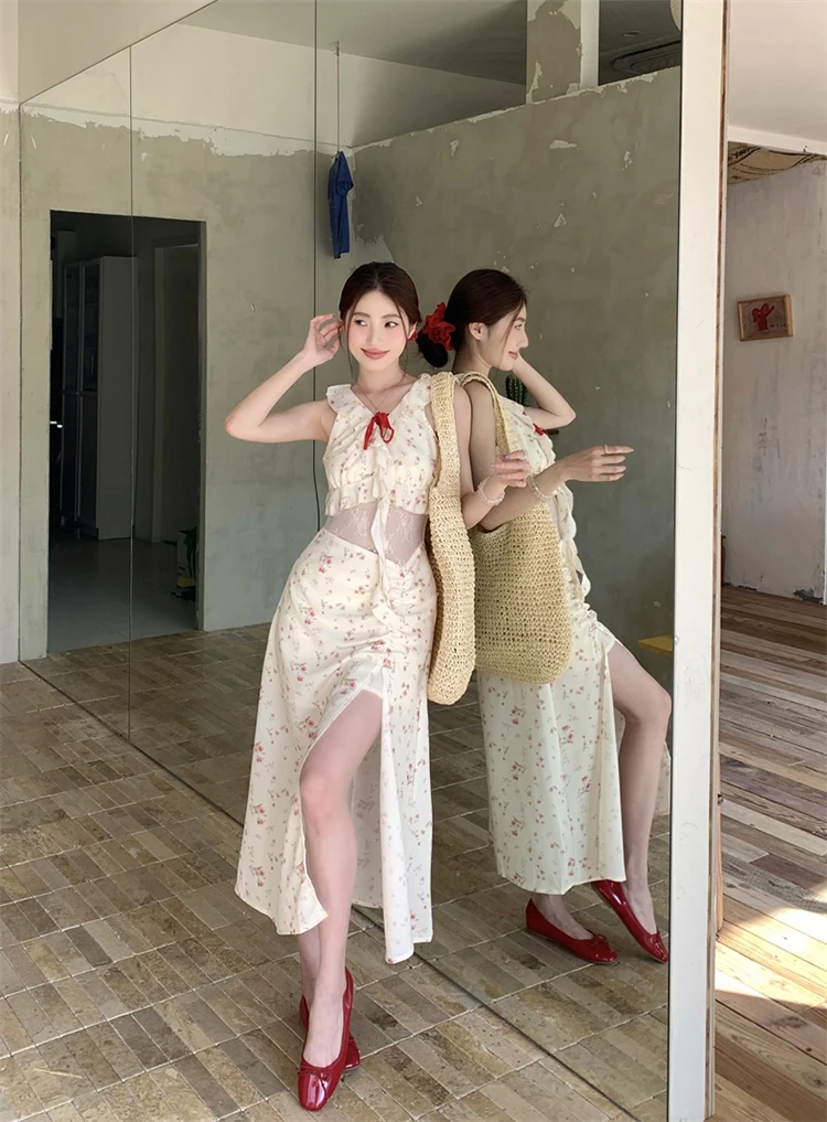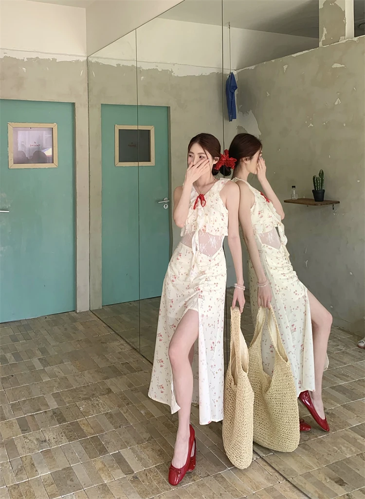 MQTIME - Lace patchwork V-neck sleeveless dress women in summer slim fit floral long dress split waist sweet and spicy hip hugging skirt