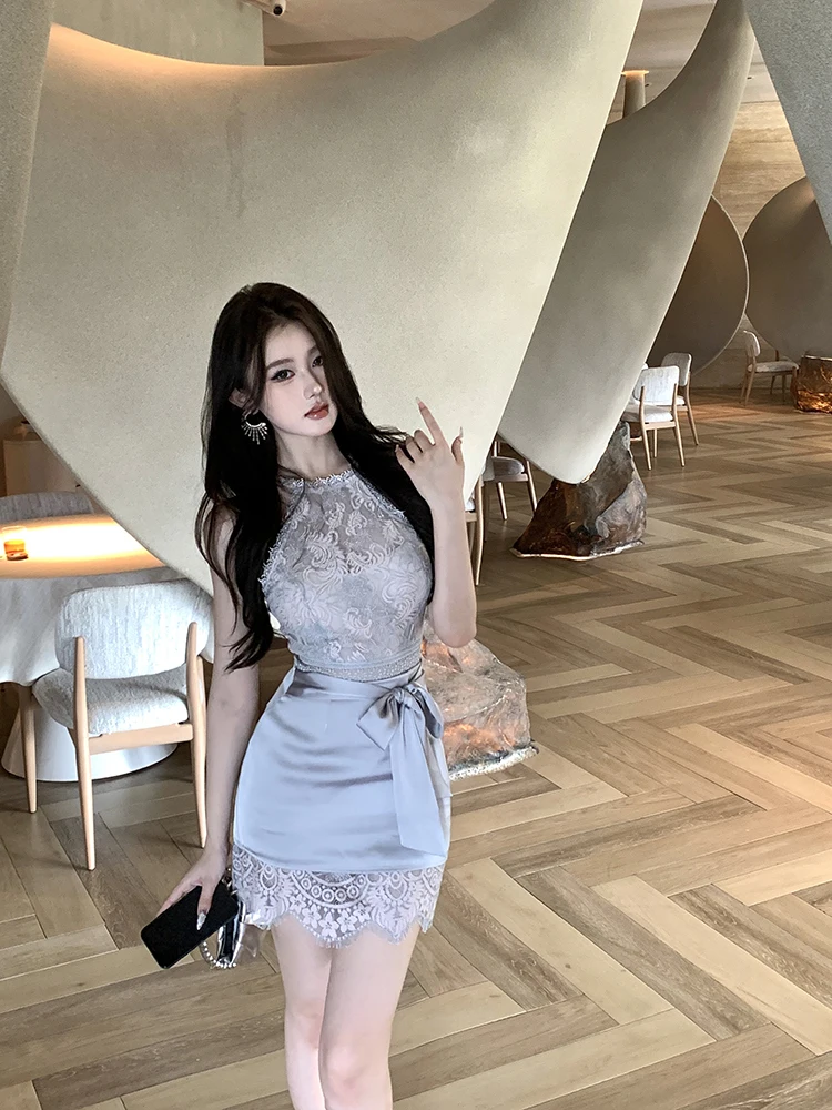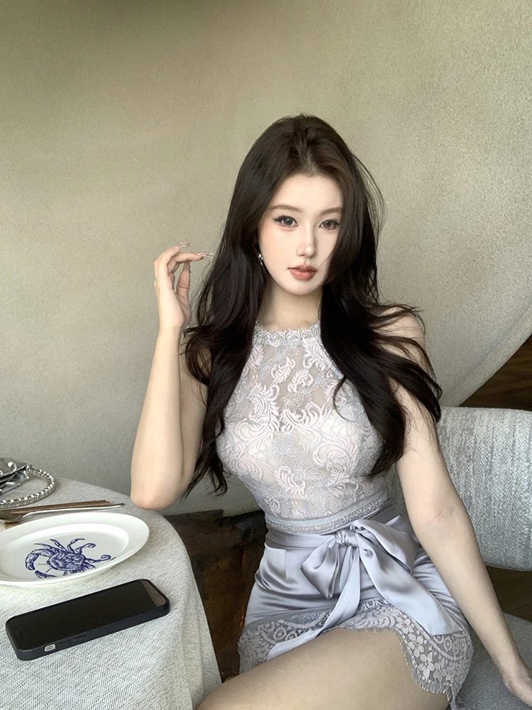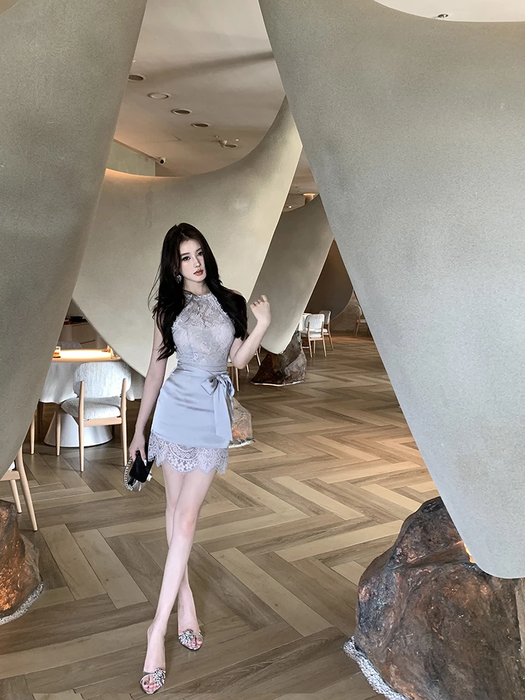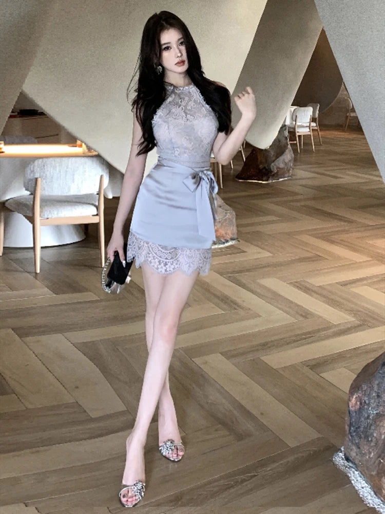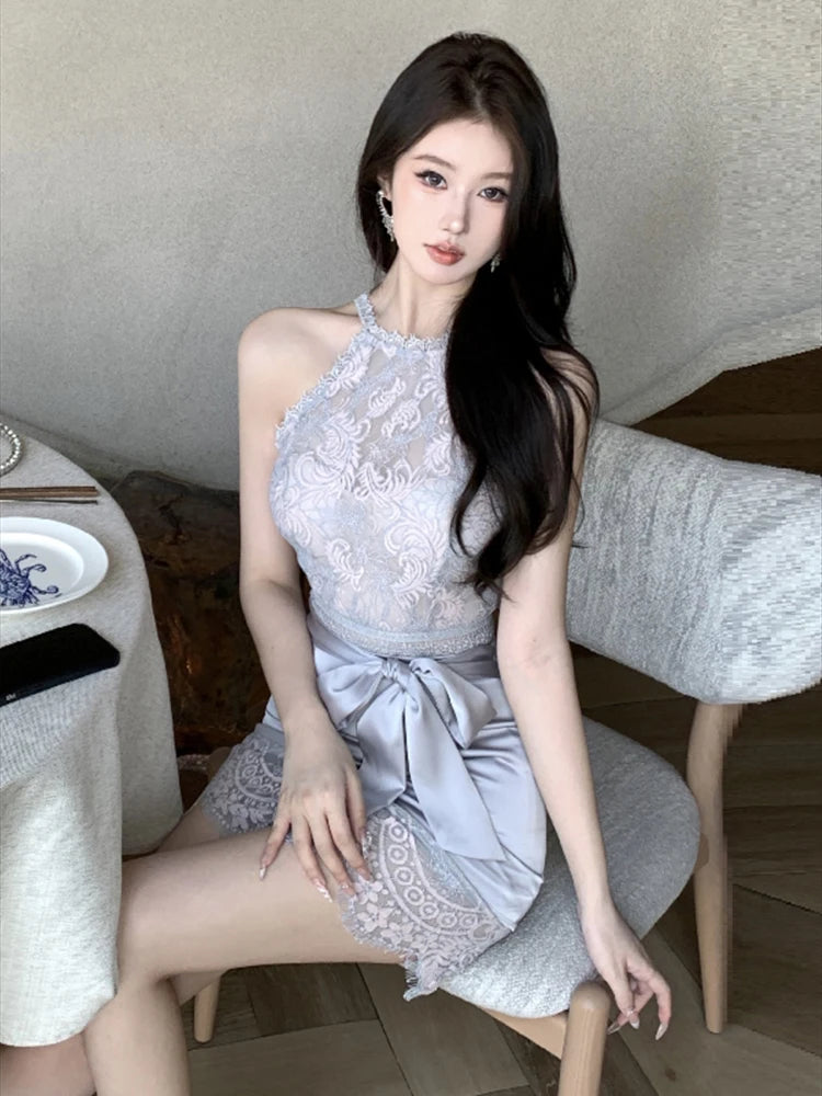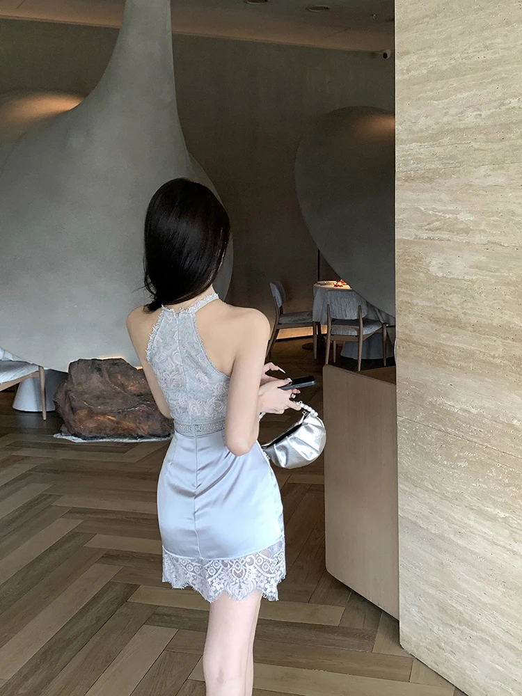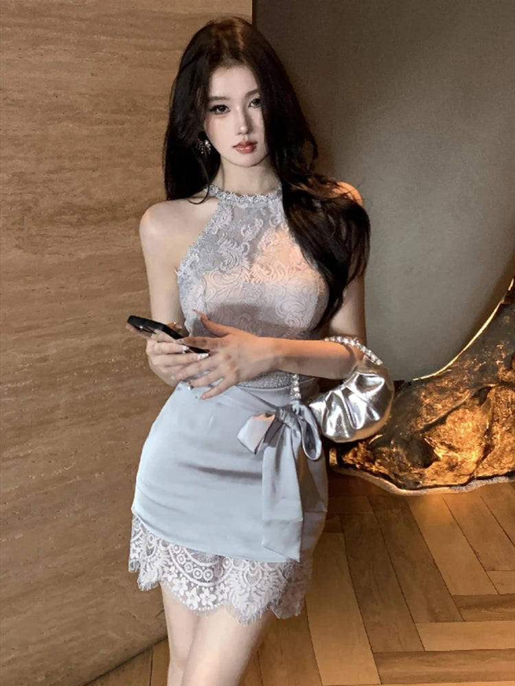 MQTIME - Ladies design sense lace off shoulder dress 2025 New French sexy style high waist slim irregular neck vest Dress