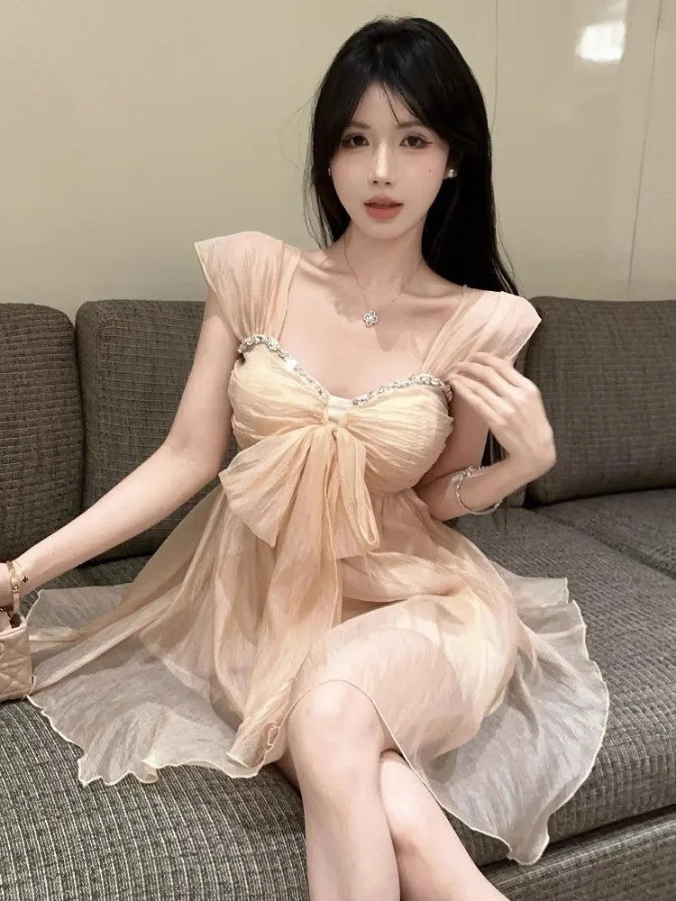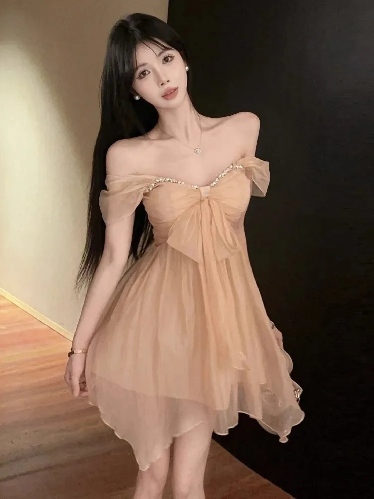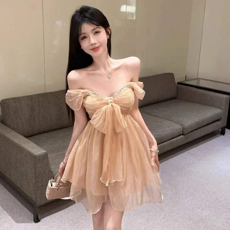 MQTIME - Mini Dresses Women Rhinestone Off Shoulder Bow Slim Backless Irregular Solid Backless Party Dress Elegant Ladies Sweet