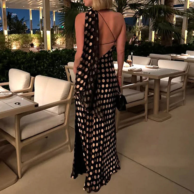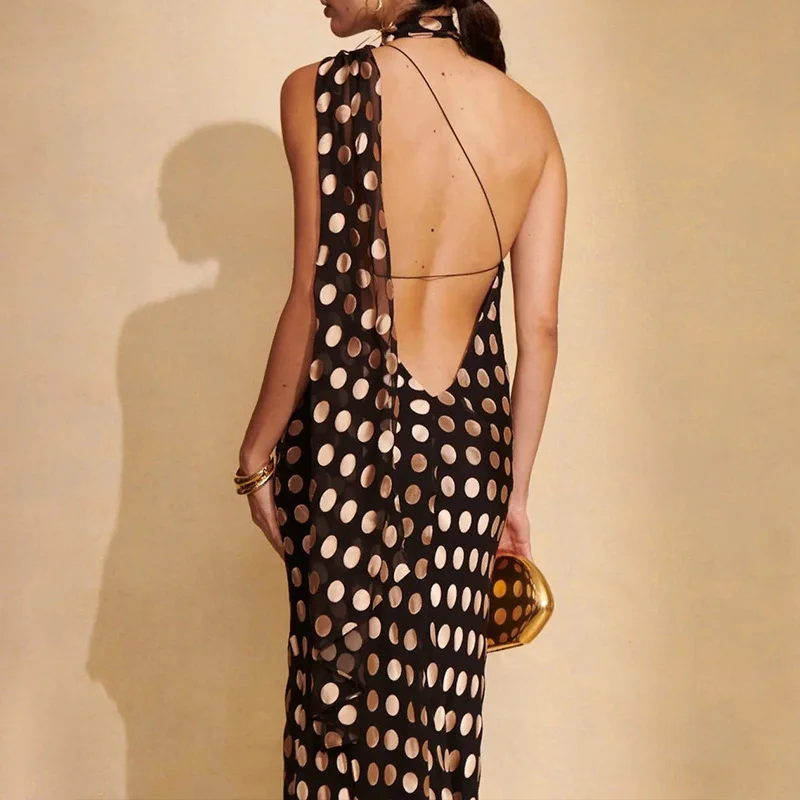 MQTIME - New Polka Dot Print Backless Evening Dress Women Elegant Halter Hollow High Waist Long Dress Fashion Sleeveless Slim Robe Dress