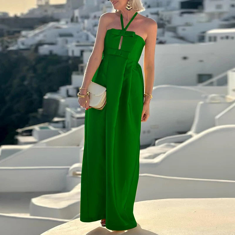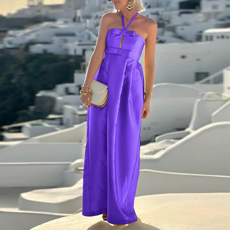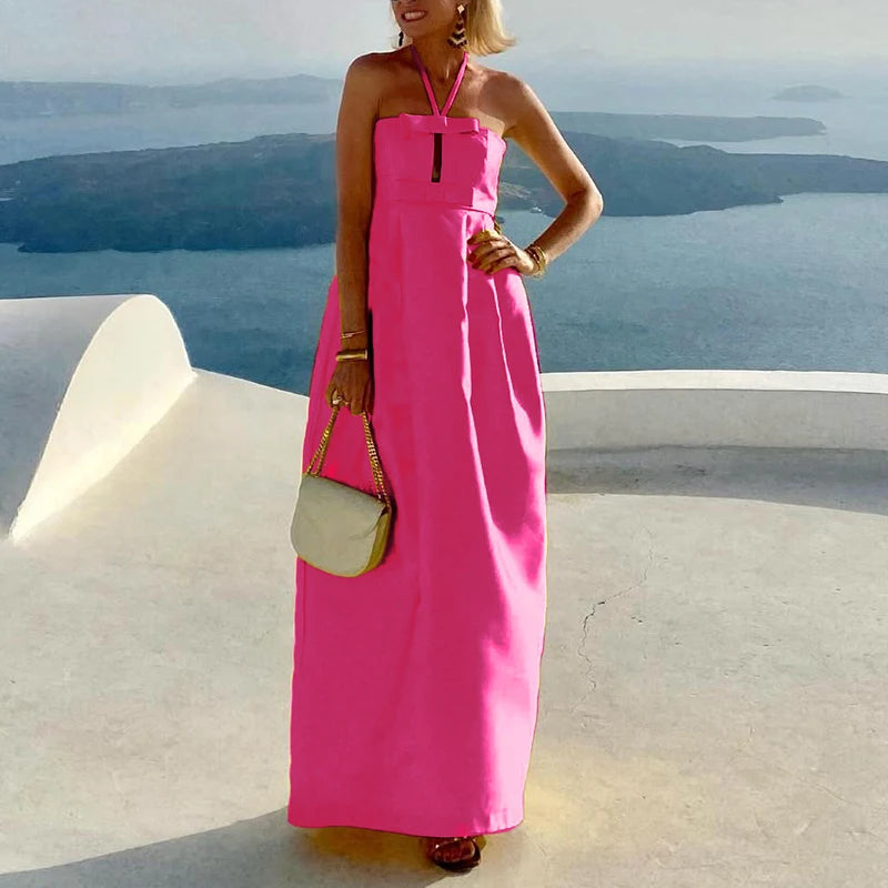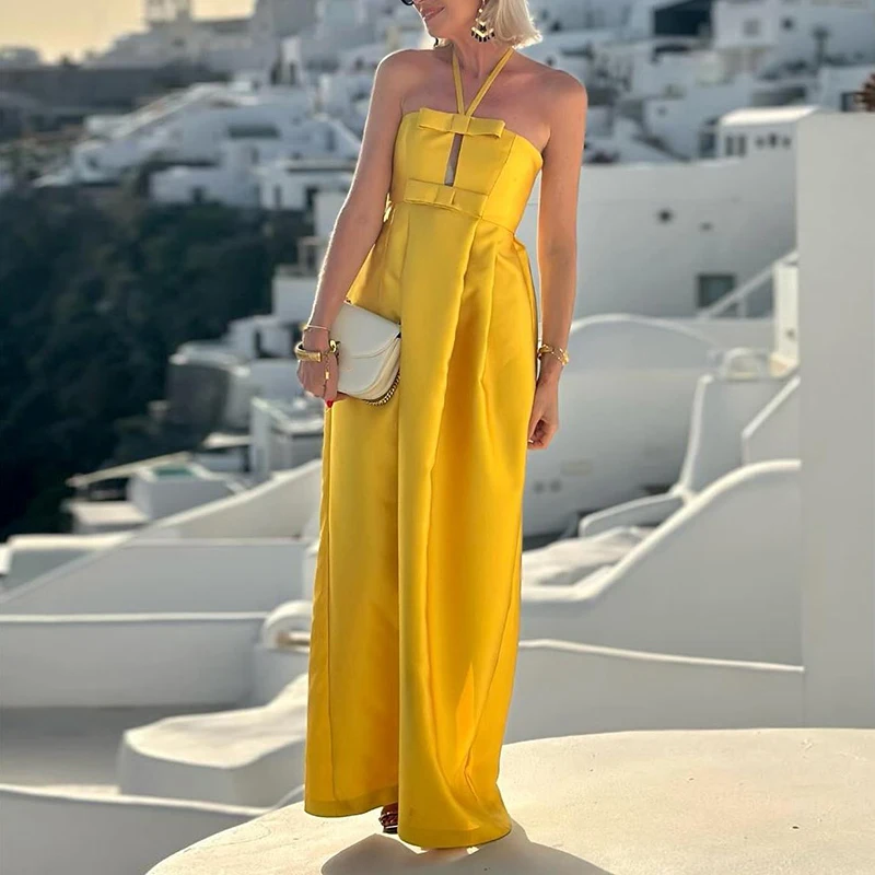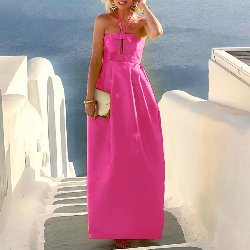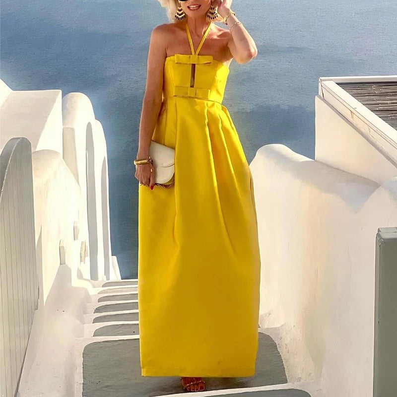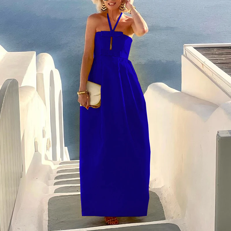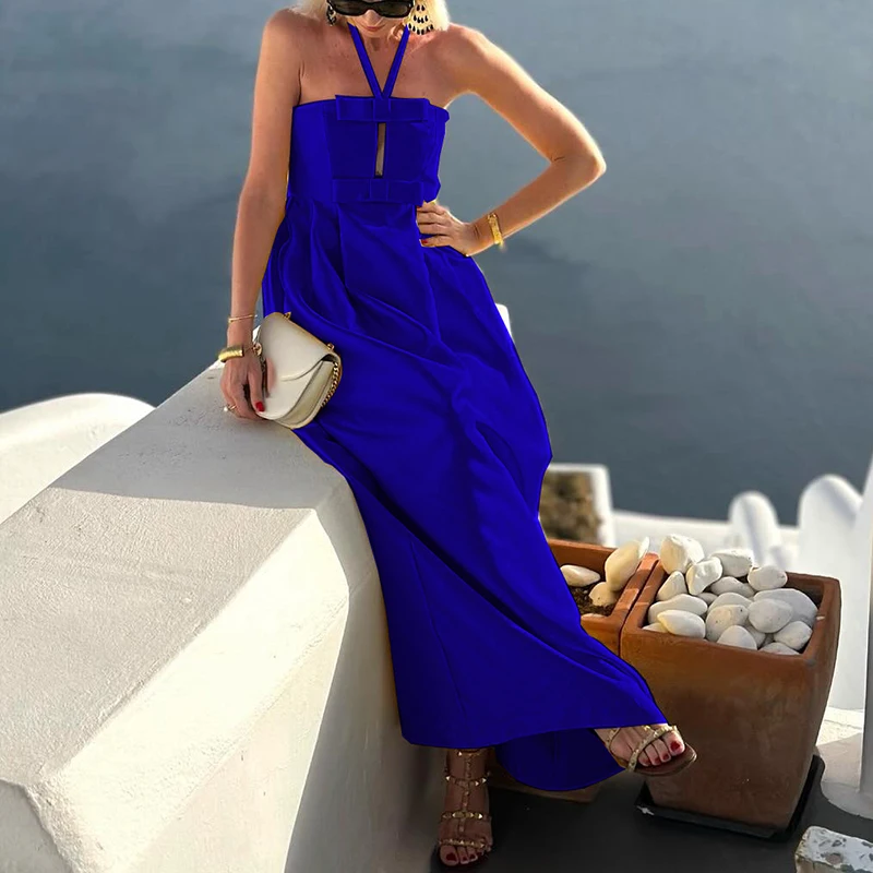 MQTIME - New Spring Summer Solid Pleated Dresses Women Sexy Hollow Halter Knot Long Party Dress Lady Sleeveless Backless Sling Maxi Dress