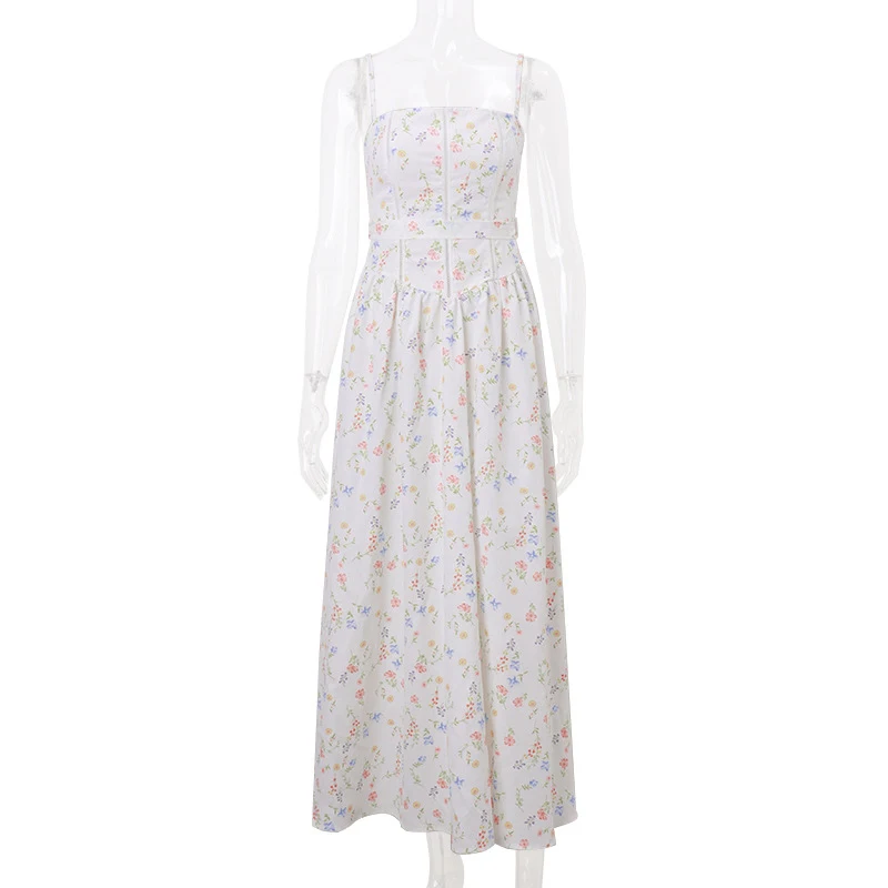 MQTIME - New Summer Off Shoulder Slim Strap Dress Garden Floral Print Fresh Sweet Holiday Dress Women Fashion High Waist Long Party Dress